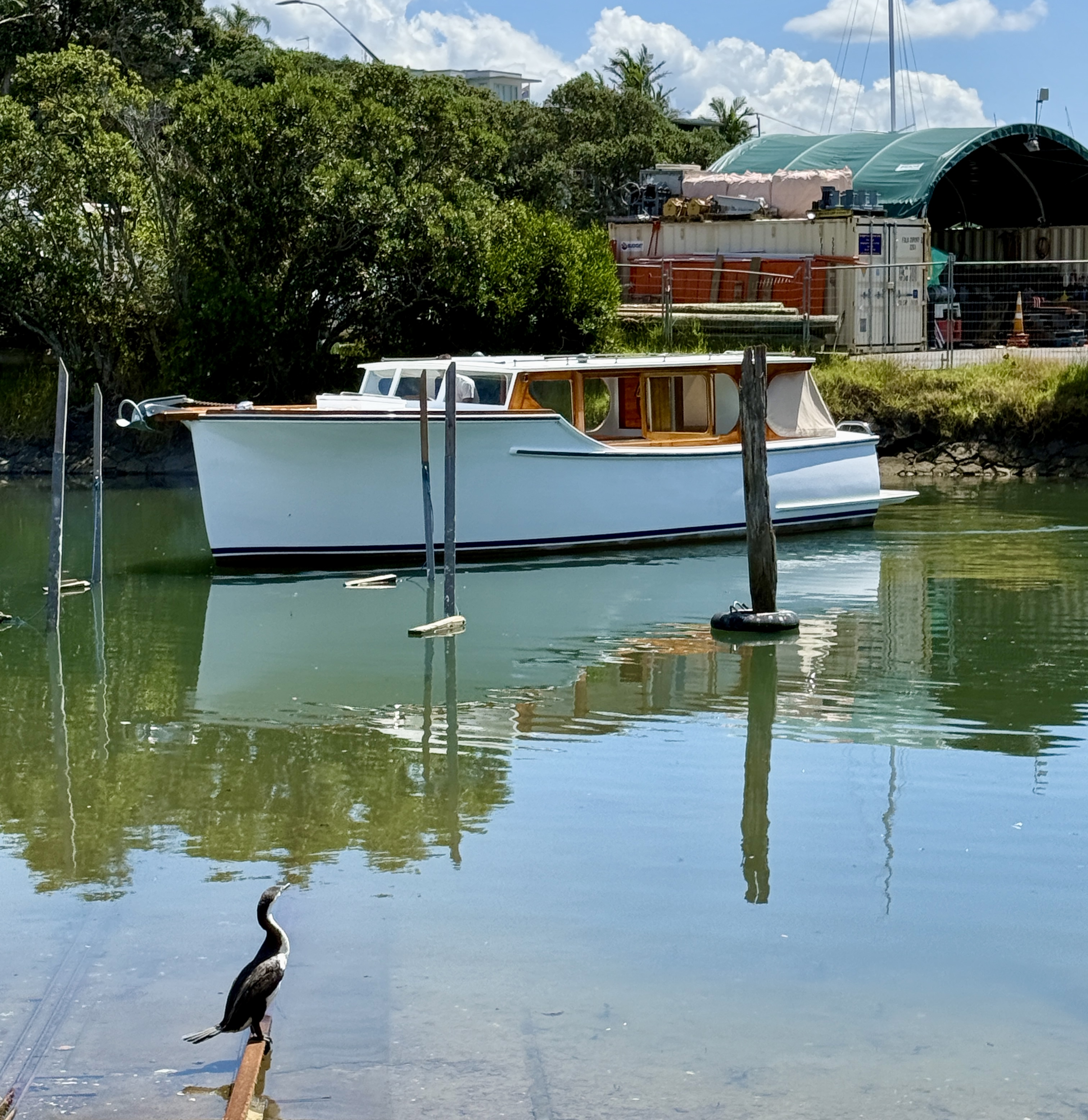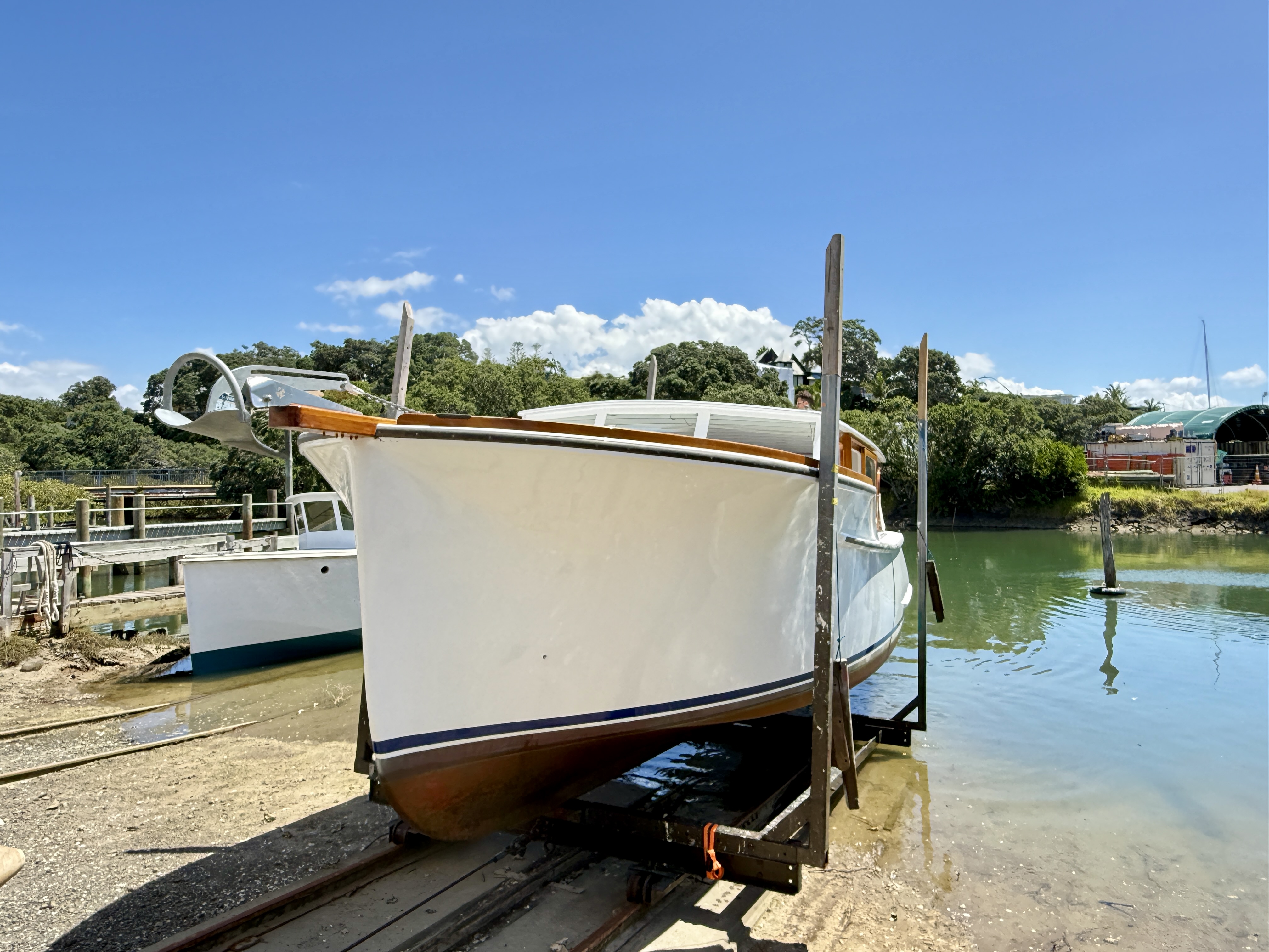 Dropped into the Slipway Milford earlier in the week and the timing was perfect – the Dick Lang built launch NGAHI was being hauled out for some TLC and system improvements.