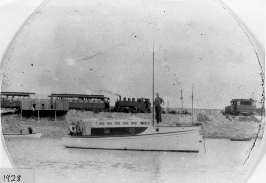 The photo is sometime between May 1924 and 26 April 1927. The locomotive towing the two passenger cars is No7 Takapuna Tram & Ferry Company the dates are when she entered service and when the trams ended. On the right is one of the three Baldwin steam locos.