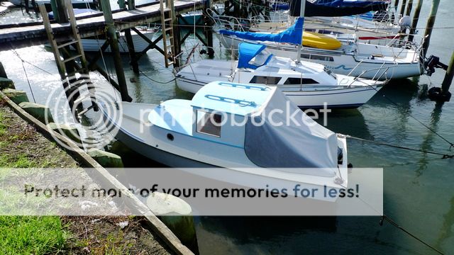 Feather is pretty nice inside and performs her function well as a fast day boat with overnight capabilities. She goes like the clappers and did a Vooom past us, going across the Bay one Saturday, that made us feel like we were anchored 🙂 .