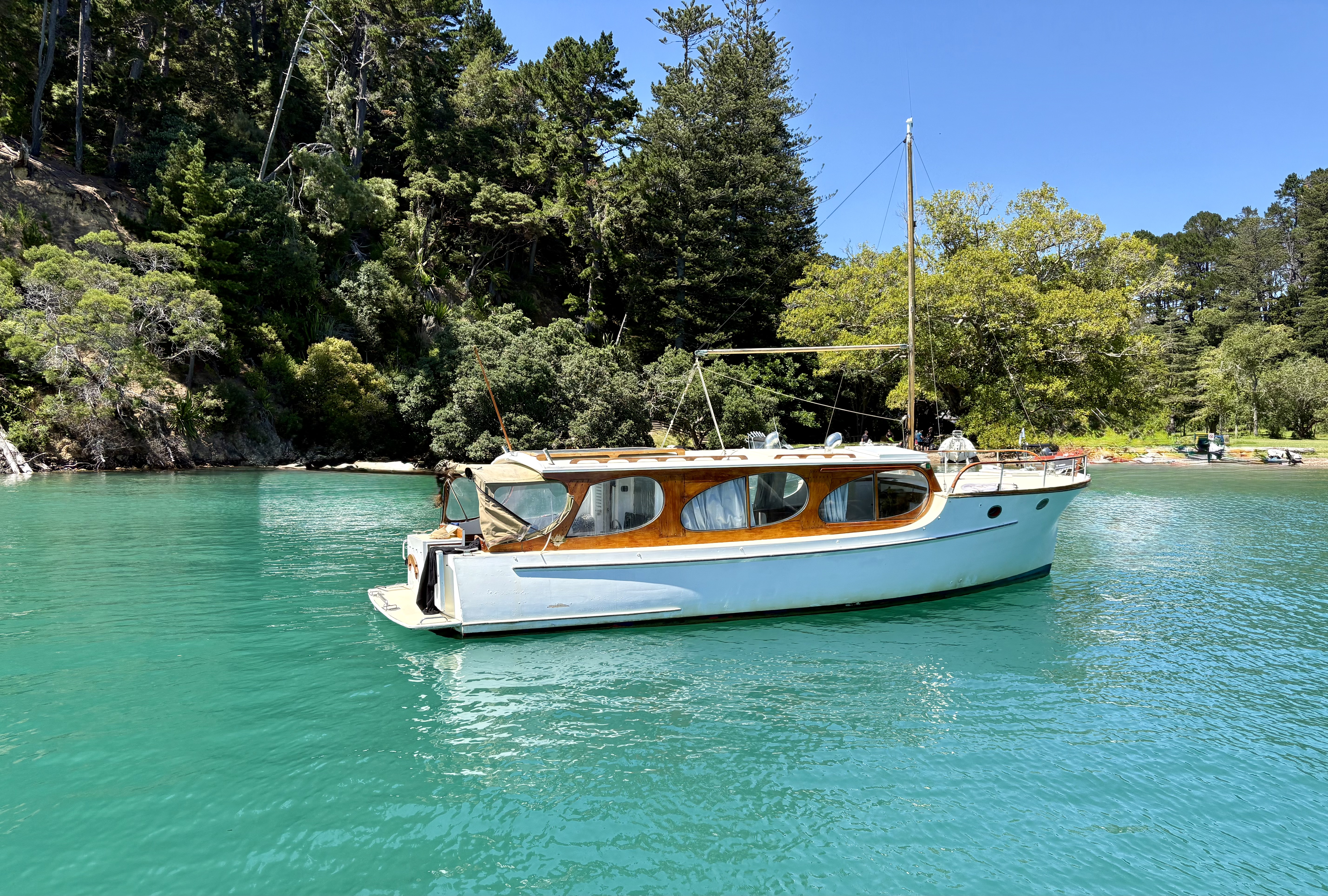 UPDATE FEB 2026 – at anchor in Bon Accord, Kawau Island. Photos ex Angus Rogers
