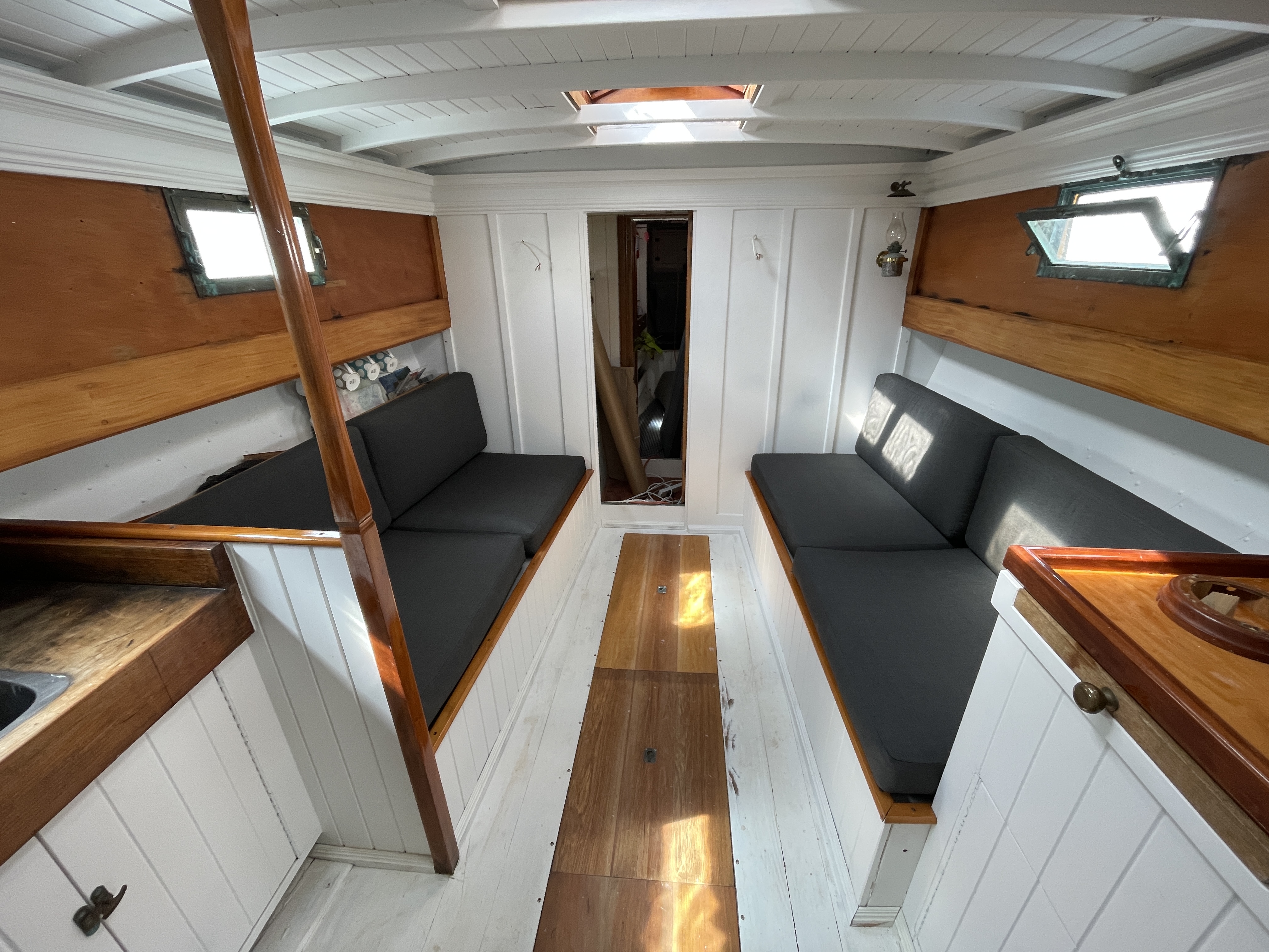 Mark sent in the above photos of Nereides showing her new cockpit covers & new Pohutakawa jaws he fashioned out of some knees George Emitage gave him. The photos give you a peek at the rest of the boat. I’m told Marks workshop is rather impressive 😉 The first 2 photos I took at Patio Bay several years ago & I included them to show off her lines.