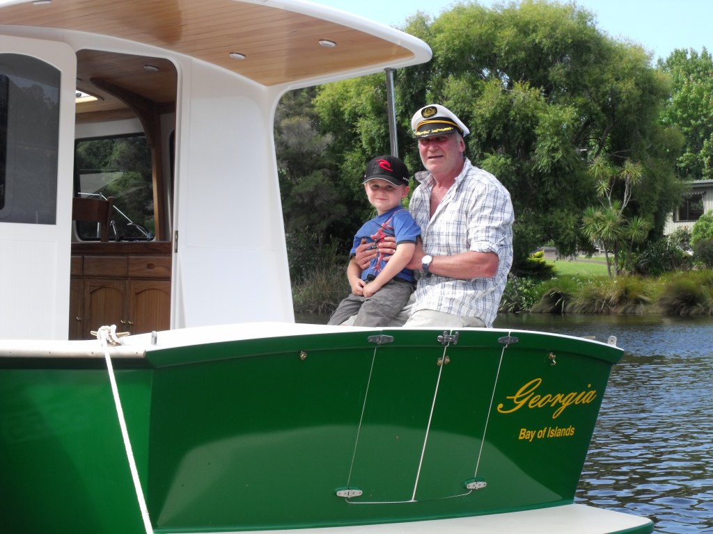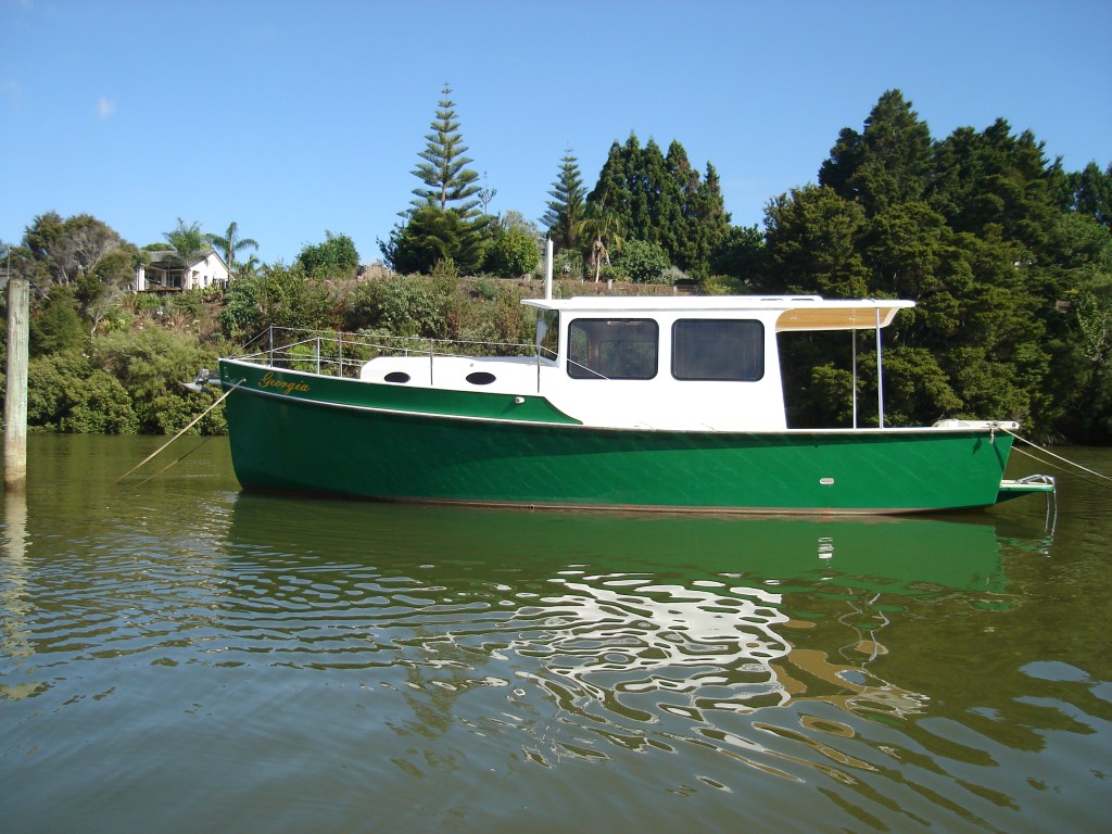 Georgia is a modified and lengthened (31’) version of a Trawler 28. Her hull is strip planked Malaysian kauri (Agathis flavescens) with bi axial glass both sides. Power is via a Beta 43 (a Kubota in drag) diesel. Georgia was launched in 2014. She is a very salty looking launch, would be nice to see more like her being built. Dean’s photo below.