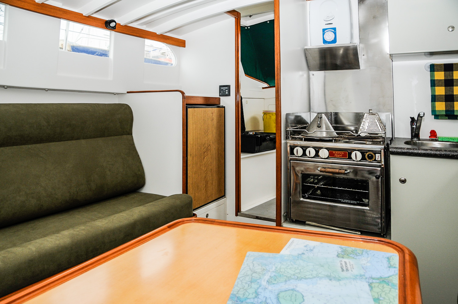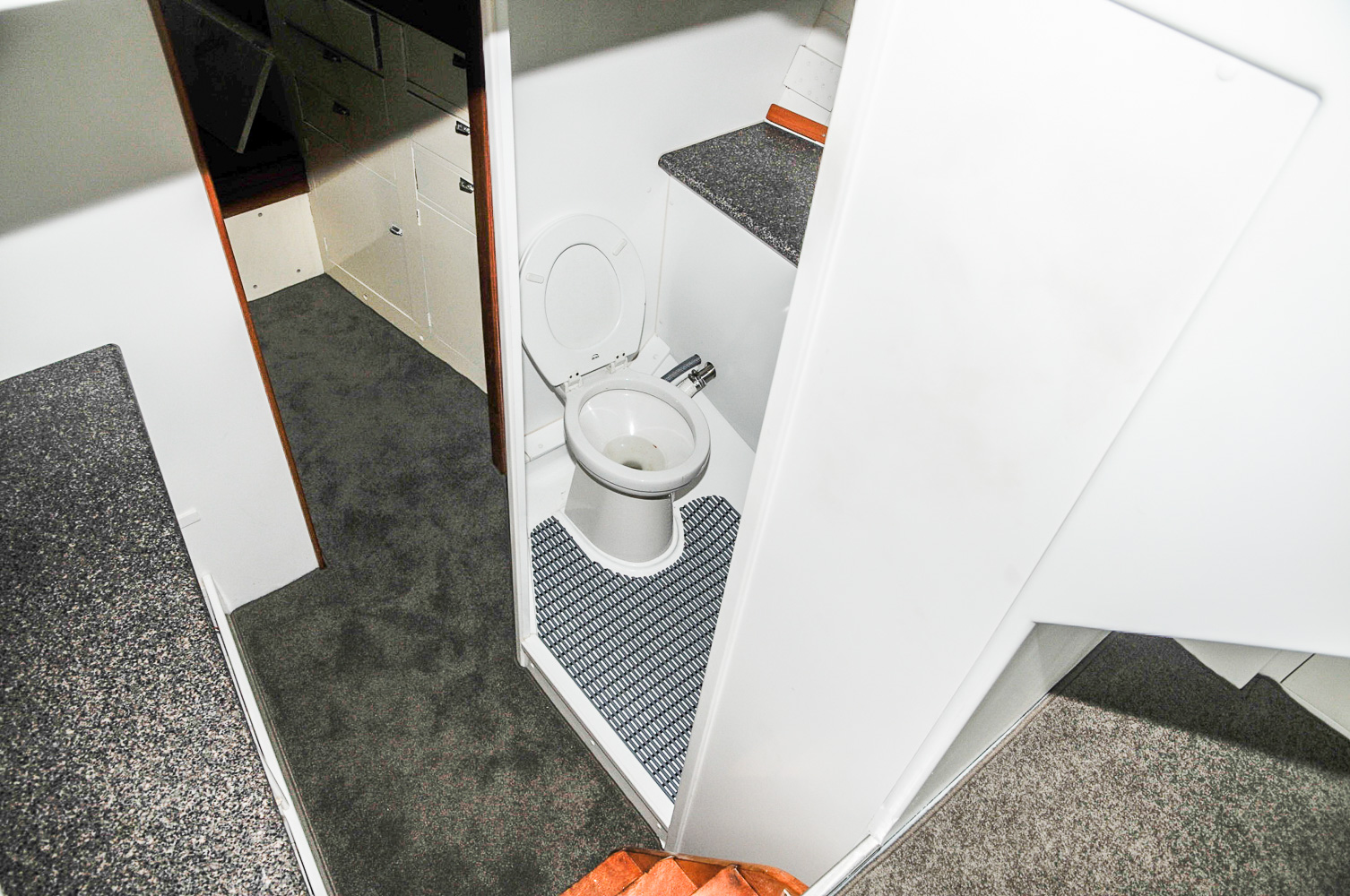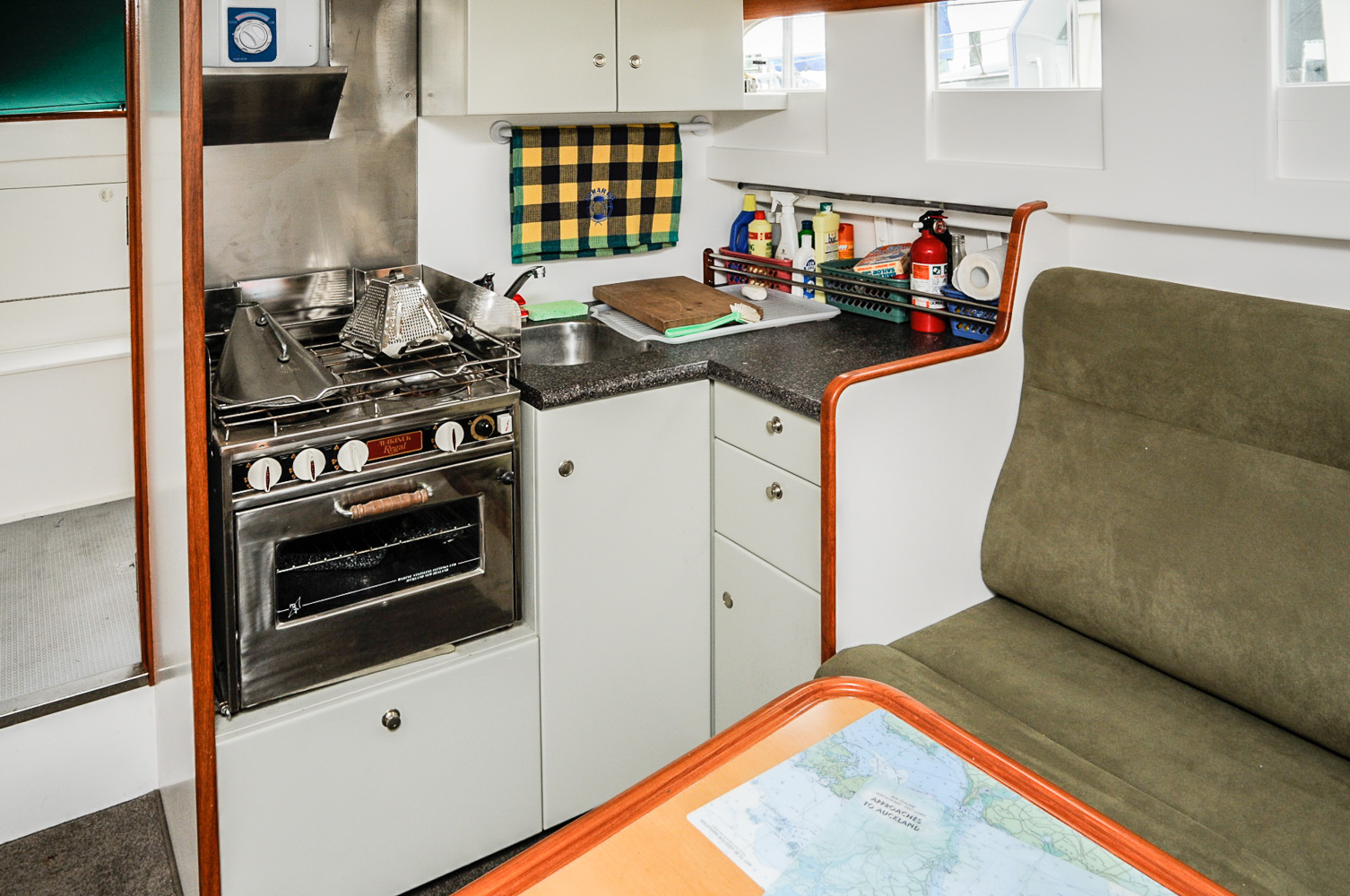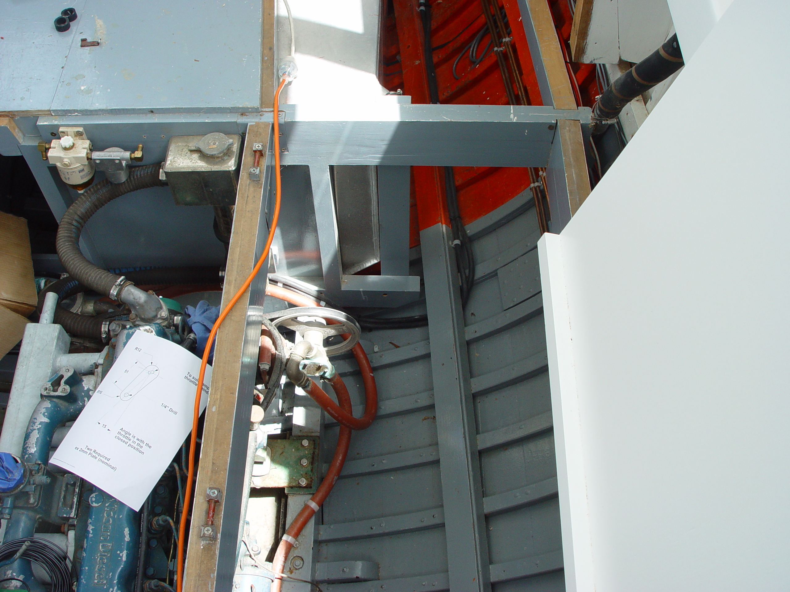 The galley was relocated from forward to the aft cabin. Two LPG cylinders were installed in a properly ventilated locker in the transom. A gas hot water heater was fitted to the aft cabin bulkhead and used to supply pressurised hot water to both the galley and toilet/shower area which now resides forward in the place where the galley had been.