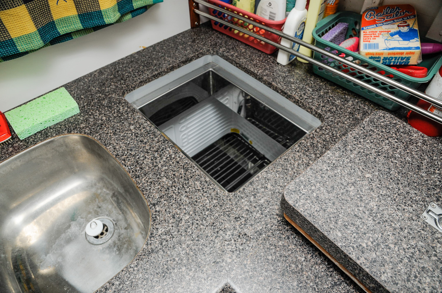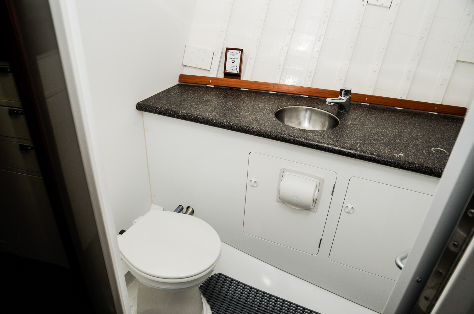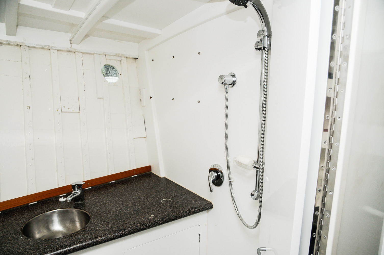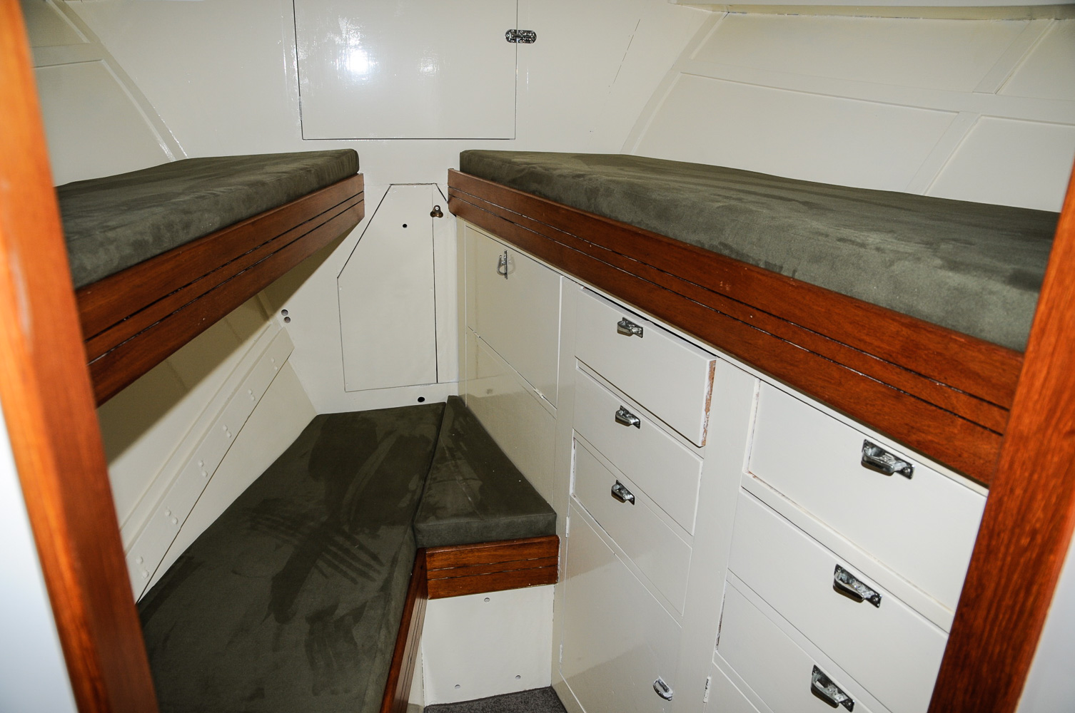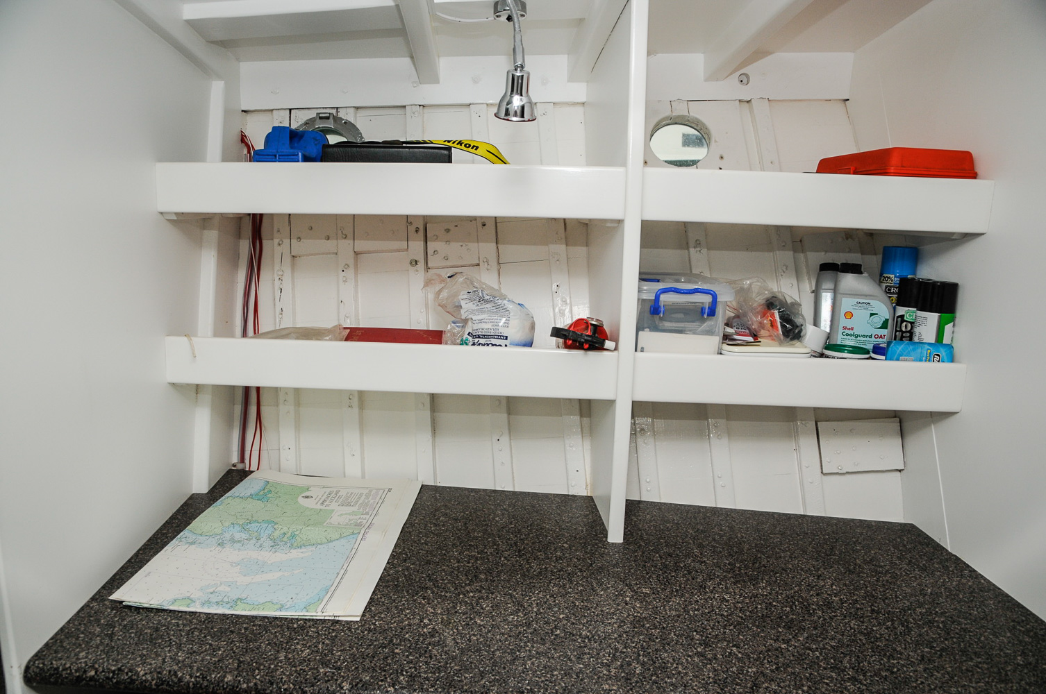 The galley was relocated from forward to the aft cabin. Two LPG cylinders were installed in a properly ventilated locker in the transom. A gas hot water heater was fitted to the aft cabin bulkhead and used to supply pressurised hot water to both the galley and toilet/shower area which now resides forward in the place where the galley had been.