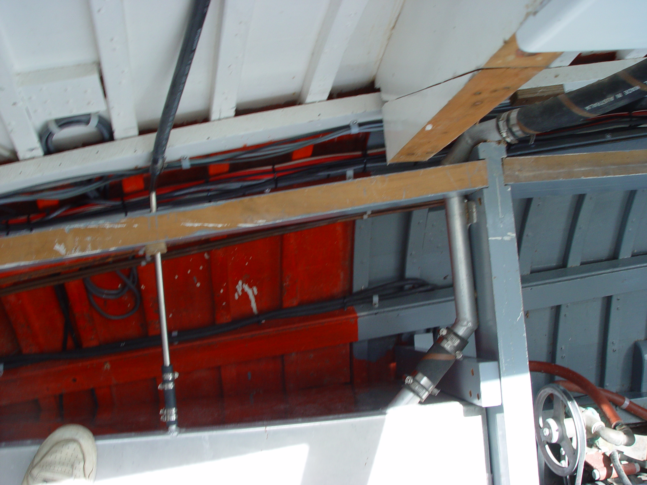 The evidence of the transom was that when Tamaroa had been first built the exhaust discharged through the transom on the port side. There was also evidence of a smaller exhaust along side the main exhaust suggesting she may have been fitted with a small auxiliary ‘popper’ engine of some kind. The original exhaust system was discarded when the two Scripps engines were installed. Instead each engine was equipped with its own ‘North Sea’ exhaust which discharged on both sides of the vessel at the water line. These employed large thin-walled bronze tubes fitted into the hull. I did not like these as they were old, had screw threads for securing nuts cut into them and most importantly, they had no seacocks.