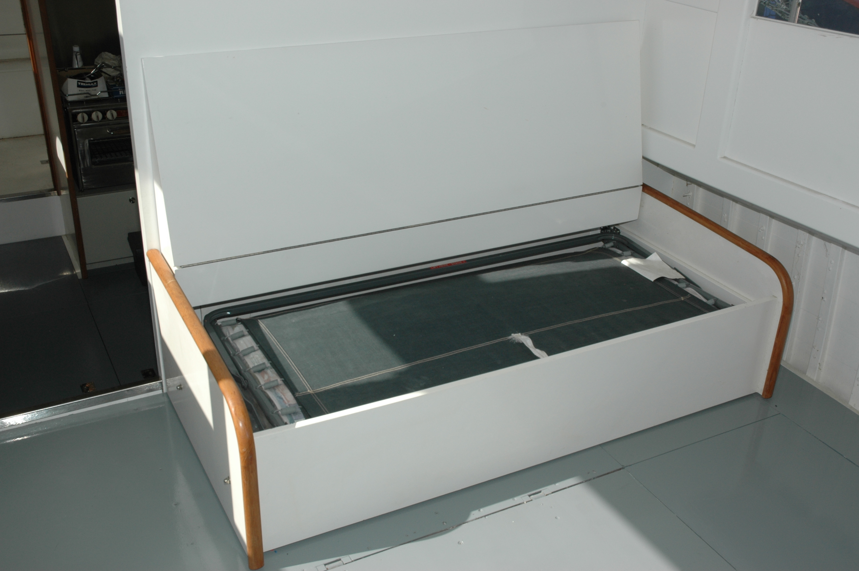 Apart from up in the bows, all of the furniture is new. It was all designed to be held in place by screws so that it could be removed without any cutting and hacking. I had most of this work done by freelance boat builders.