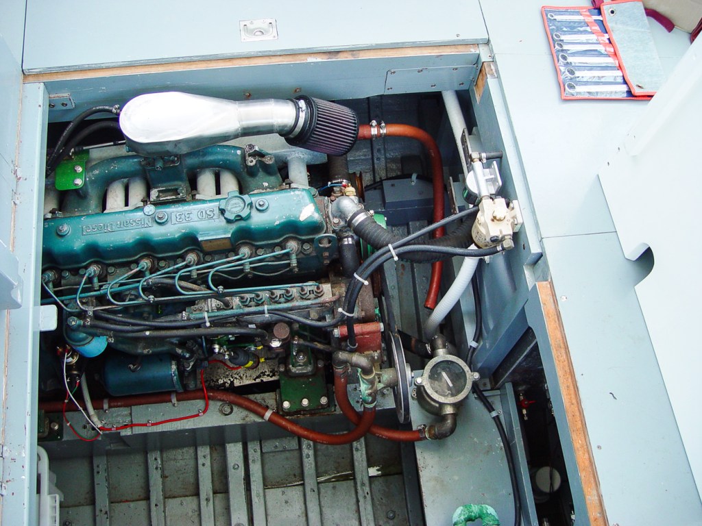 Tamaroa then passed through various hands until an Allan Brown bought her from a truck sales man whose name he can no longer recall. Allan Browne did not like the petrol engines and he started to convert Tamaroa back to the original diesel by replacing the port engine with a Nissan SD33 diesel engine. The Nissans come in a variety of configurations and this one was configured for industrial use in a forklift truck. For a time he ran Tamaroa with one engine diesel and the other petrol but not long before he sold it to me in 1998 he installed a second industrial SD33 identical to the first except that it had a slightly different flywheel housing.