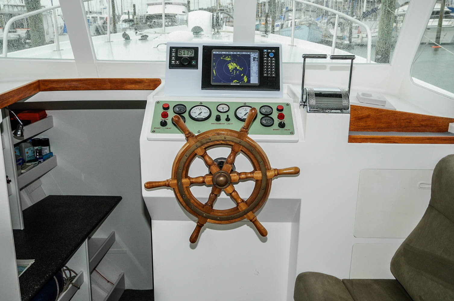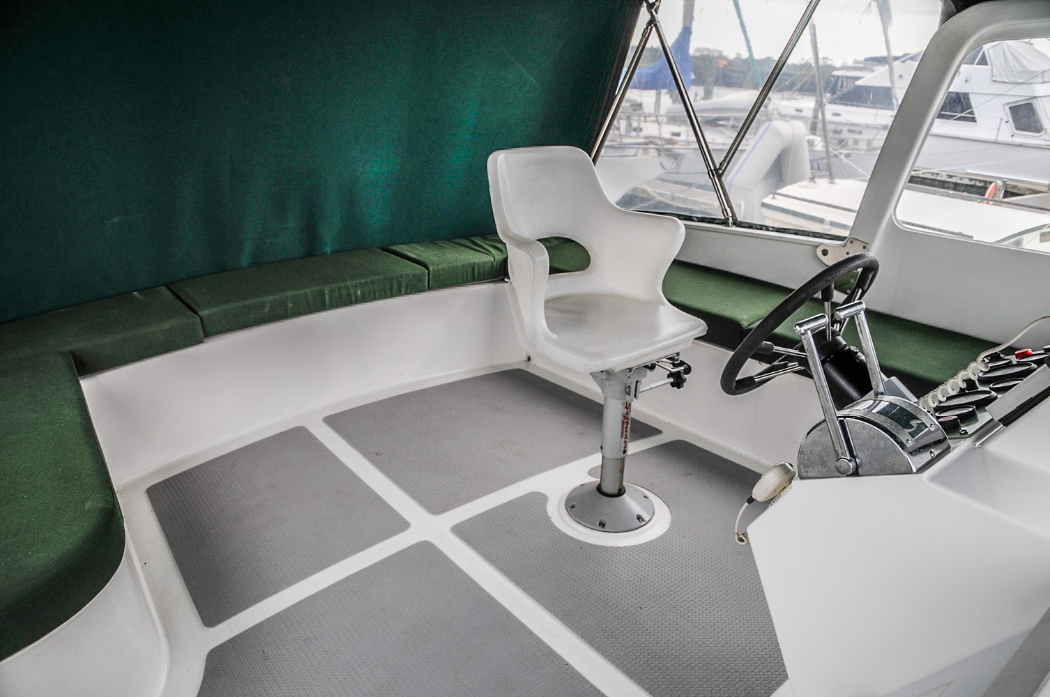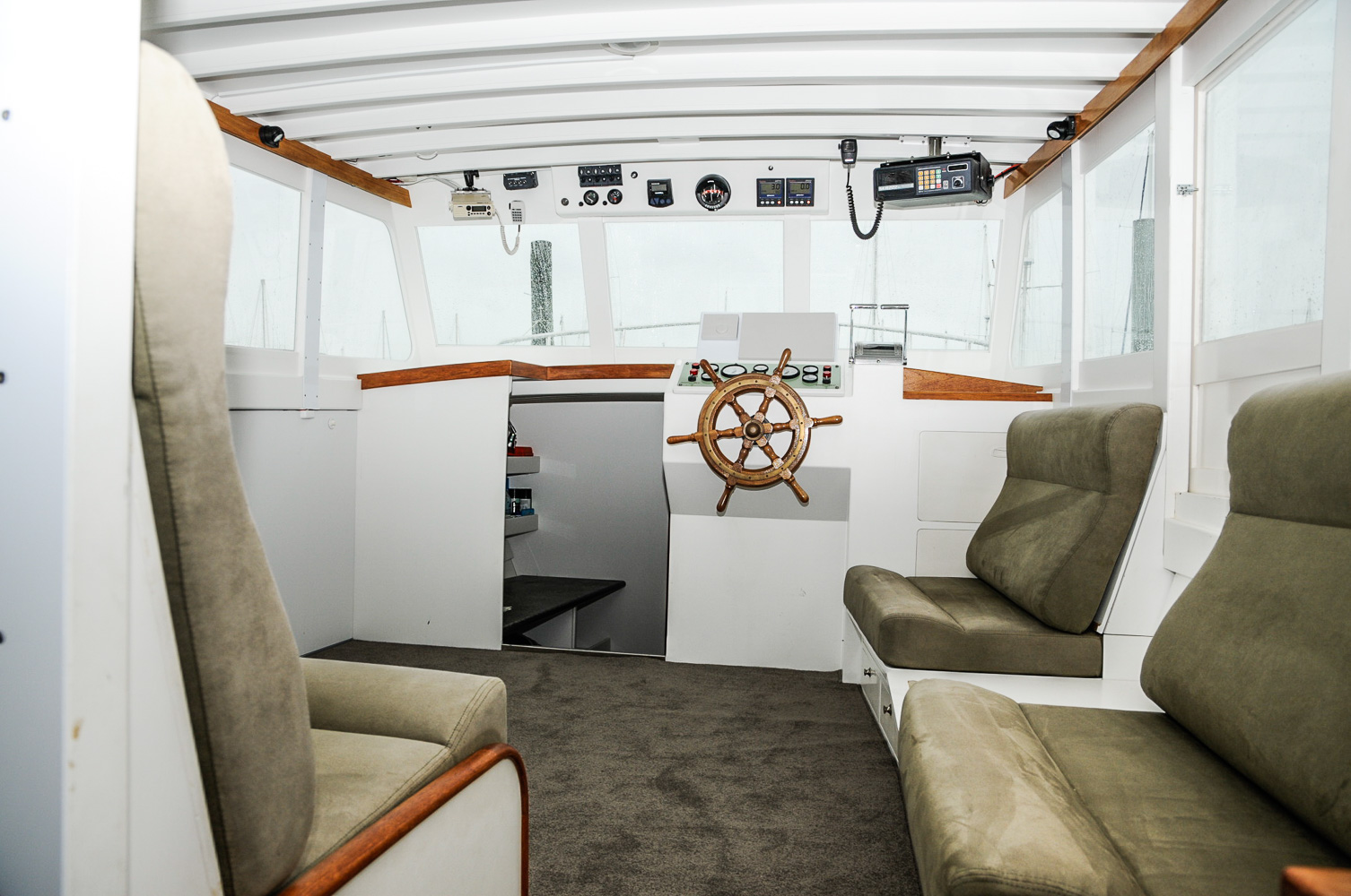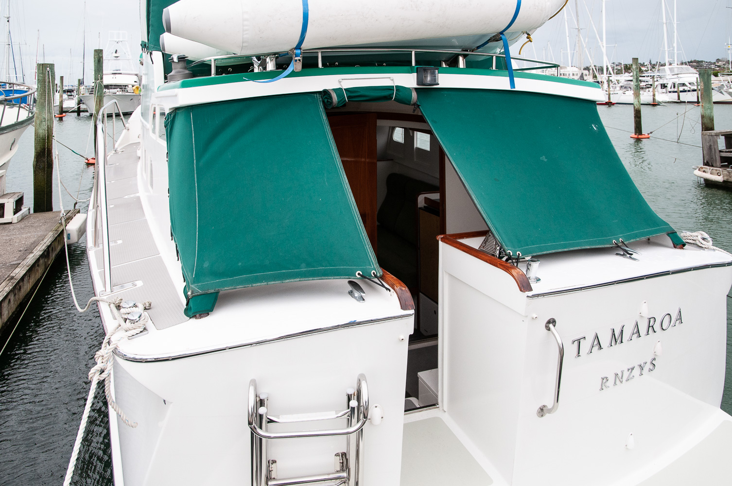 Before Allan Brown had bought Tamaroa an attempt had been made to install an external steering and control station on top of the aft cabin. This used cable steering and holes were bored through whatever part of the vessel got in the way of the cable’s passage. Allan Brown had replaced this with hydraulic steering with a rather crude linkage at the rudders. A windscreen and dodger had also been fitted. I totally rebuilt all of this during the refit. I also installed dual Simrad navigation, radar and plotter control stations.