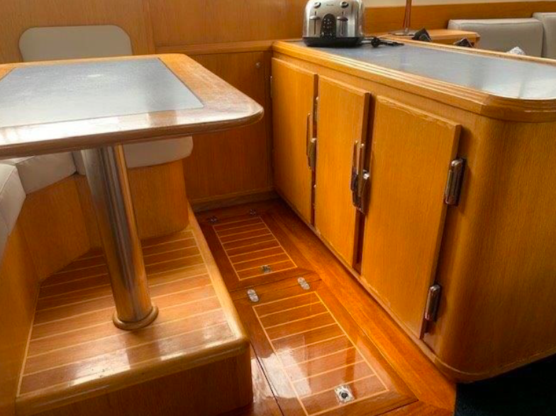 the wooden boat workshop did the million dollar white oak and ostrich skin interior fitout in 1996.designed by brad collet.