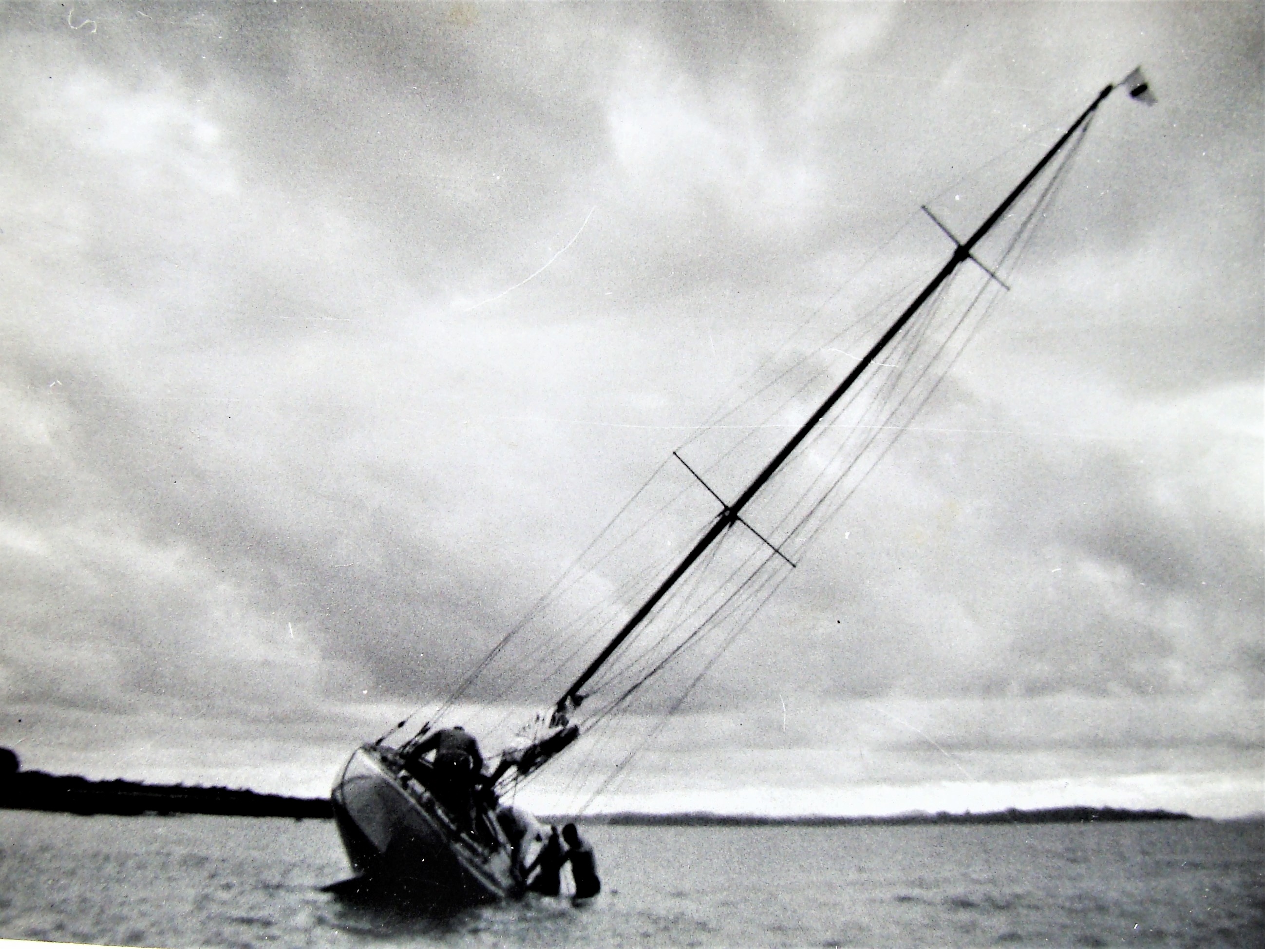The above two photos come to us from the camera of woody Paul Drake and I have Paul’s word that they are ‘never before seen’ photos of the yacht aground off Rangitoto Island in the early 1960’s. Paul was a teenager at the time, staying with a school friend and his parents in their Rangitoto bach. They spent their time messing about in the family’s seagull powered clinker dinghy and came across the ‘wreck’ by chance. They rendered what assistance we could. Paul commented that the crew seemed quite relaxed about their predicament and no doubt she came off with the next tide.