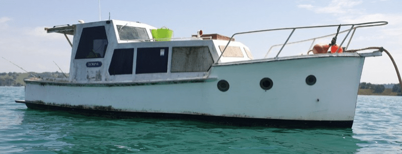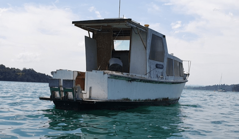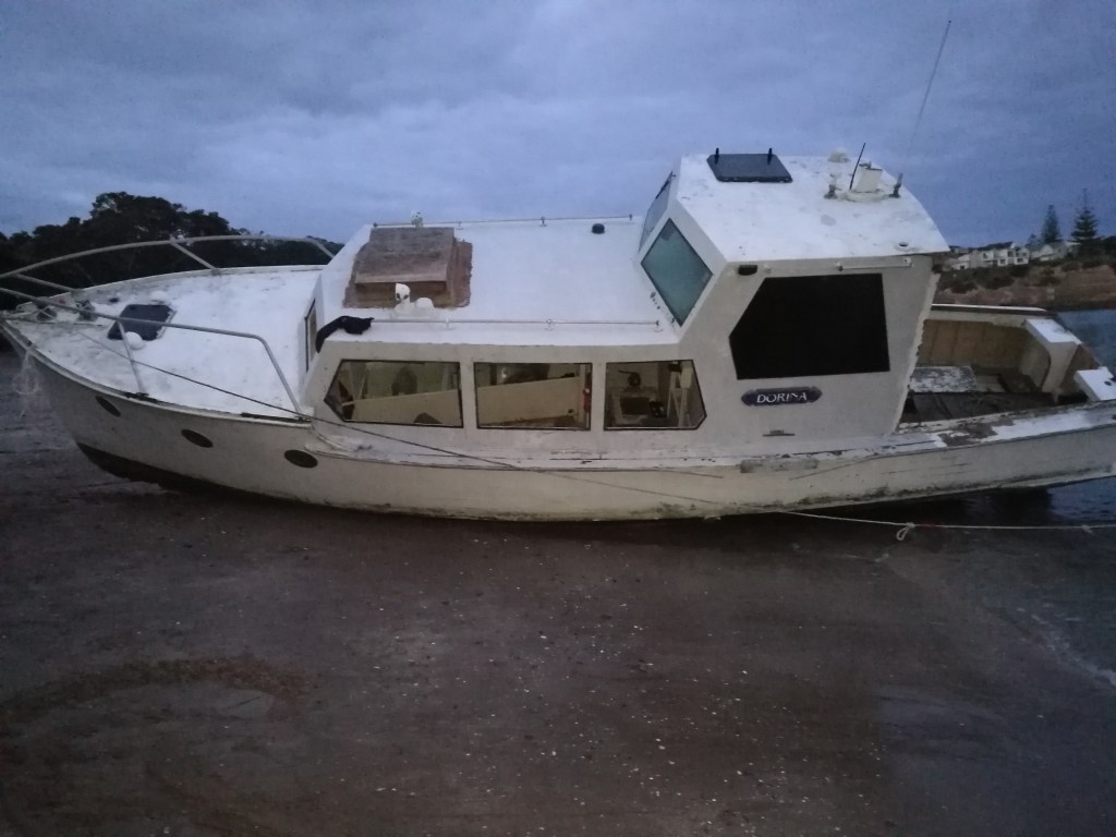 The Back Story ex Ken Ricketts “She had recent new owners who a couple of weeks ago were taking her to her new home at Te Atatu. When they got to Whangaparaoa they realised they would not have enough fuel to get them to Te Atatu, so seeing Little Manly, in a nice calm state, at that time, decided to anchor there overnight, whilst they procured more fuel, and were to intending to continue to Te Atatu the following day. However during the night a southerly storm blew up and she took in water over the stern because the stern door was left open, sank. She was then beached at Little Manly, to be pumped out.