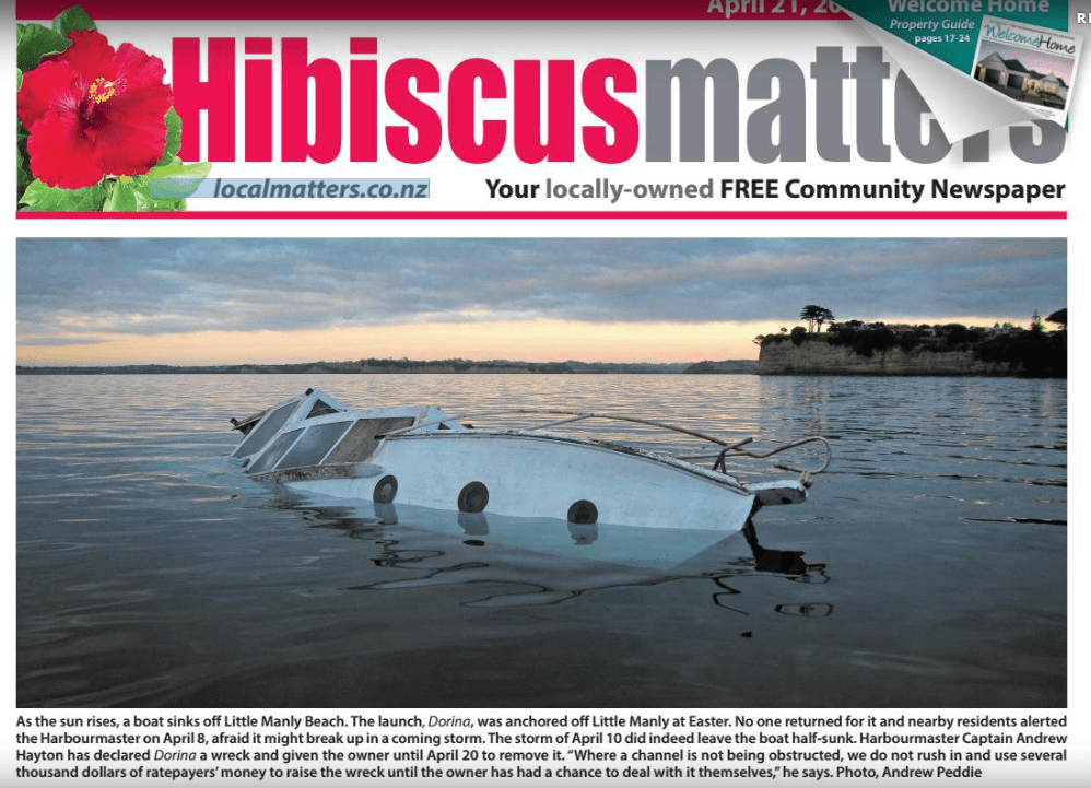 Update – I was sent a copy of the front page of last weeks Hibiscus Matters’ by a WW reader named Viviene, a local newspaper the covers the area referred to locally as the Hibiscus Coast.Seems the boat is called Dorina and has attracted a lot of attention. As the paper states and confirmed by John Bullivant – The launch is/was apparently Dorina , and recently sank at Little Manly on April 10th. It was anchored off little Manly over Easter but apparently no-one returned for it. The owner was given till the 20th April to remove it, as the Harbourmaster had declared it a wreck. Don’t know how it was removed or what happened to it . It was on the front page of the Hibiscus Matters local paper on April 21.