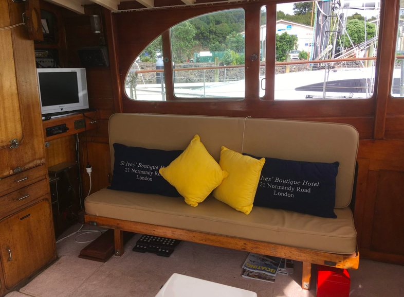 Thanks to a heads up from Glenn Martin and a tme listing we get to have a peek down below on the 1955, Lanes built, 45’ bridge-decker – Thetis.