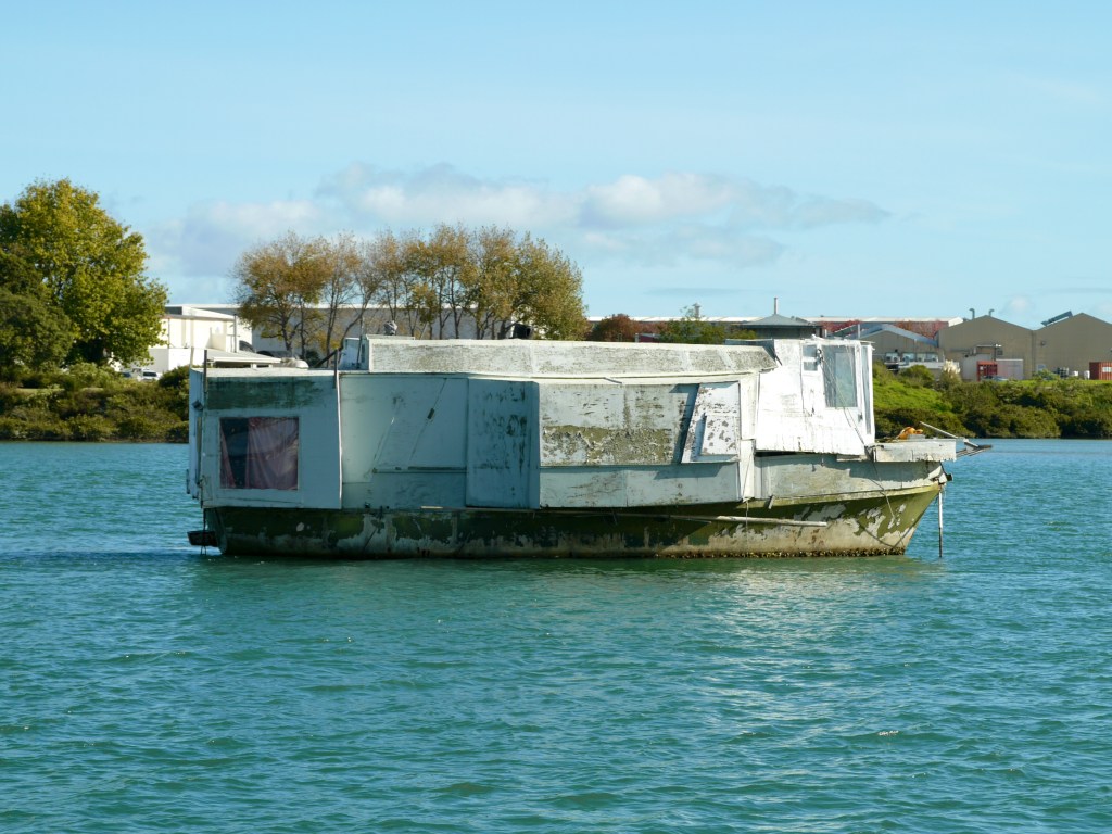 Regarding houseboat, Tamaki River…..”Concretia” has been on the Tamaki for well over 20 years. Used to be down on the piles opposite PBC and other swing moorings. There were always interesting small canoes, sailboats tied alongside. Also, a long drop toilet was built over the stern.