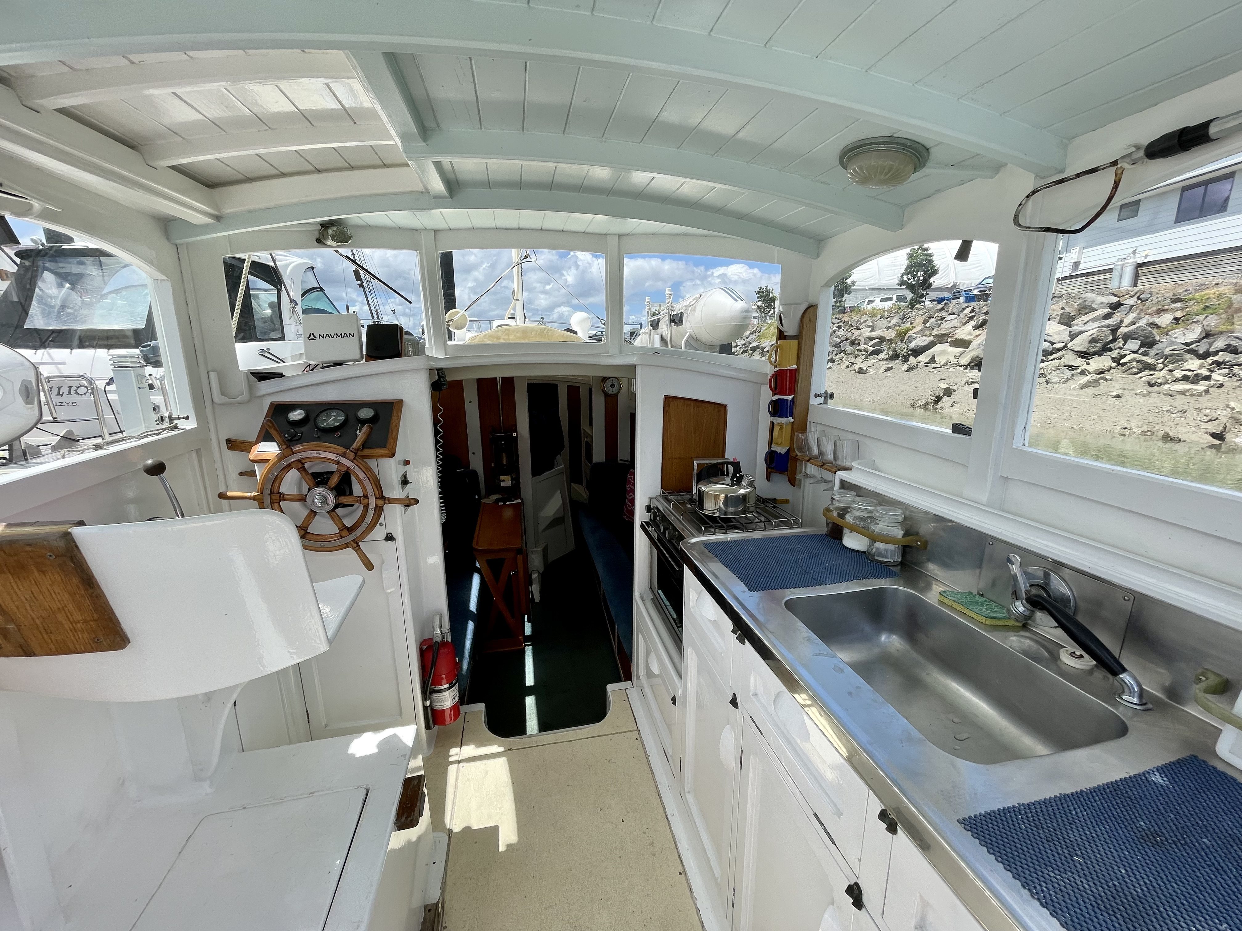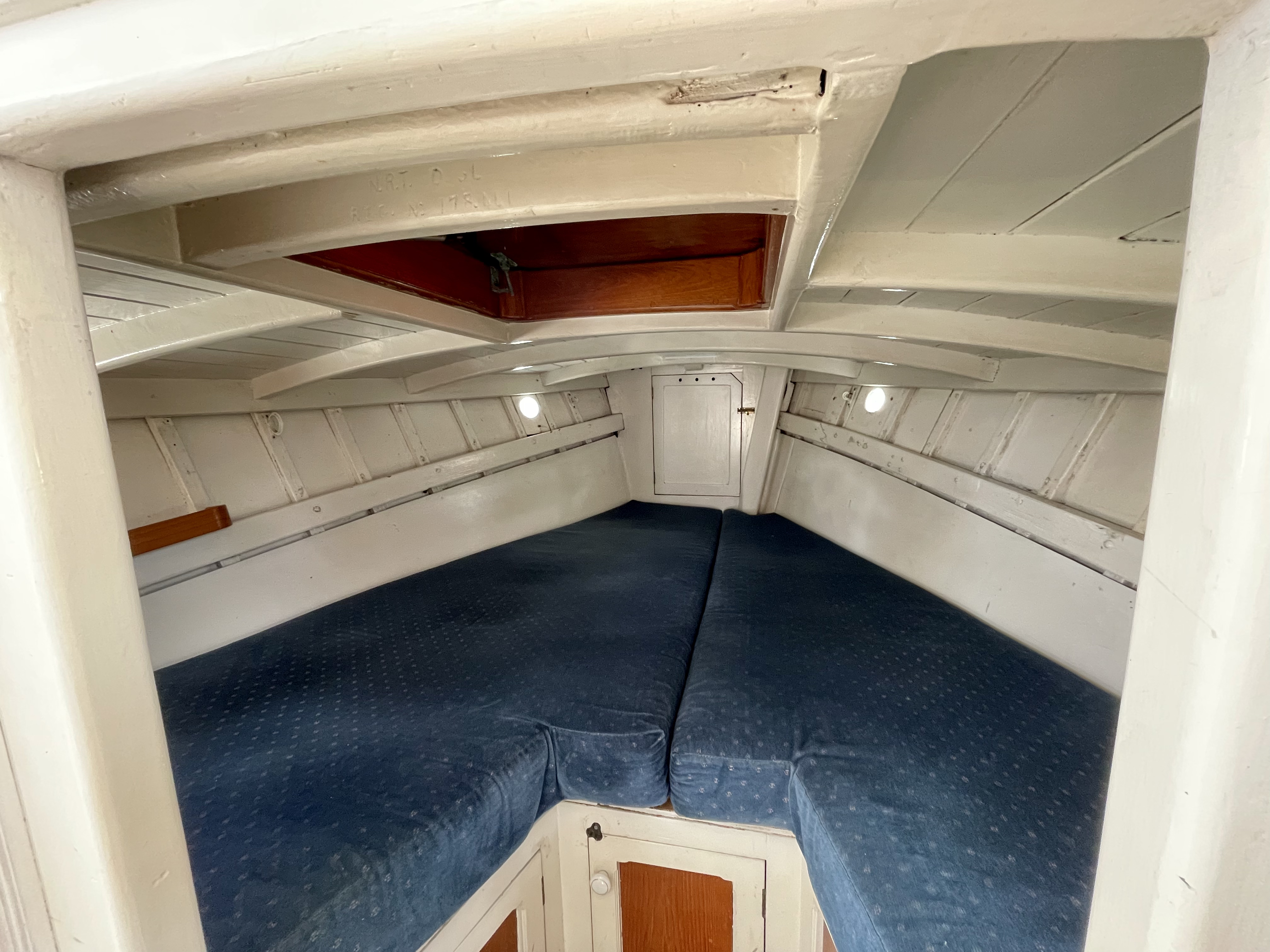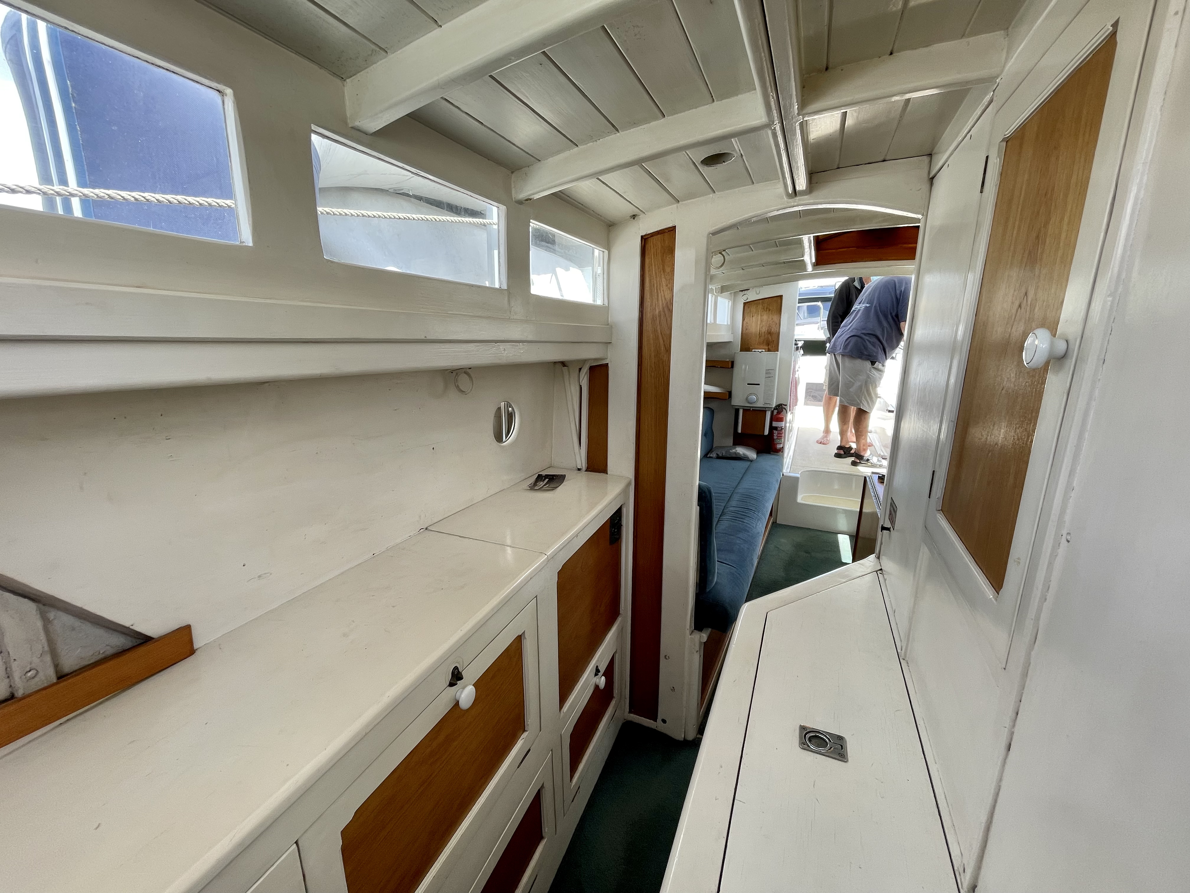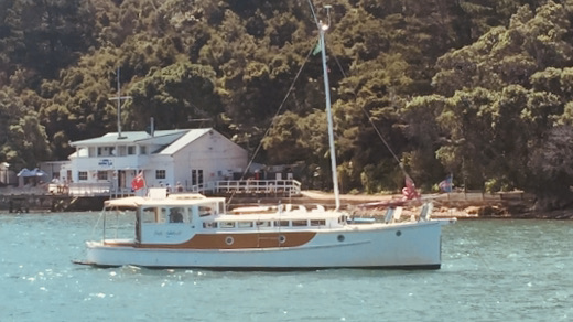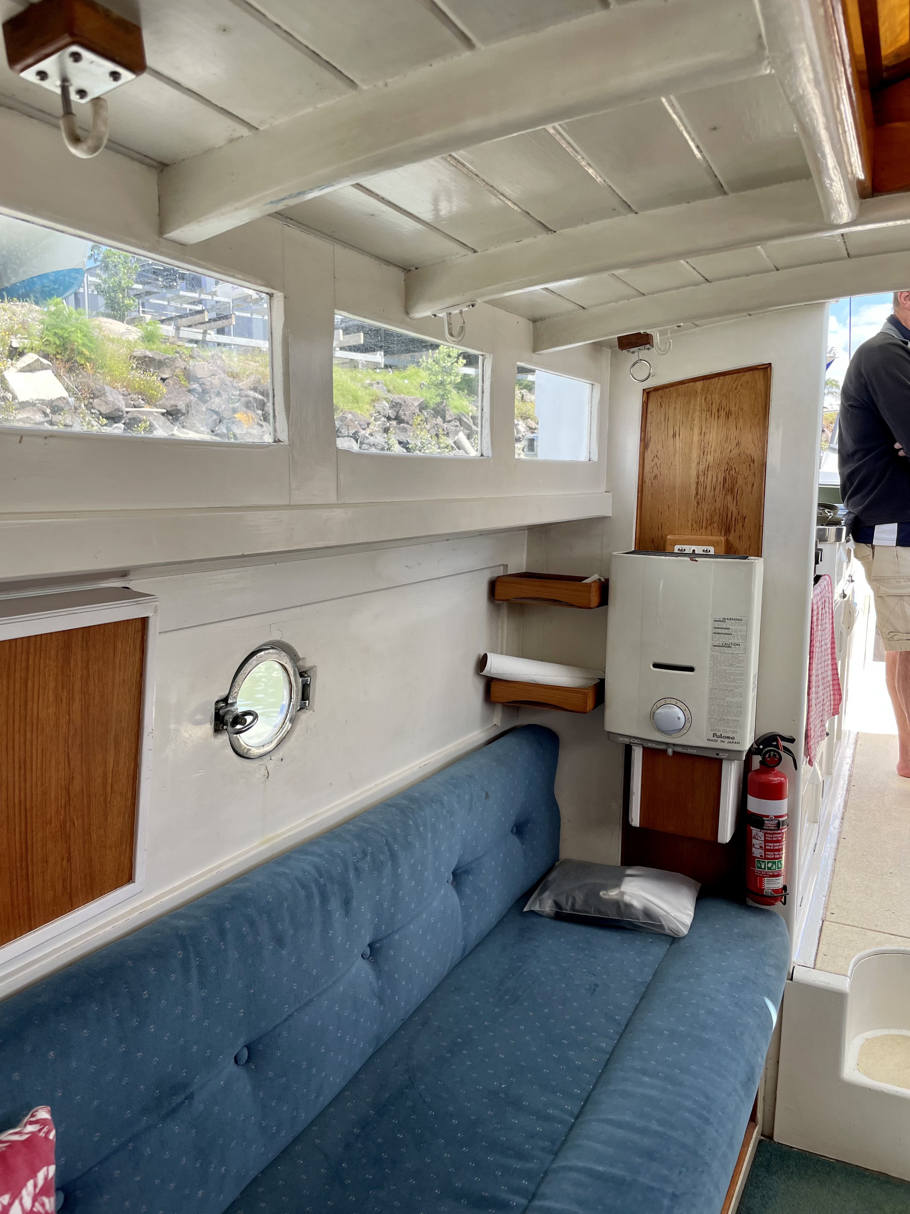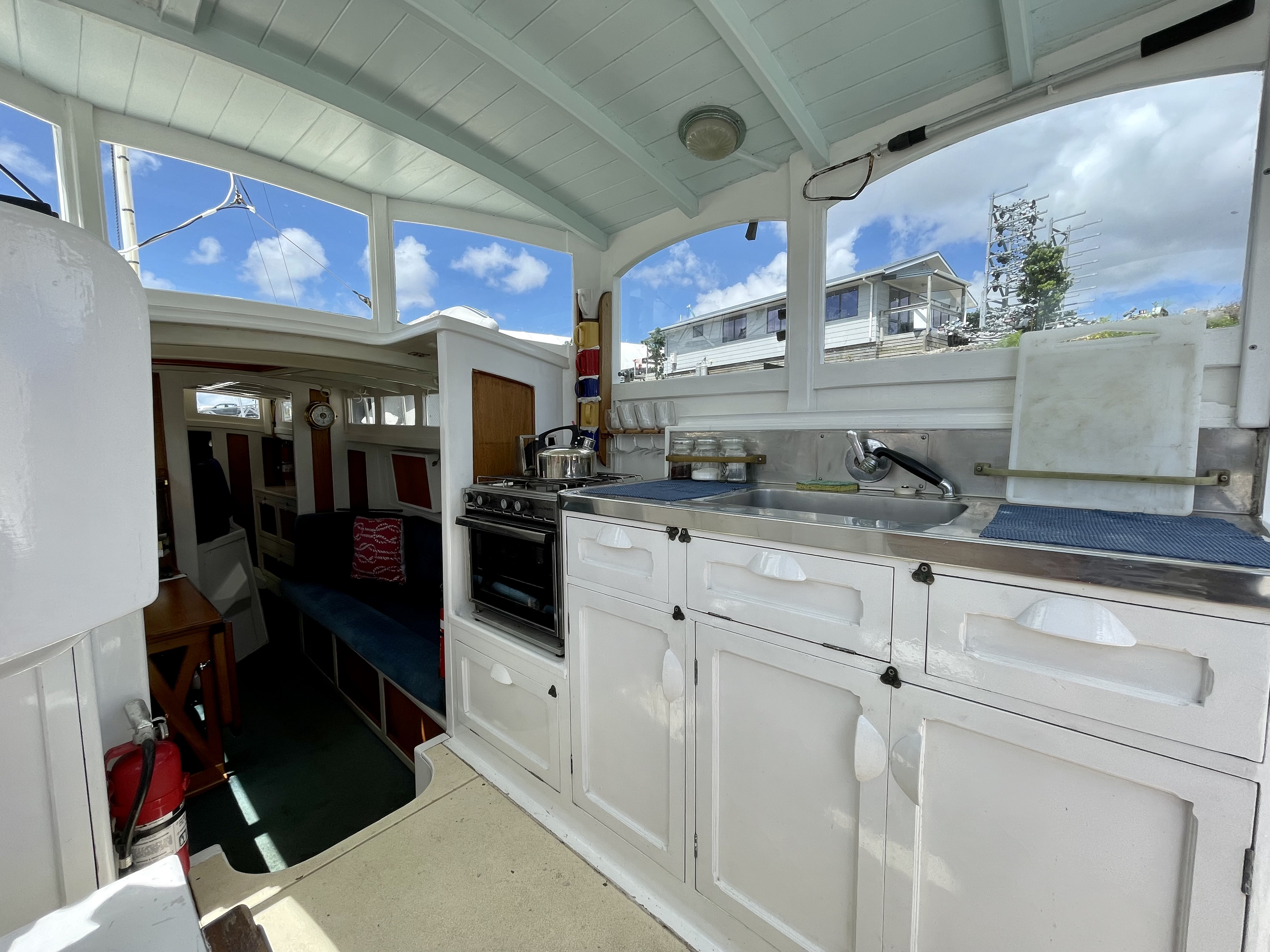 Built by Dick Lang in 1922, she is kauri carvel planked, and back in 2000 Kerry splined and glassed the boat, so maintenance is minimal. LOL is 36’ (35’ LOW), beam is 8’ and she draws 3’. Power is from a Ford 70hp, 3 litre diesel, installed new in 2000. Top speed is 10 knots, but cruises all day at 8.2knots, with a fuel consumption of 7L an hour.