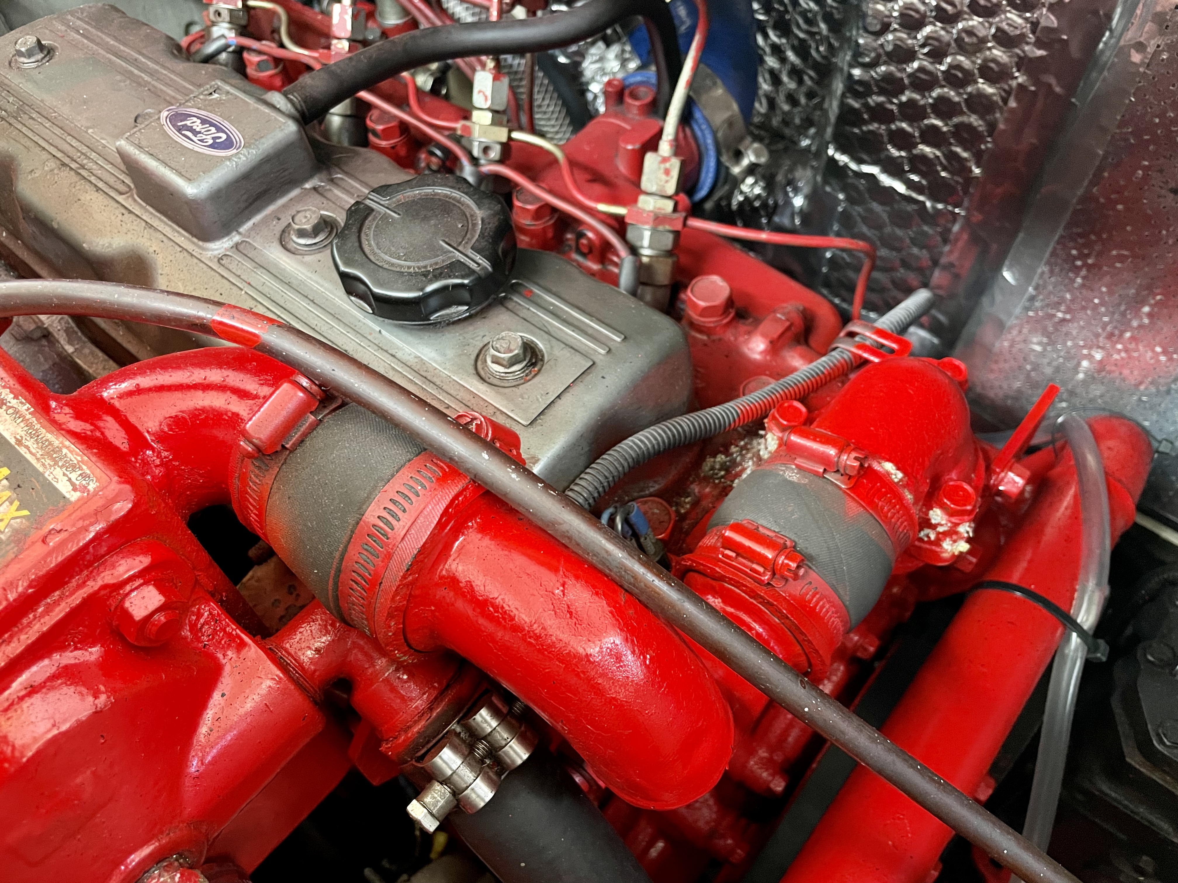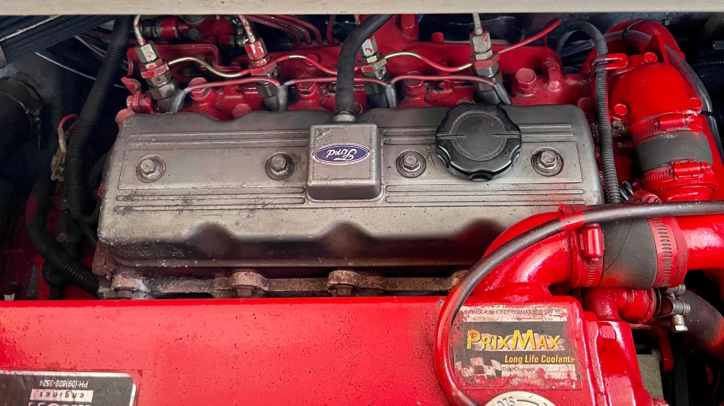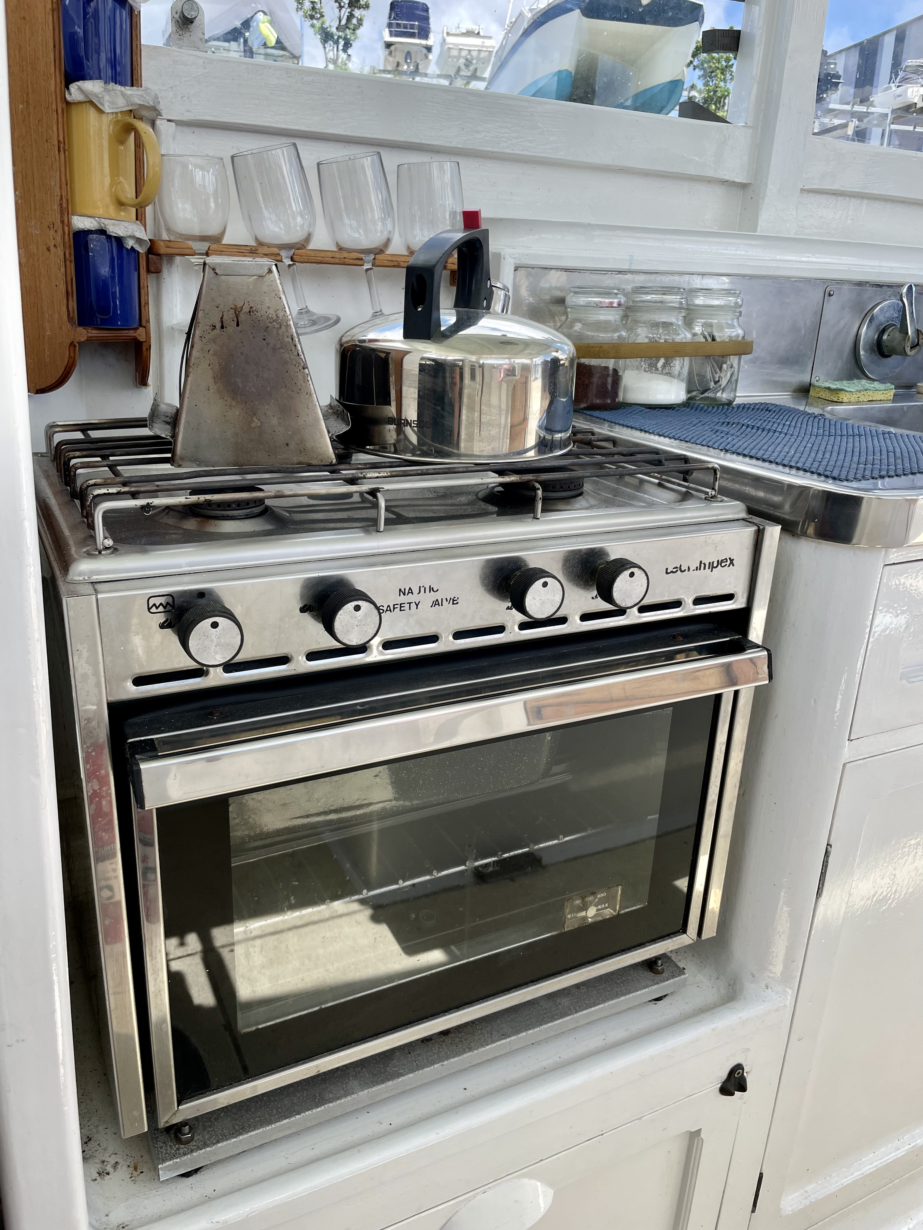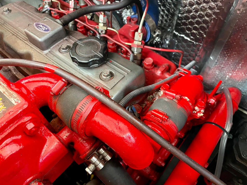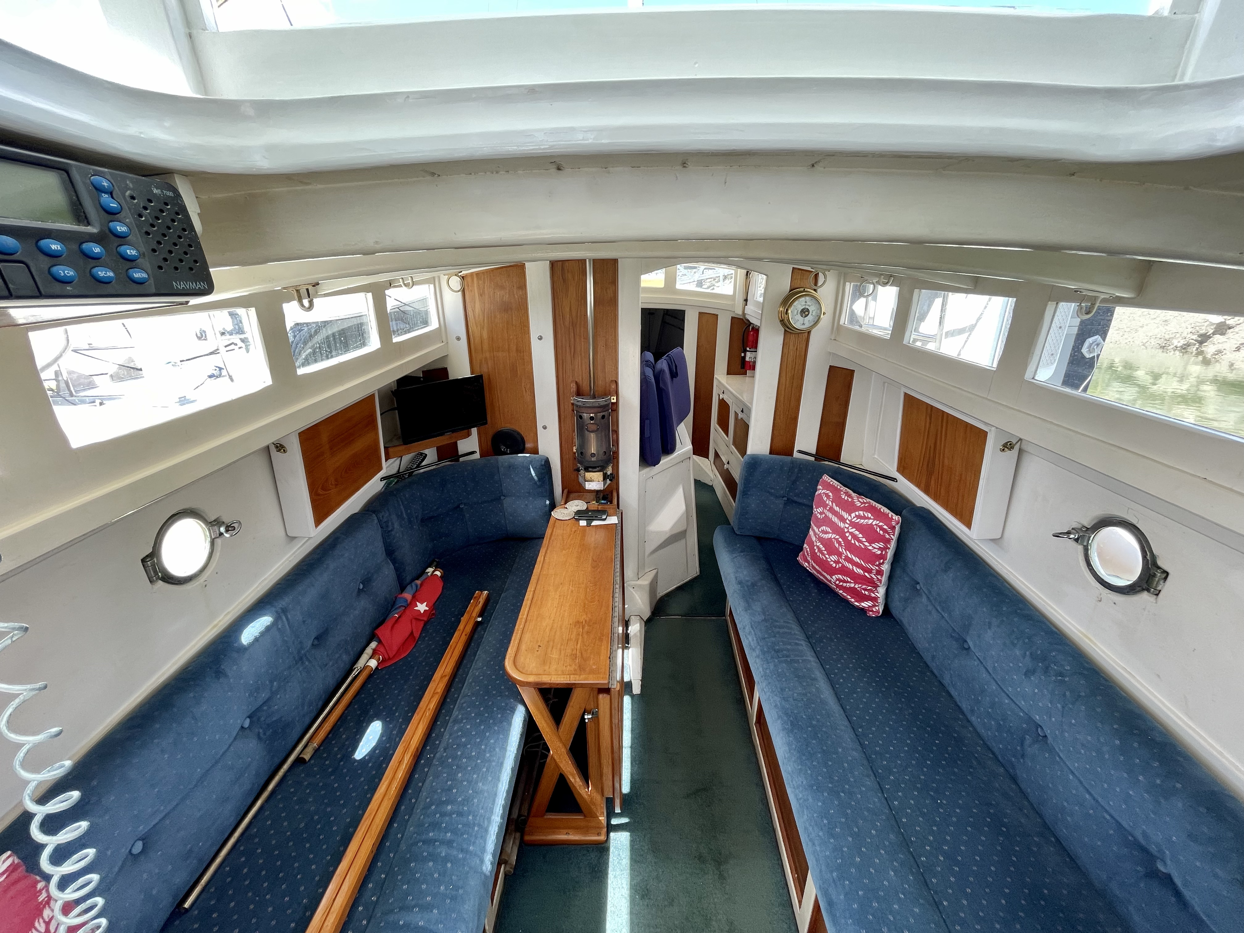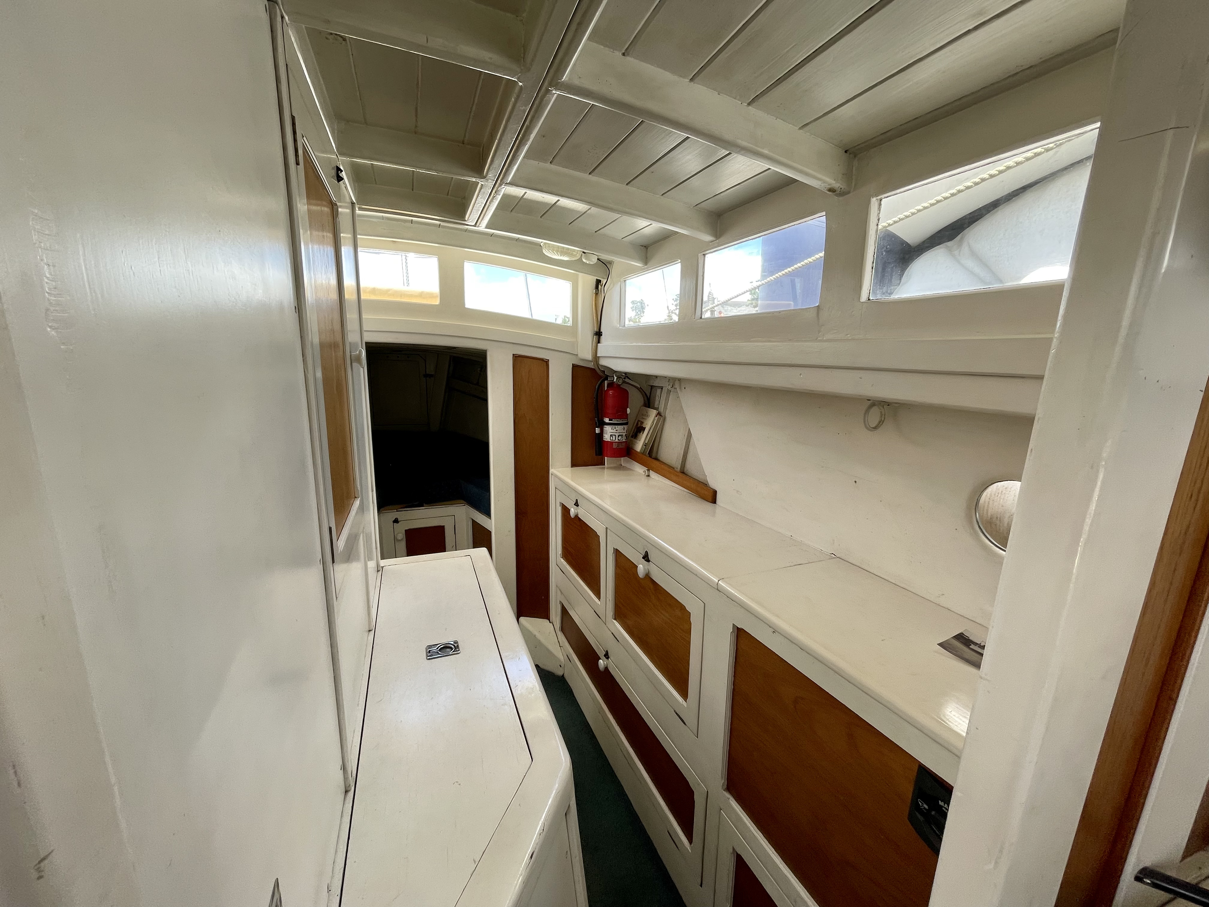 Built by Dick Lang in 1922, she is kauri carvel planked, and back in 2000 Kerry splined and glassed the boat, so maintenance is minimal. LOL is 36’ (35’ LOW), beam is 8’ and she draws 3’. Power is from a Ford 70hp, 3 litre diesel, installed new in 2000. Top speed is 10 knots, but cruises all day at 8.2knots, with a fuel consumption of 7L an hour.