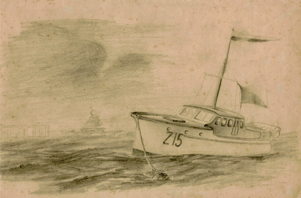 24-02-2022 Input ex Scott Taylor – Scott sent in the sketch and photo below of his fathers (Mac Taylor) time spent on Rehia on boom patrol during the WWII, Mac drew the pencil sketch of which Scott has the original.