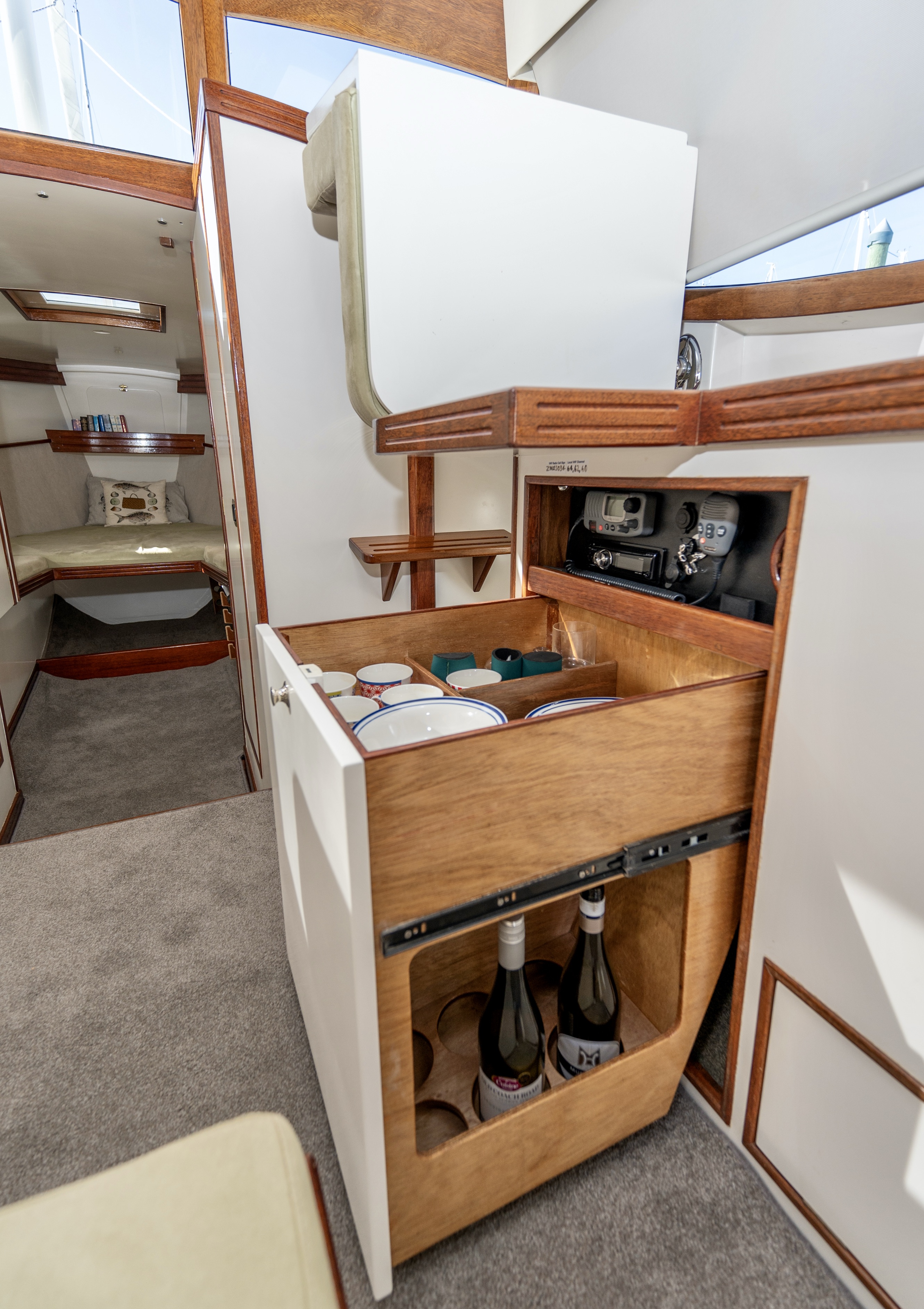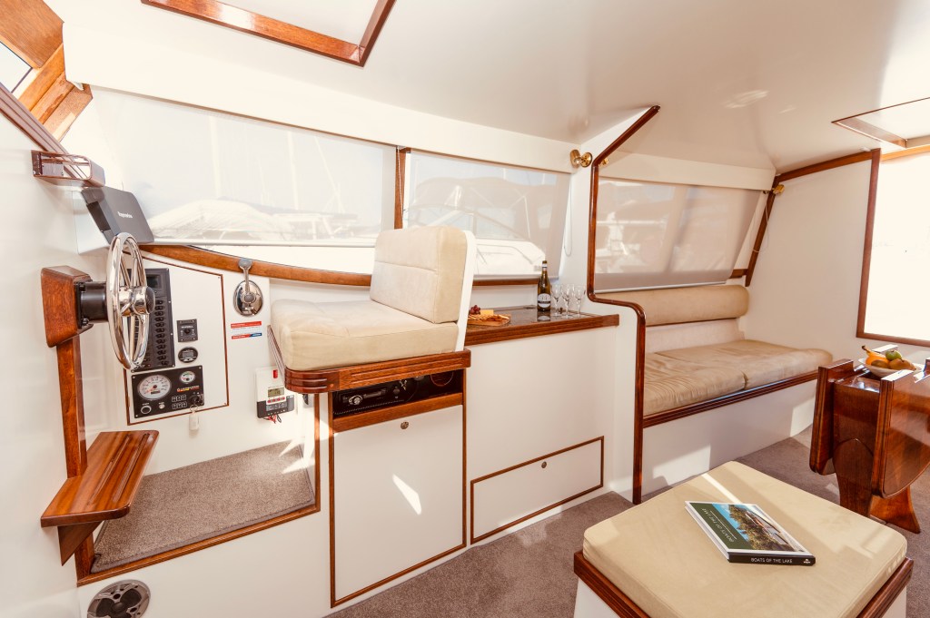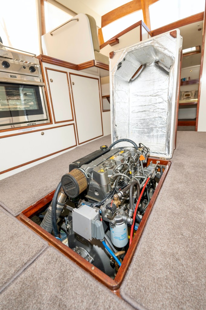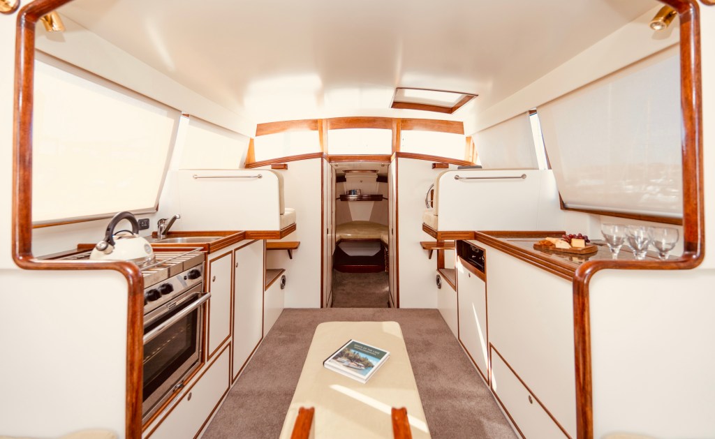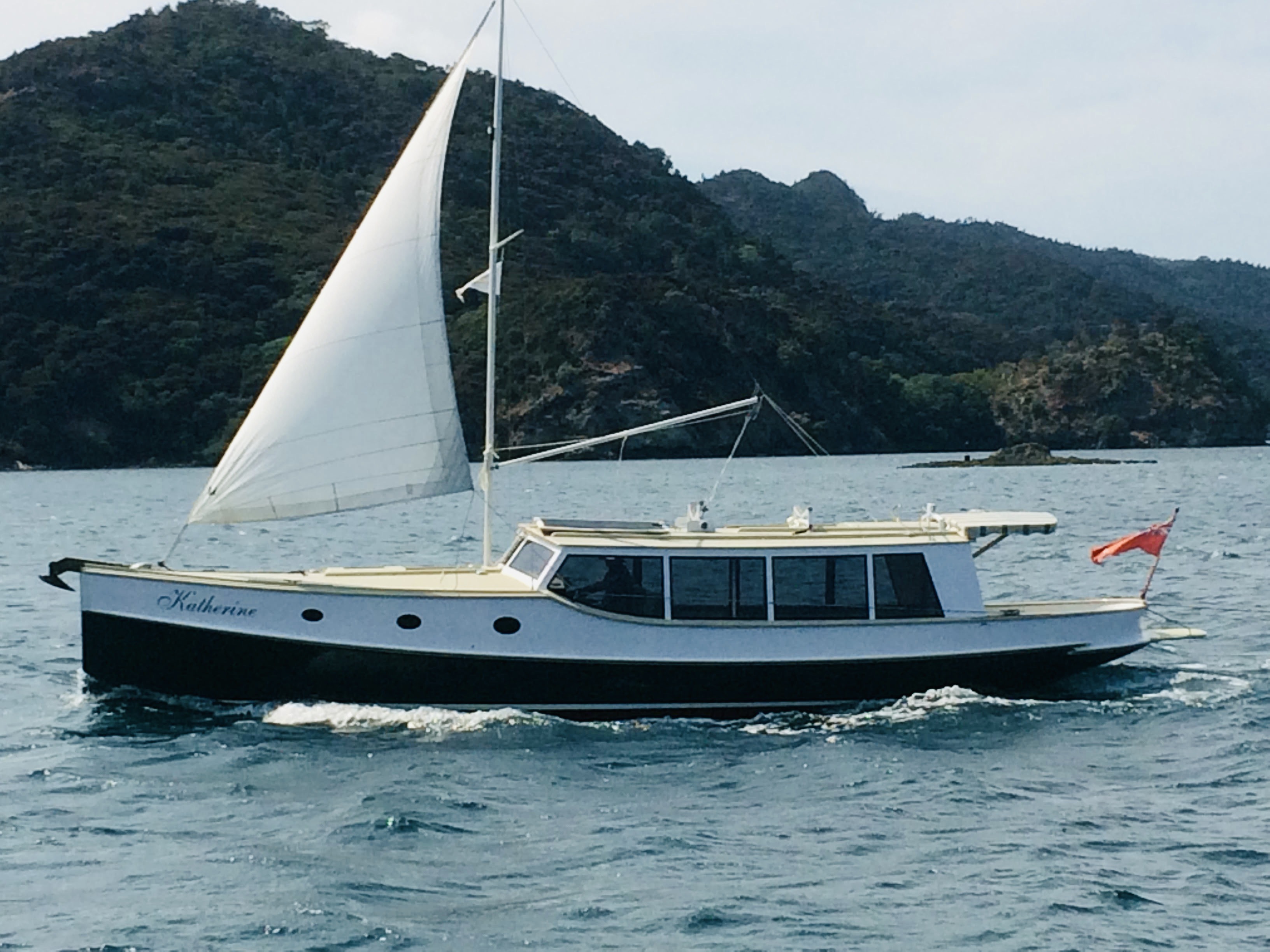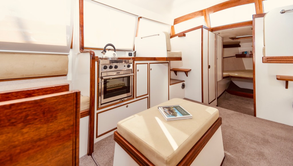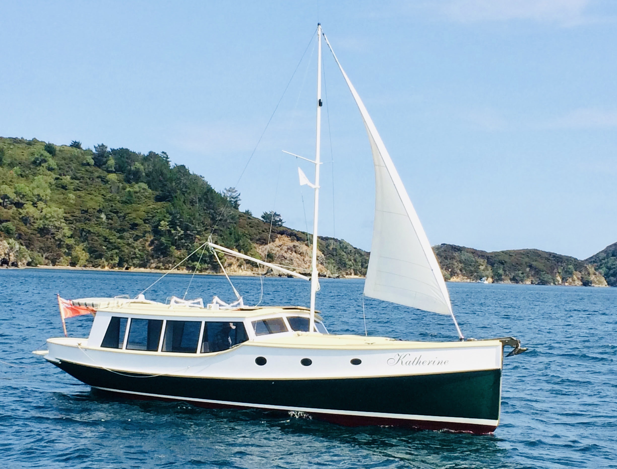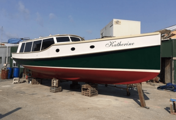 When you view Katherine, her lower hull is glass and from the green section up she is wood – the best of both worlds in terms of water ingress and maintenance. Katherine was purchased in Jan 2018 by accomplished professional boat builder Allan Hooper who immediately started reviewing and enhancing the launch, this included designing and adding the rig and a lot more mods. I challenge anyone to show me a sub 40’ launch with more internal volume, with the same standard of fit out, there is even sound proofing built in 🙂