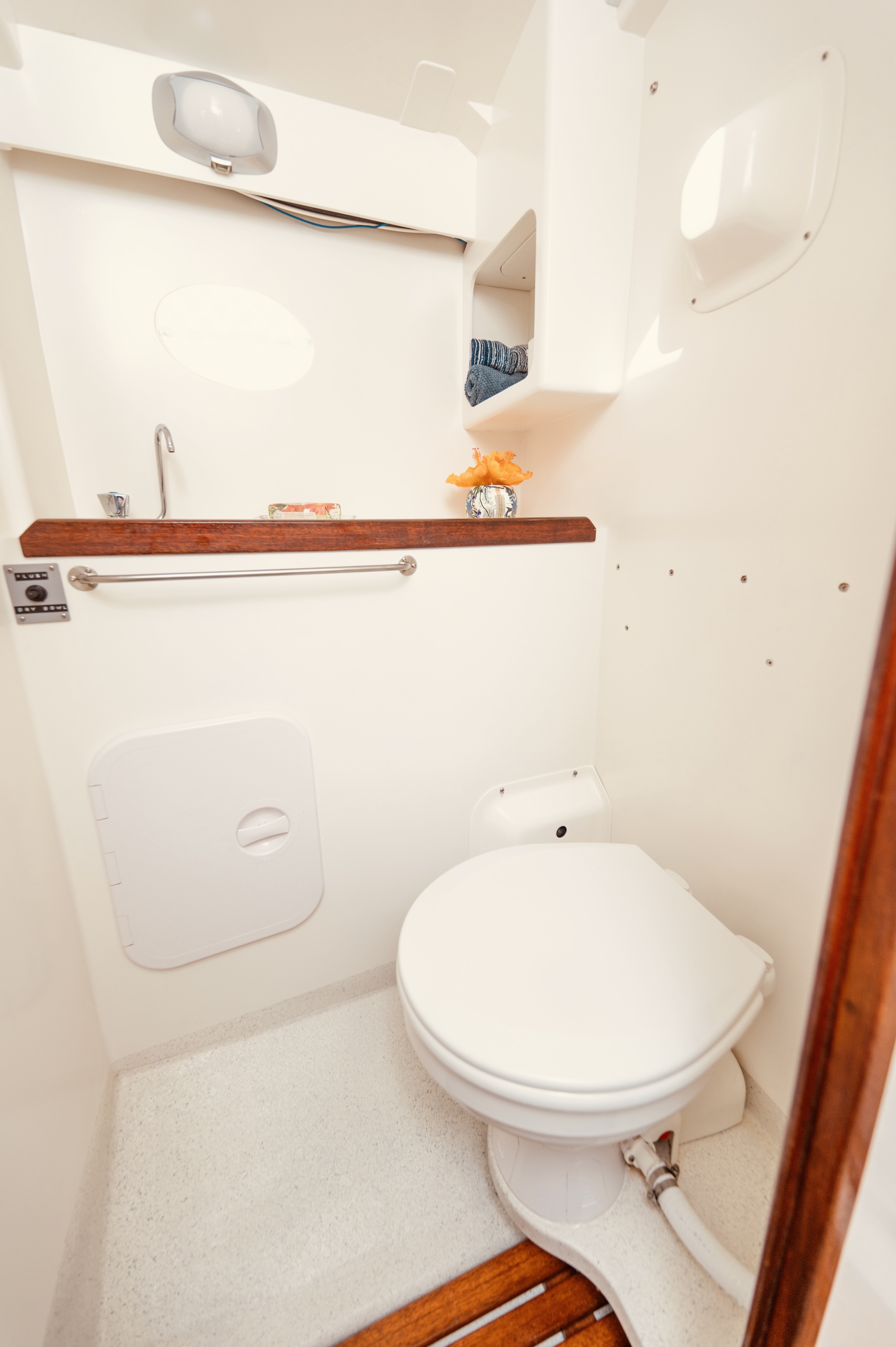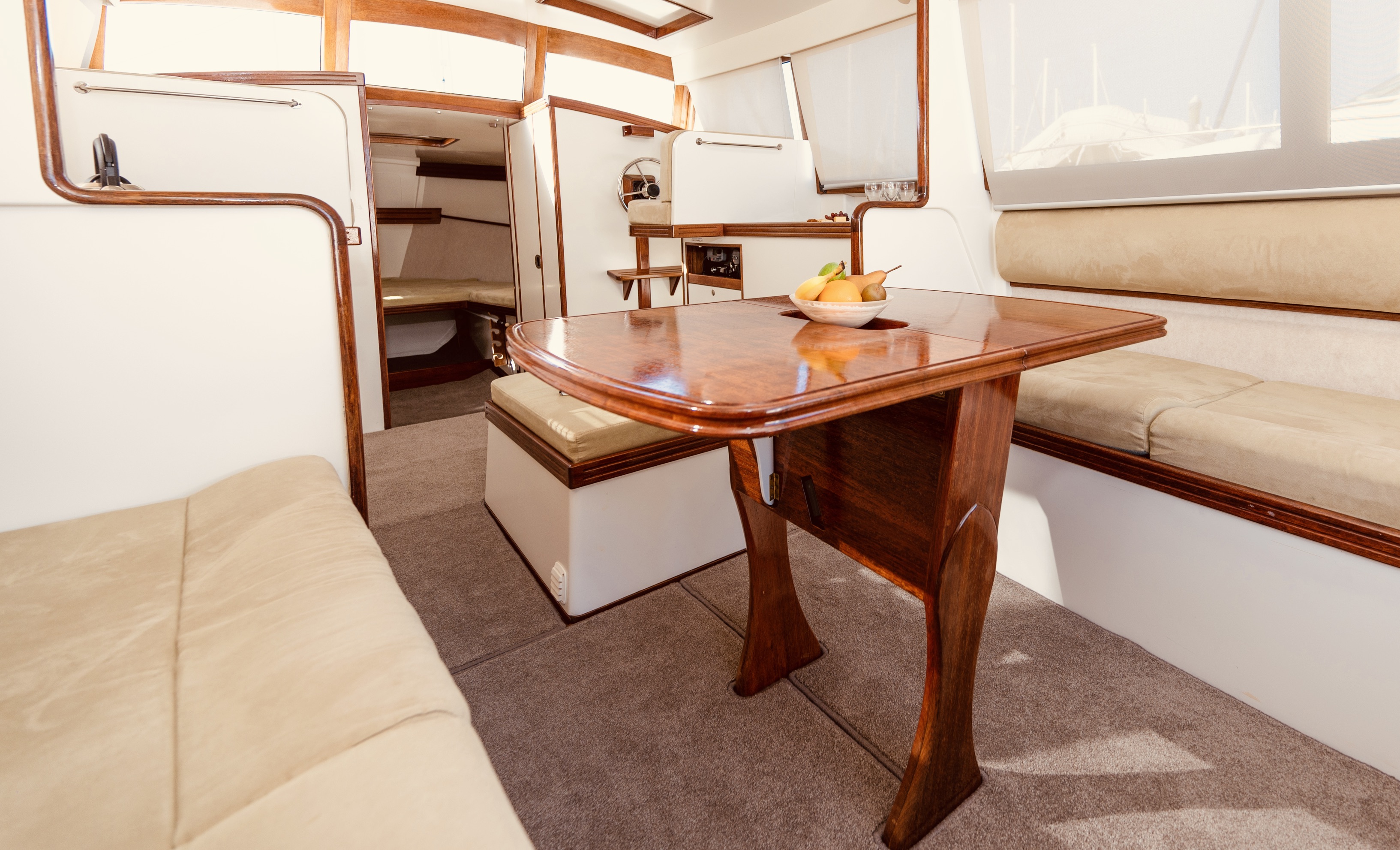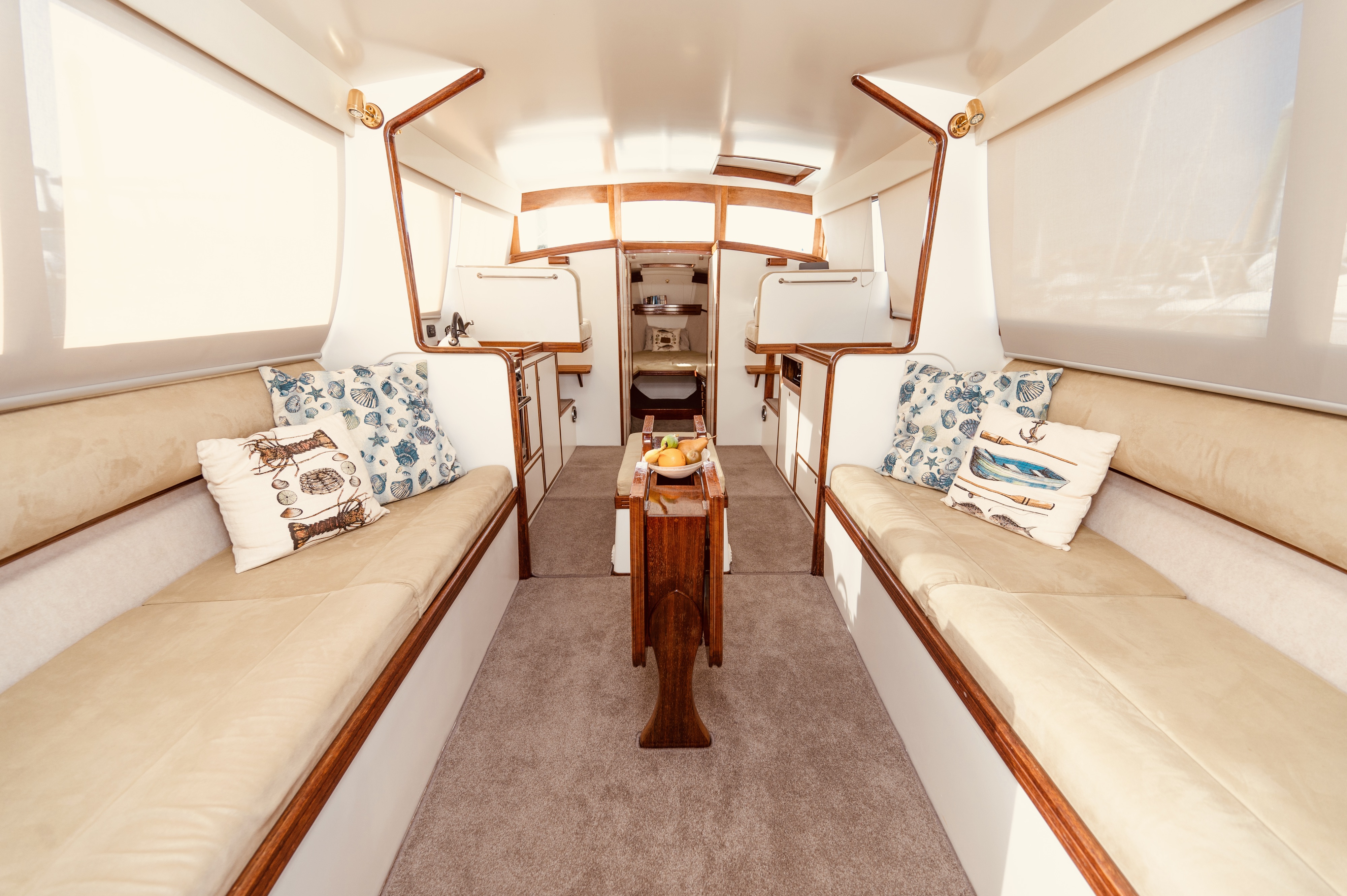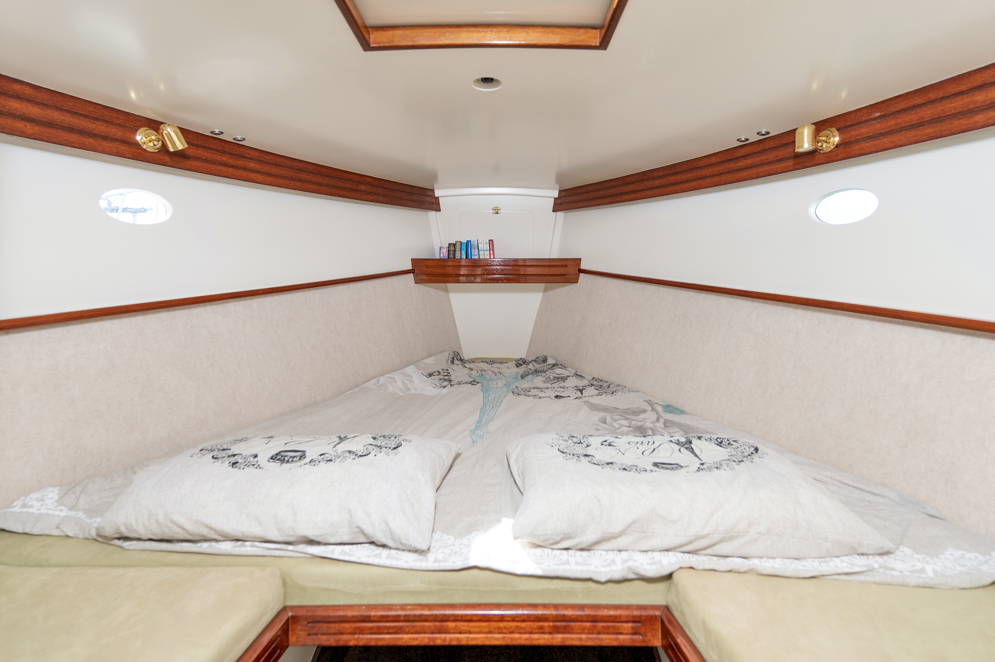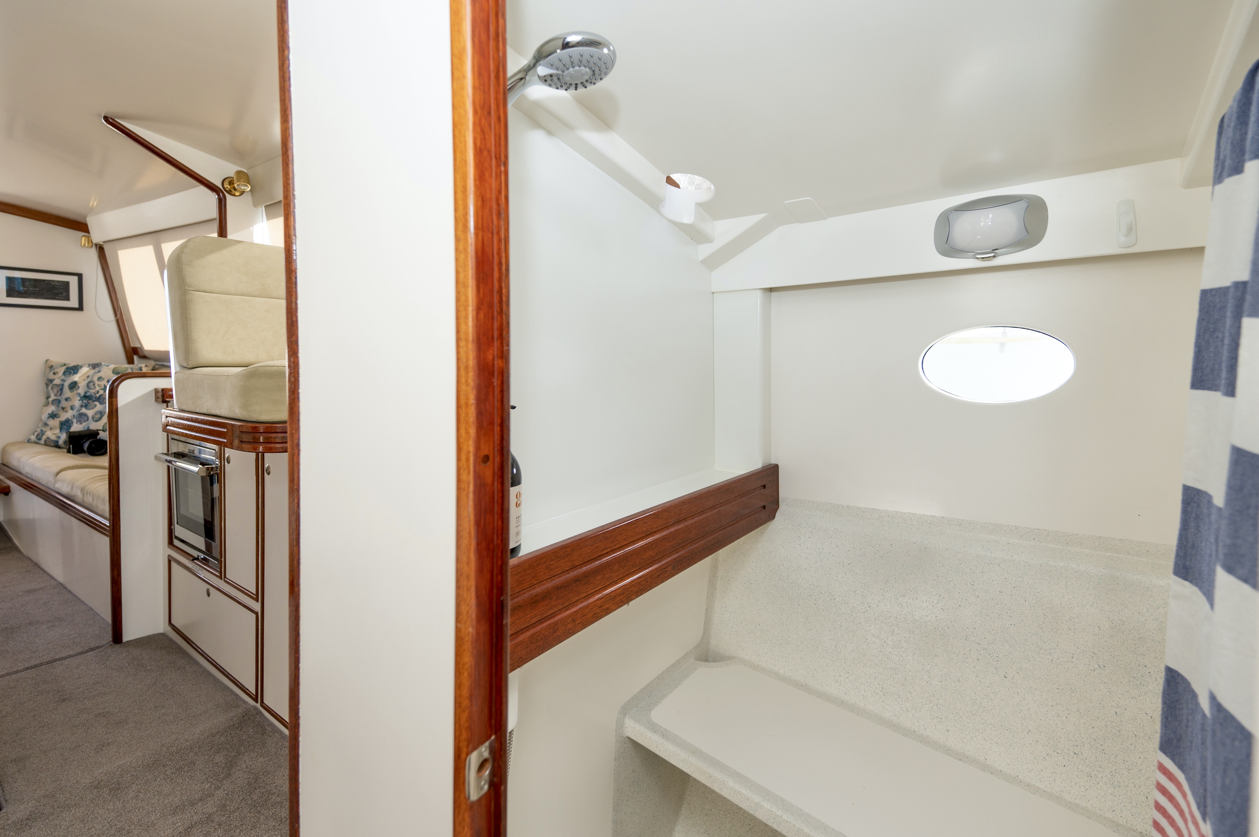 When you view Katherine, her lower hull is glass and from the green section up she is wood – the best of both worlds in terms of water ingress and maintenance. Katherine was purchased in Jan 2018 by accomplished professional boat builder Allan Hooper who immediately started reviewing and enhancing the launch, this included designing and adding the rig and a lot more mods. I challenge anyone to show me a sub 40’ launch with more internal volume, with the same standard of fit out, there is even sound proofing built in 🙂