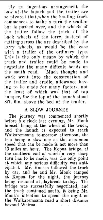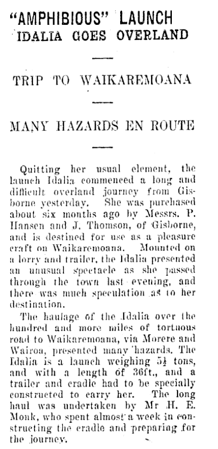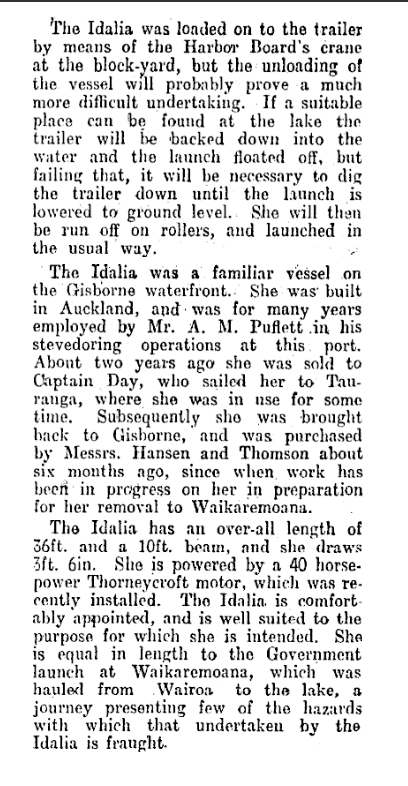The second mention is also in the Poverty Bay Herald, this time dated 13th October 1933 and covers Idalia’s overland journey from Gisborne to Lake Waikaremoana. Lots of background on the boat ownership in the press clippings below. She was 36’ x 10’ x 3’6” and powered by a 40hp Thorneycroft engine, recently installed in 1933.