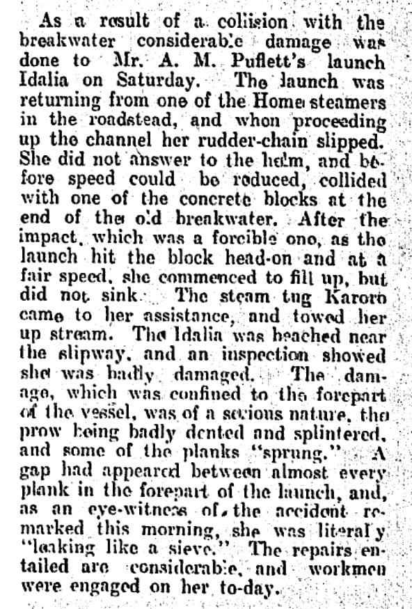 Toni has also search the launch on the Papers Past site and uncovered two interesting mentions – the first is from the Poverty Bay Herald, 23 Feb 1925 and covers a wee (actually not so wee) oops while Idalia was in Gisborne. You have to love the terms they used back then – no steering = “she did not answer to the helm” and taking on water = “she commenced to fill up”. Press clipping below