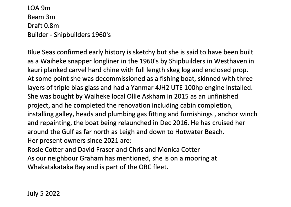 INPUT ex Graham Hunter – She is still named BLUE SEAS Waiheke Island is also on the transom. She is now on a Mooring in Whakatakata Bay By OBC