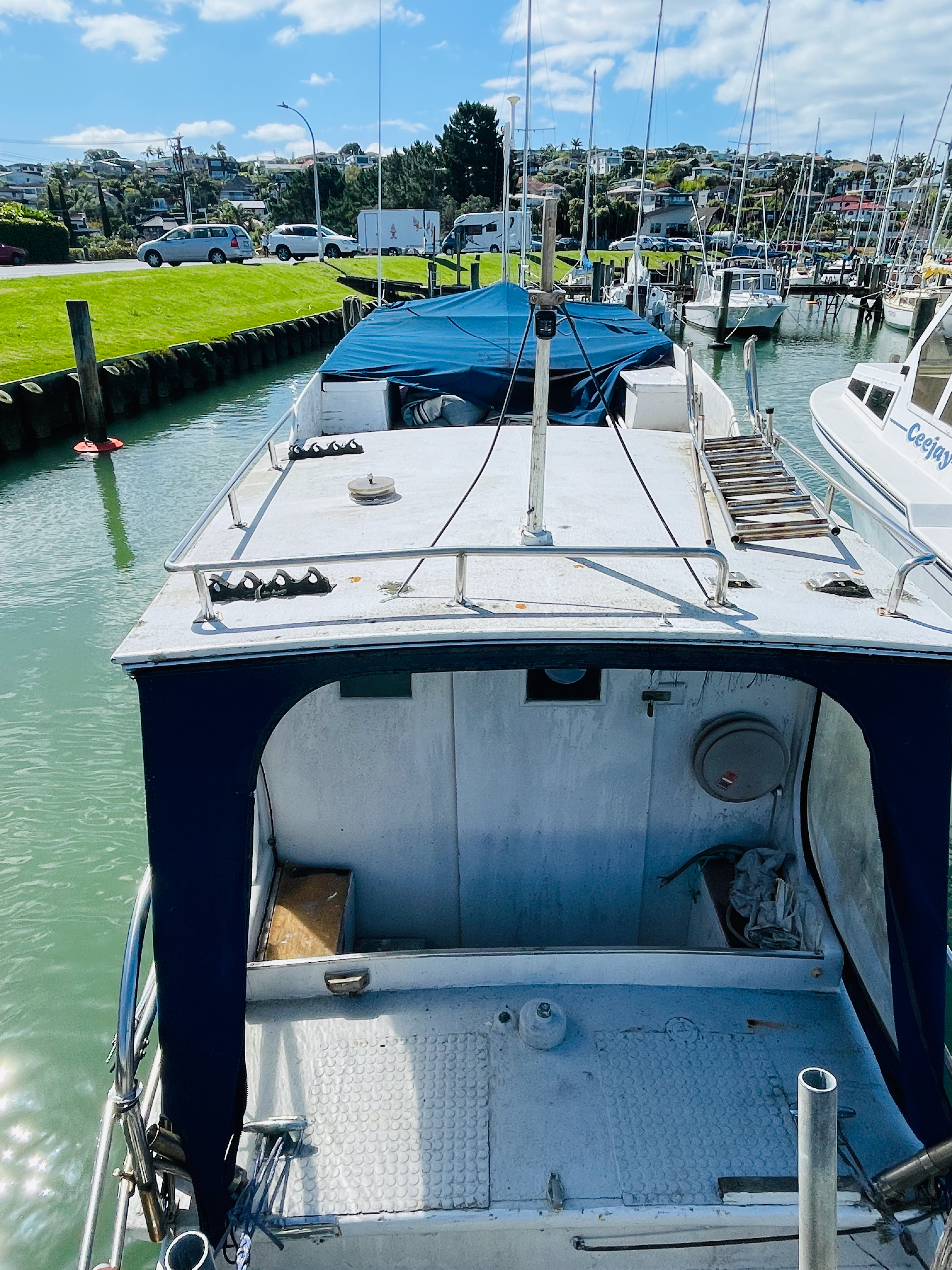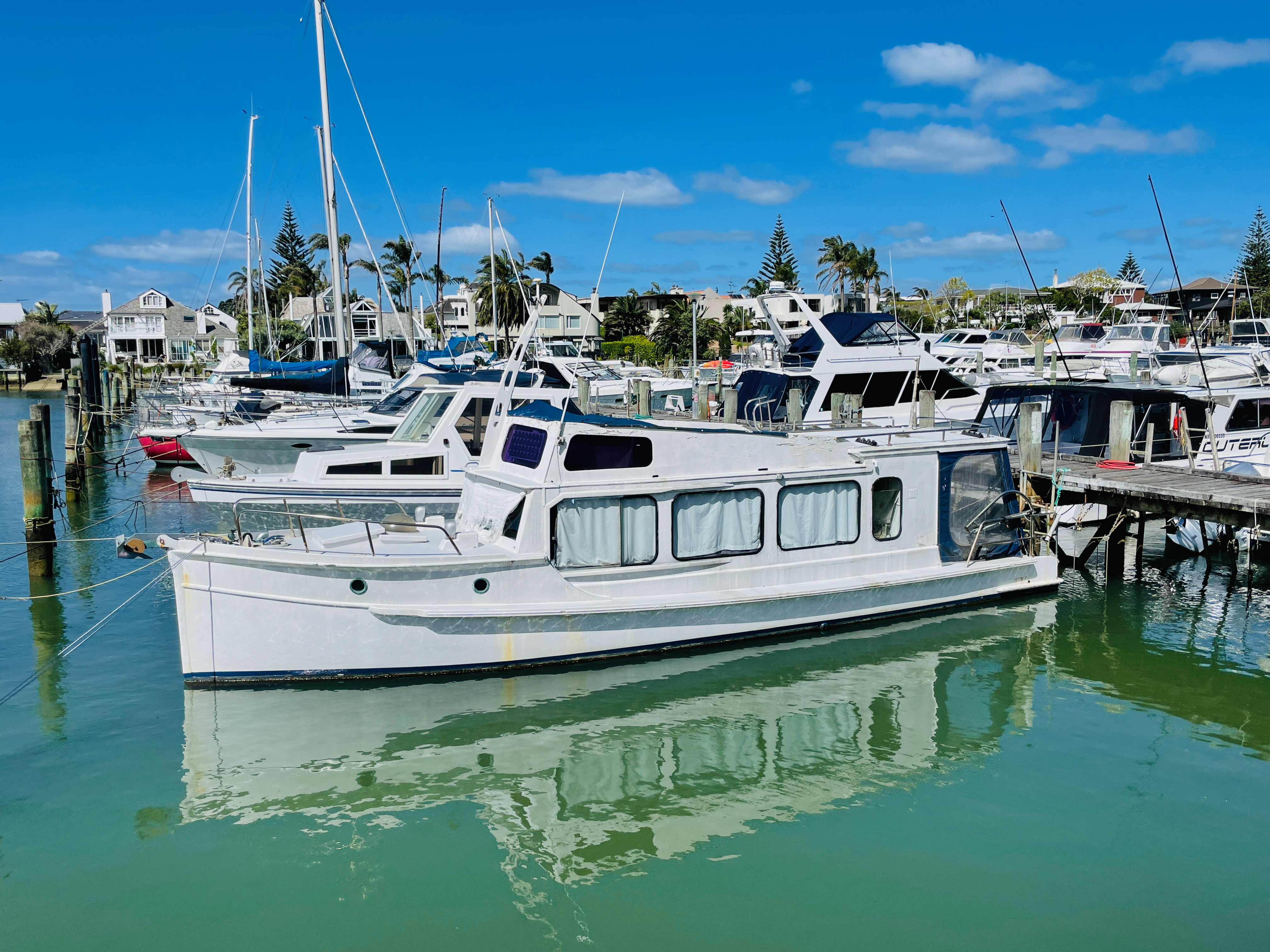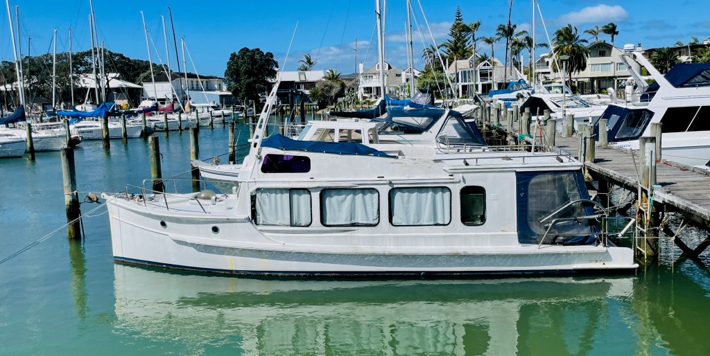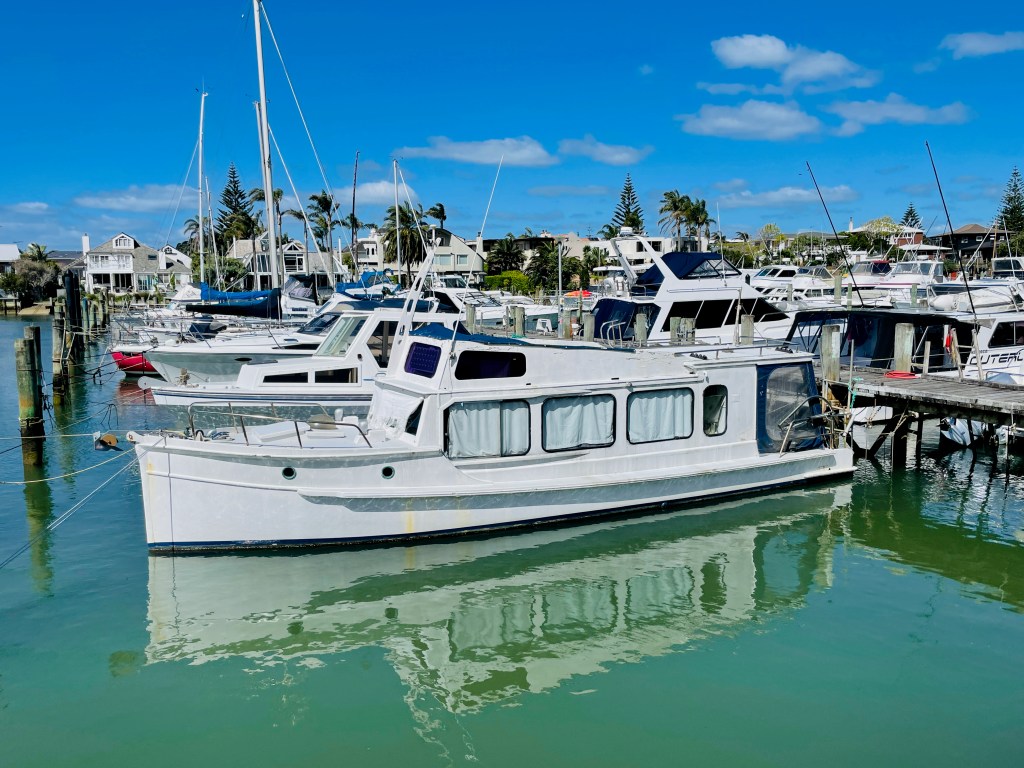 The back story goes like this – built c.1900’s, using kauri planks and measuring 32’ x 9’ beam and a draft of 3’. She was built to do the cream run on Lake Rotorua, which she did for approx. 40 years, her next owners, 30 years, were the Nicol family and John has had her for 20 years – some impressive times there, must indicate she is a sea friendly boat. Nathan Herbert might be able to chip in and explain her special hull shape for shallow water running. Current powered by a 1992 Nanni 43hp diesel. Obviously needs some TLC and possibly a few dollars spent here and there, but its afloat and the motor runs.
