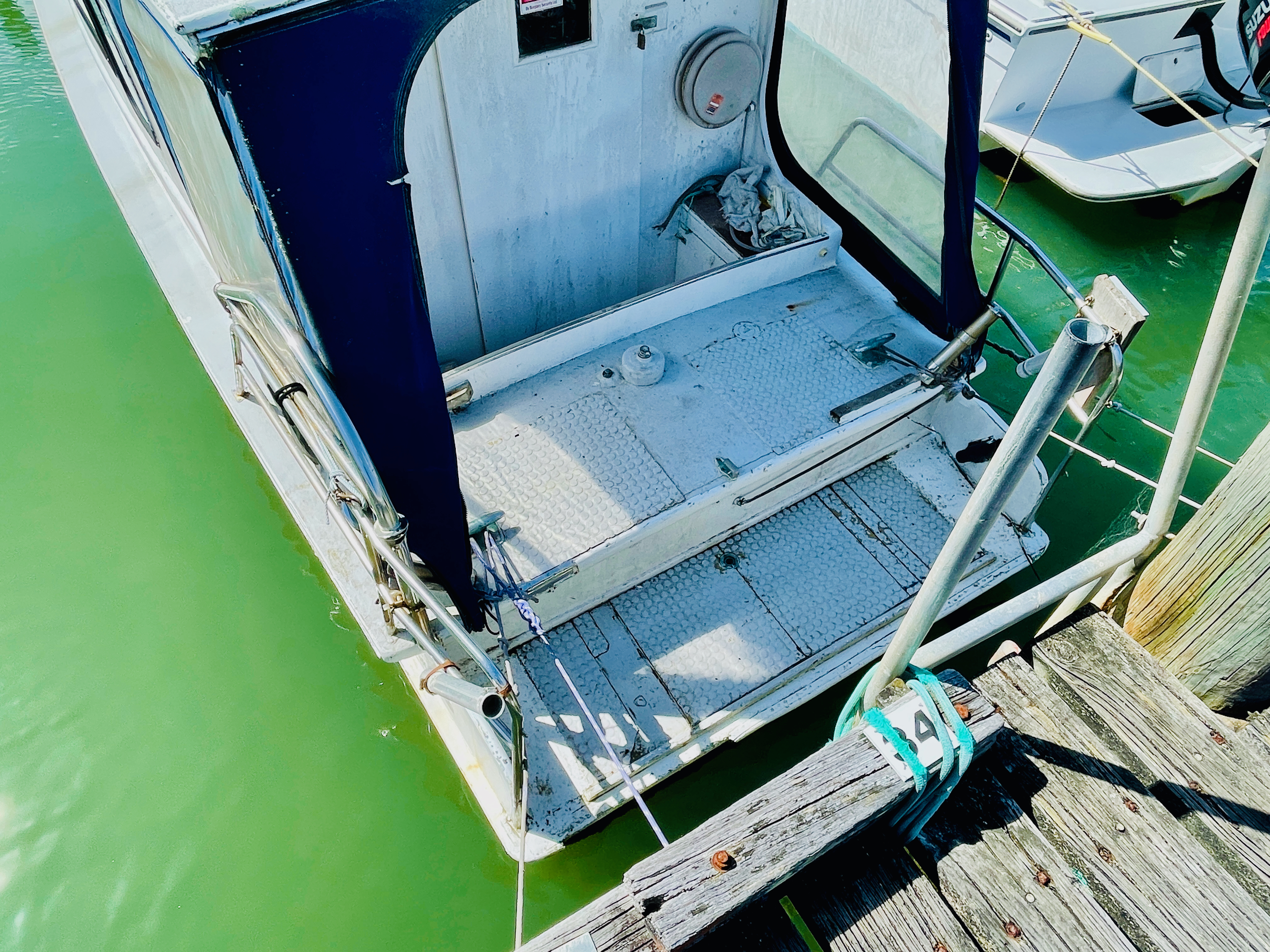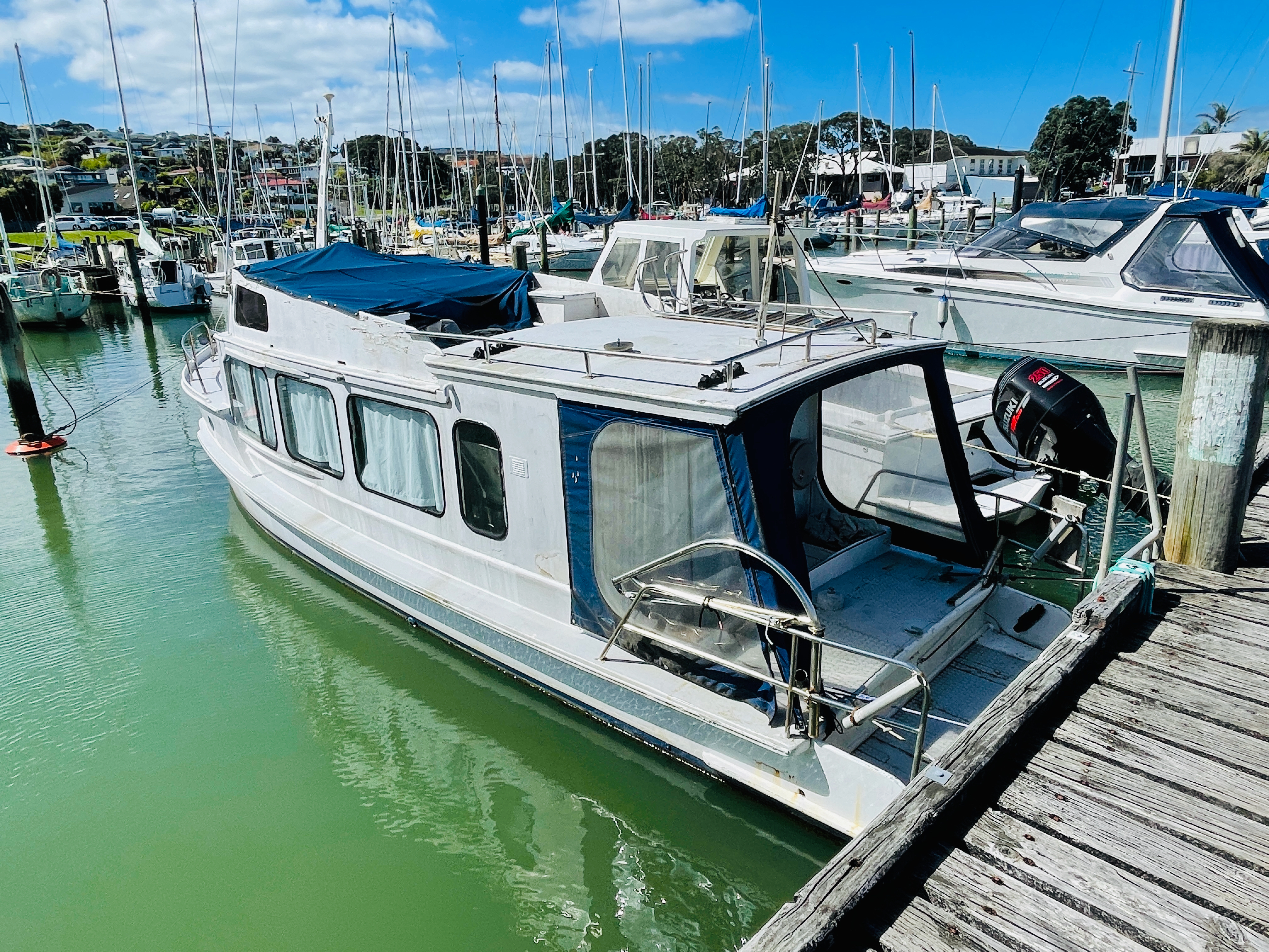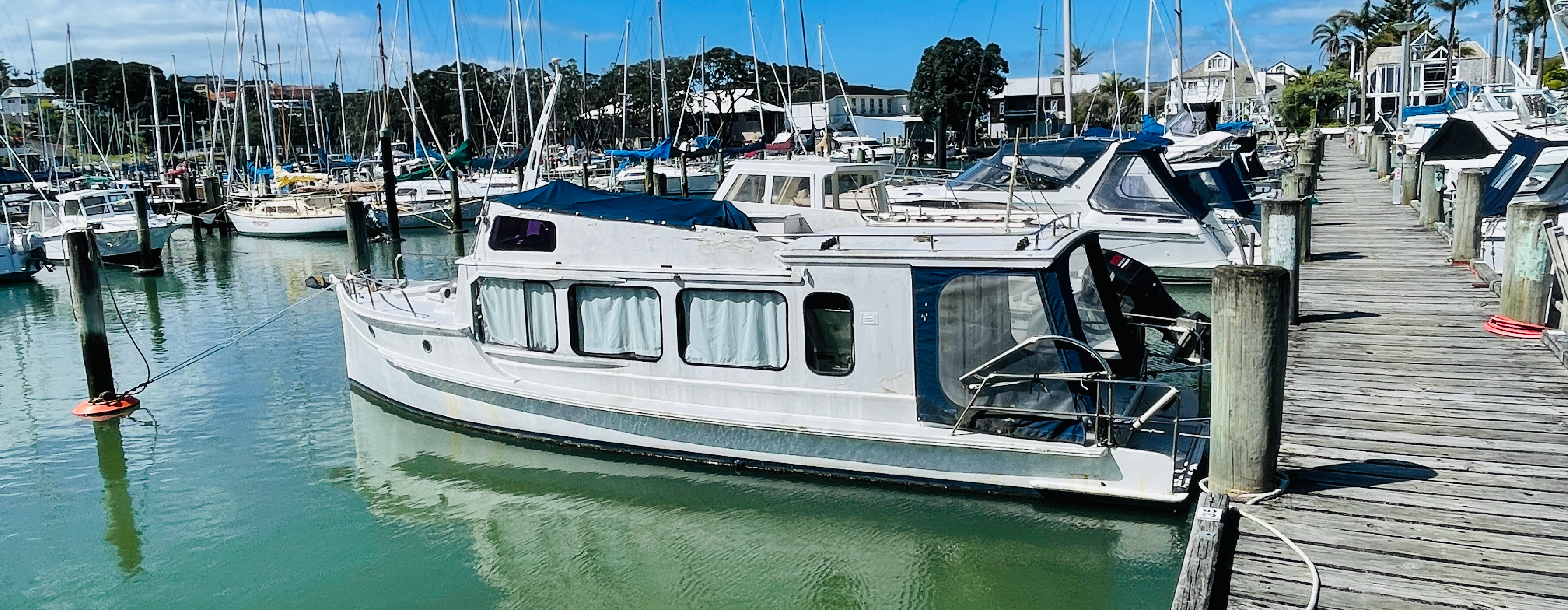 The back story goes like this – built c.1900’s, using kauri planks and measuring 32’ x 9’ beam and a draft of 3’. She was built to do the cream run on Lake Rotorua, which she did for approx. 40 years, her next owners, 30 years, were the Nicol family and John has had her for 20 years – some impressive times there, must indicate she is a sea friendly boat. Nathan Herbert might be able to chip in and explain her special hull shape for shallow water running. Current powered by a 1992 Nanni 43hp diesel. Obviously needs some TLC and possibly a few dollars spent here and there, but its afloat and the motor runs.