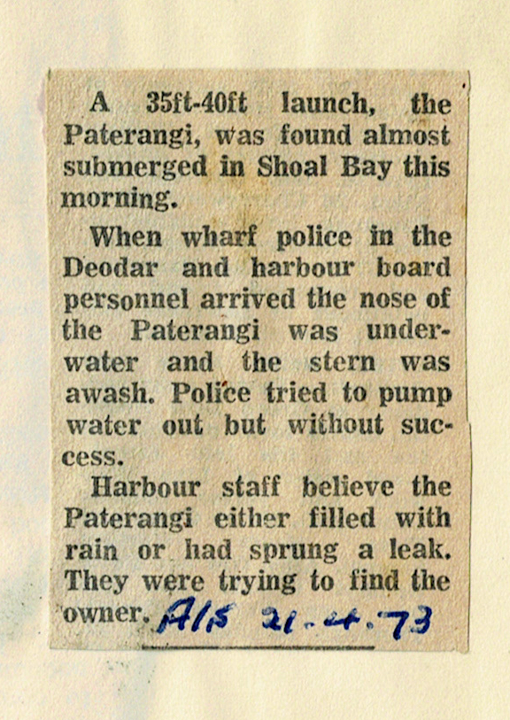 Oh God.. this article tears at my heartstrings.. MV Paterangi was my parents’ launch.. and summers were wondrous upon her. That partial sinking was a failed skin-fitting,but strangely there was evidence of out outside impact in it ( suspected tanalised pine pole that was found washed up on shore later). We spent that following winter on Okahu Bay hardstand getting her back seaworthy, and finely dressed. Huge respect to Keith Wyllie ( the ultimate Hauraki Gulf Old Salt) for doing srtrip-down and rebuild of motor , in situ. That’s a Good Mate eh?.. I learned a lot about Ford Ds , all of 16 years old as I was, just handing him tools and watching and listening. Sadly in ’78 a cyclone hit that dropped a neighbouring yatch’s rig on to Paterangi’s fordeck that smaskedout the bollar, and she was blown ashore onto the seawall and smashed to bits , the waves blowing the bits all across the Harbour Bridge toll plaza… I was living in Devonport and we had solid water hitting the house,100 yard away from the beach. Riding my motorbike into Auckland at 8am was the biggest traffic jam ever, and when I got to the toll-plaza area, I was pondering my stupidity in attempting the Bridge in those winds, when I saw the wreckage all over the road.. and recognised the bits . Saddest moment of my life to that point. That afternoon was the first time I’d ever seen my father cry. Vale BJD, and MV Paterangi… two stalwart Woodies of yore. Cheers.