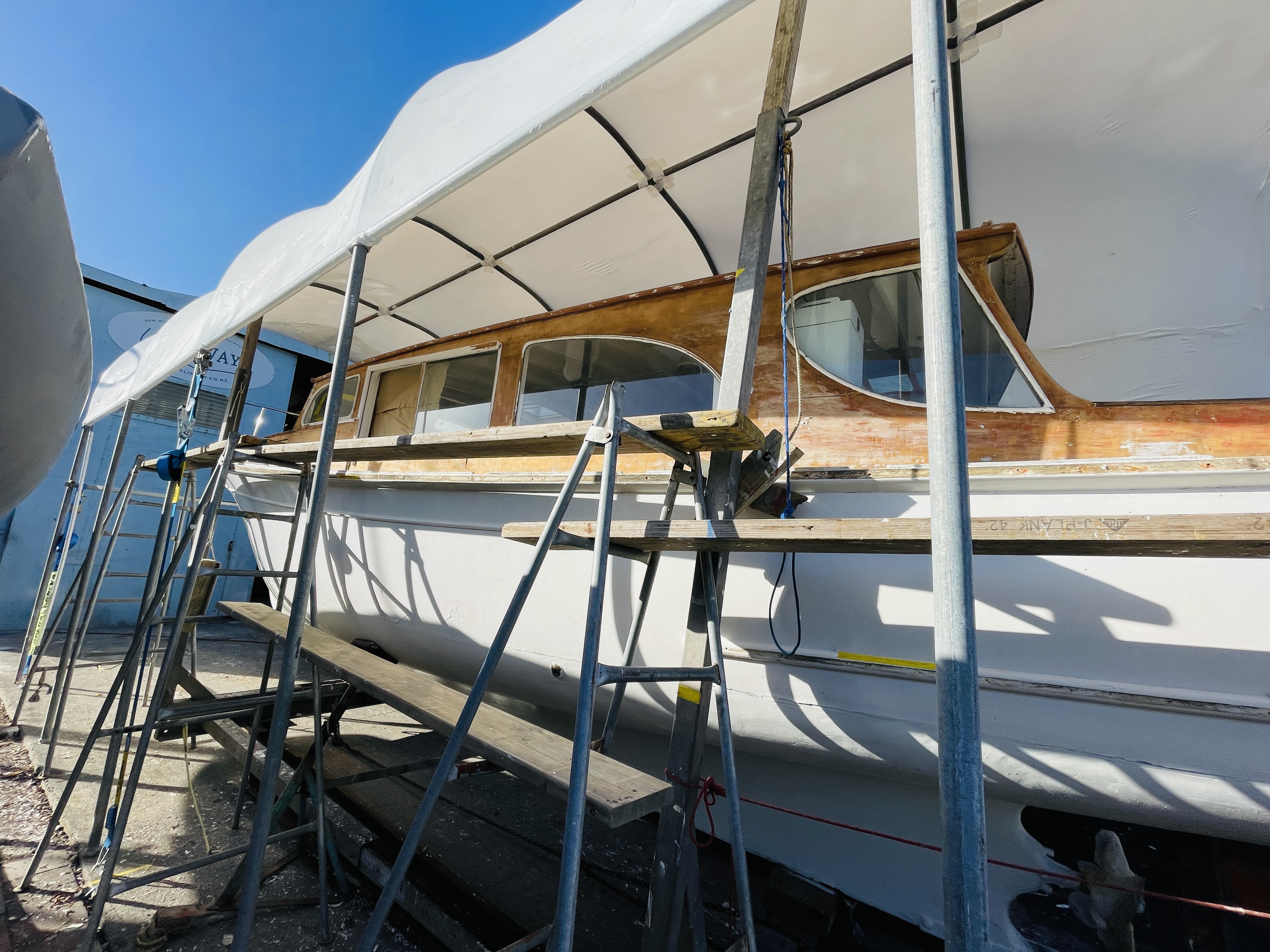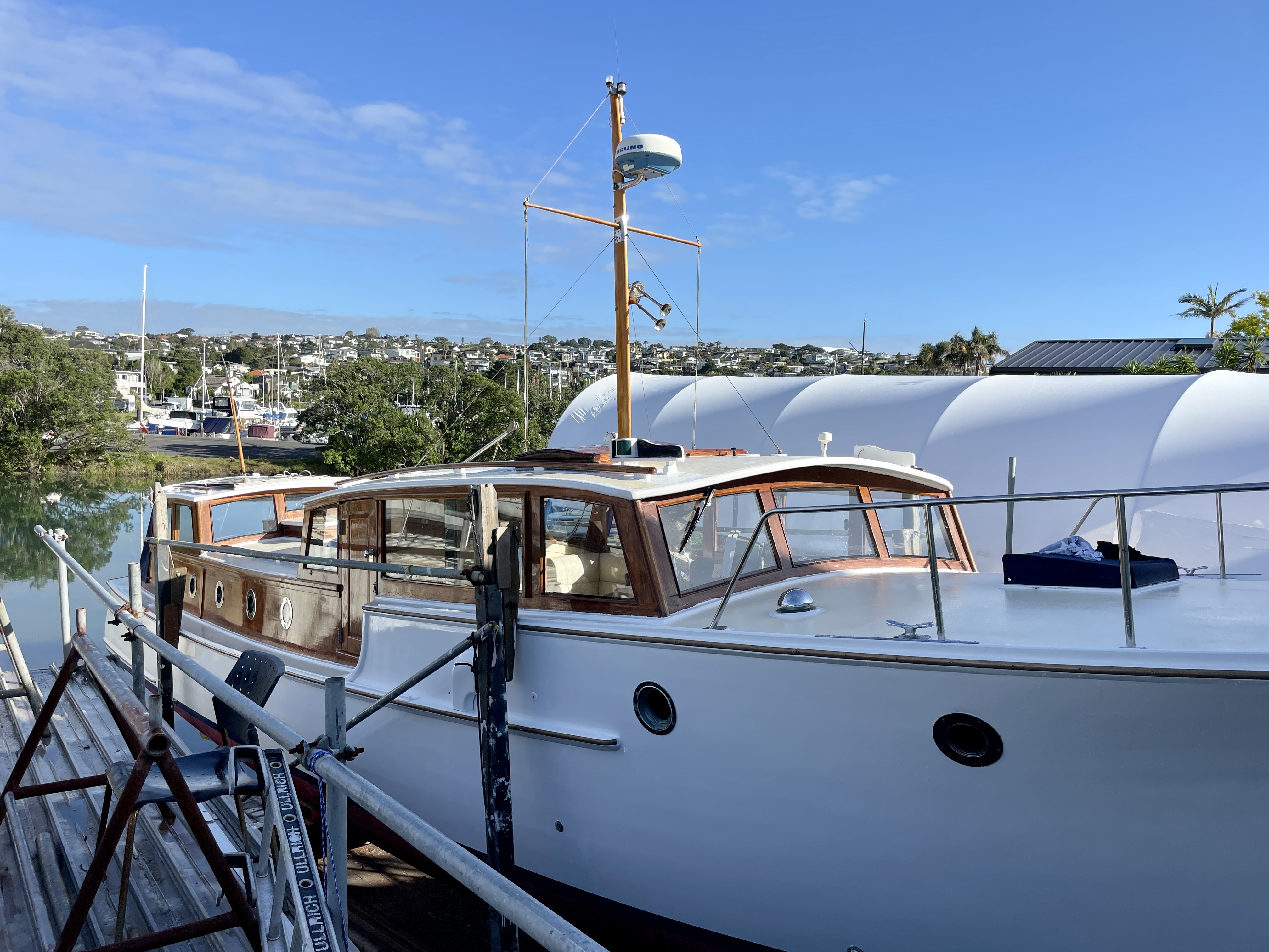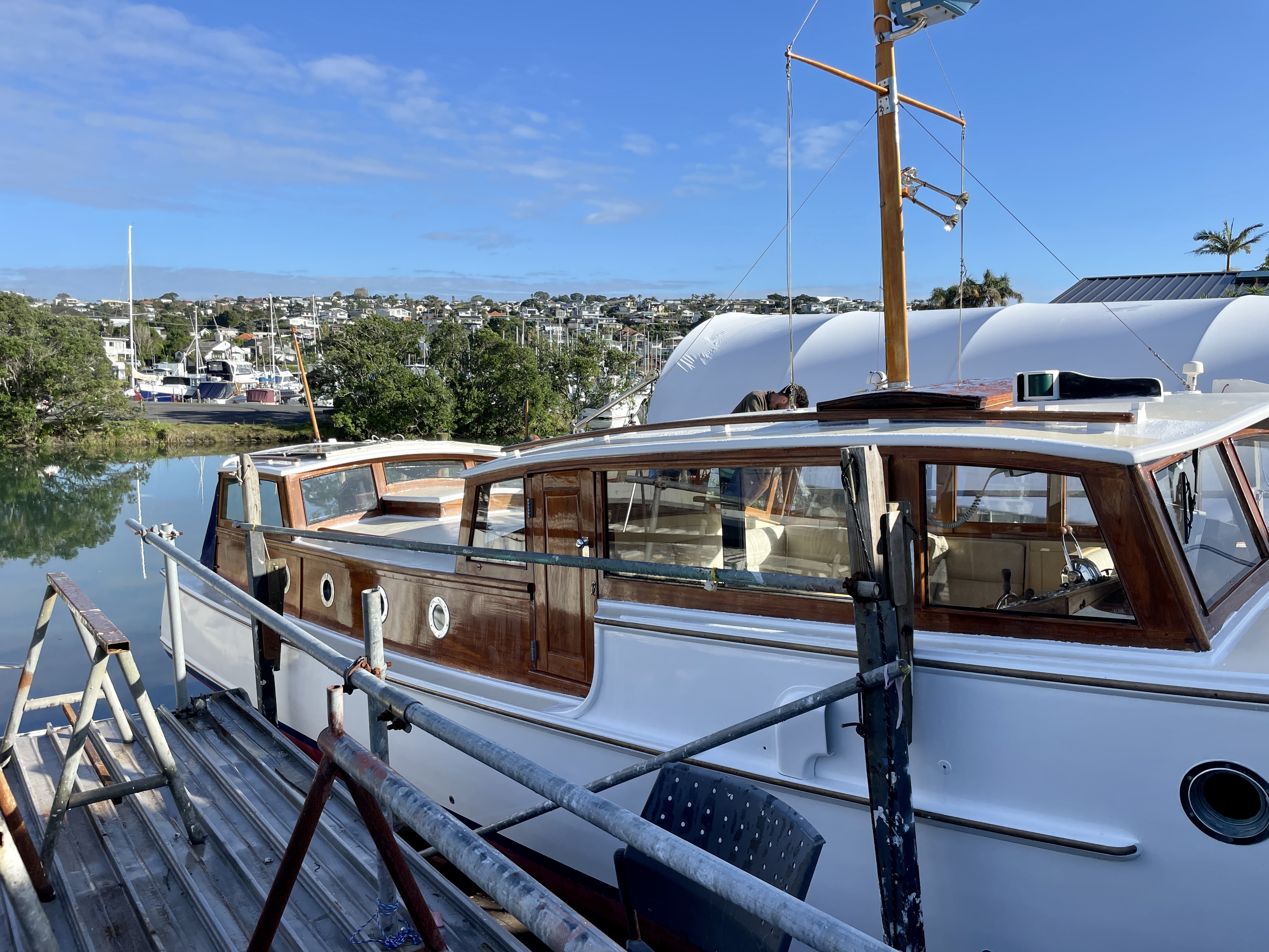 Endeavour – the 1958 A Couldrey designed, Brin Wilson built launch, is part way thru her re-fresh. Fingers crossed the coamings get the Uroxsys treatment 🙂