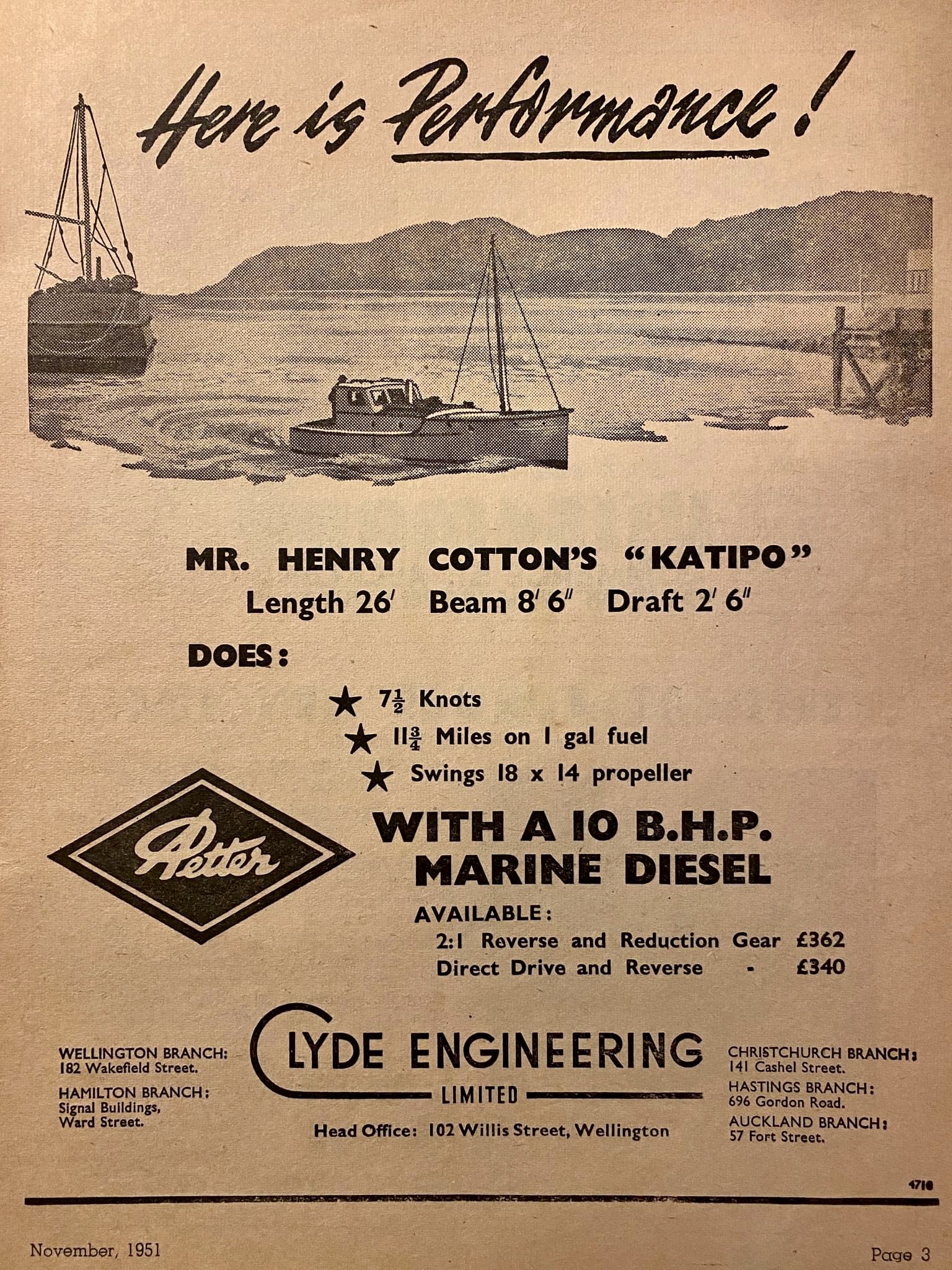 The ad featured the launch – Katipo, owned by Henry Cotton. Included was the following details – 26’ x 8’6” x 2’ 6” , powered by a 10 B.H.P. Petter marine diesel that gave her a speed of 7 1/2 knots.
