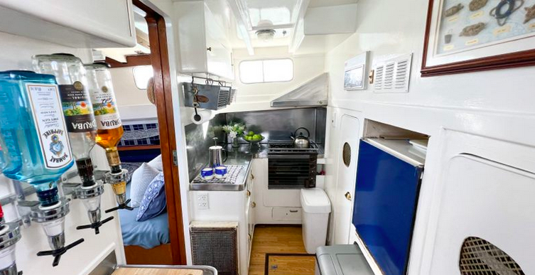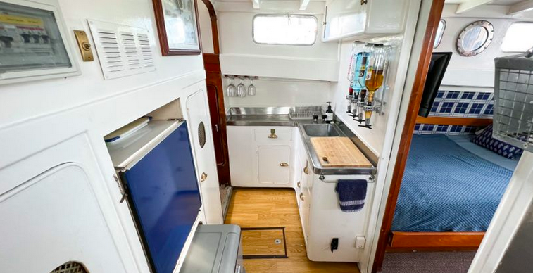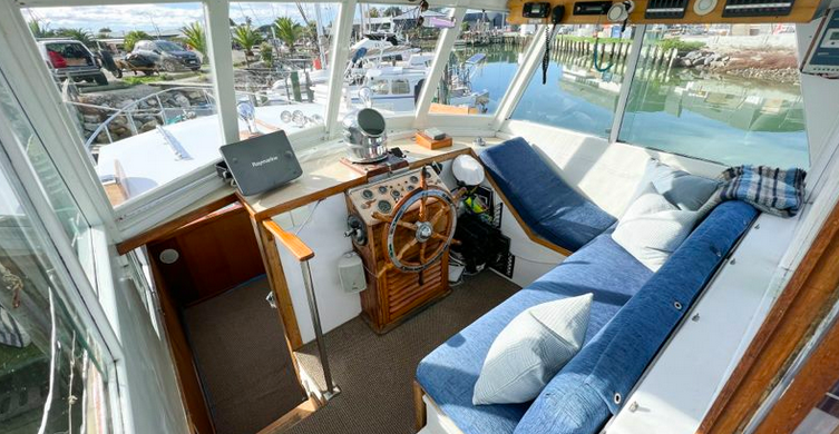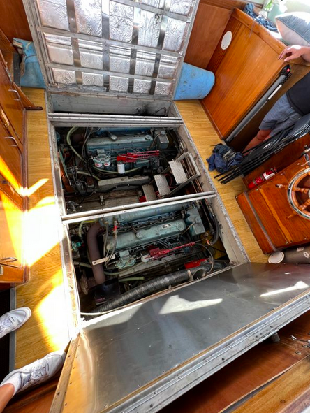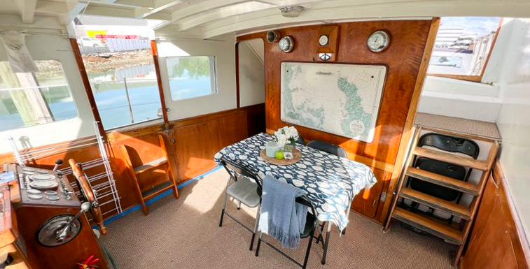 Original owner Ken Butland used to take sea scouts out to teach navigation. She had a folding chart table and the orders would come down an ex Navy voice pipe from up top.