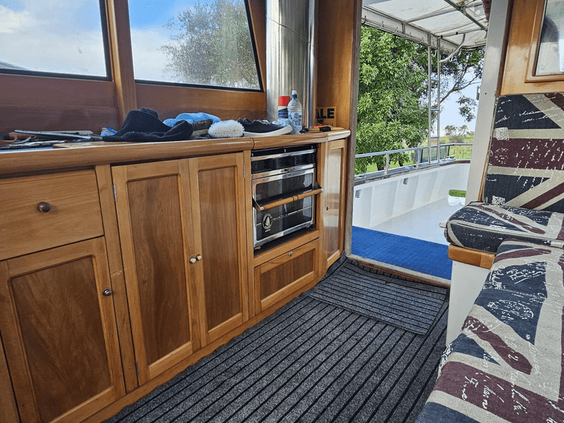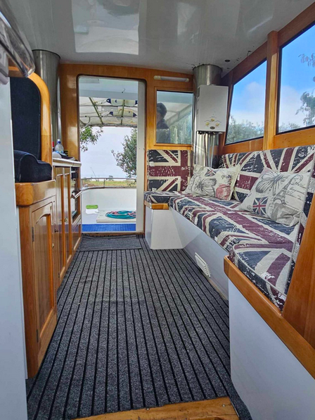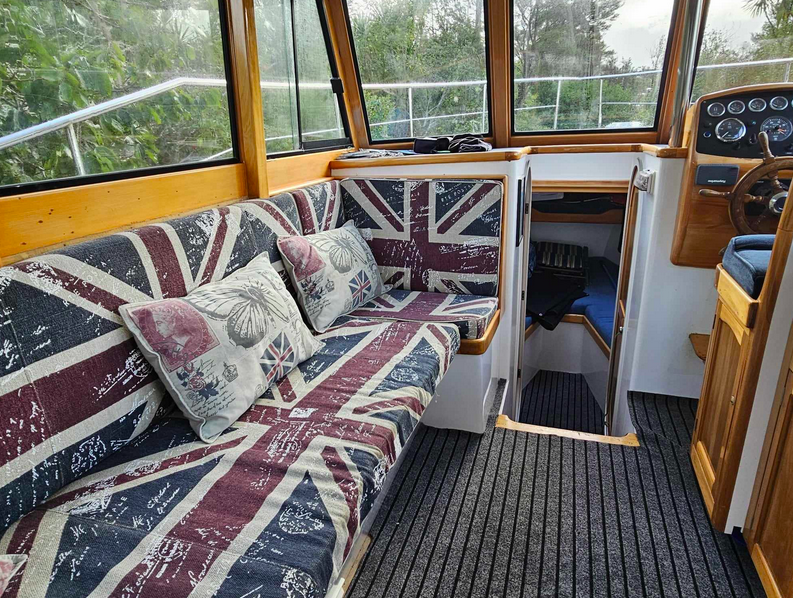 What I can confirm is that King Fsher is 36’ in length with a beam of 11’5” and draws 3’3”. Built from kauri with f/glass to the waterline.