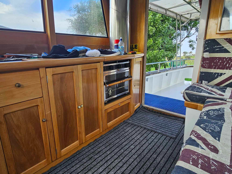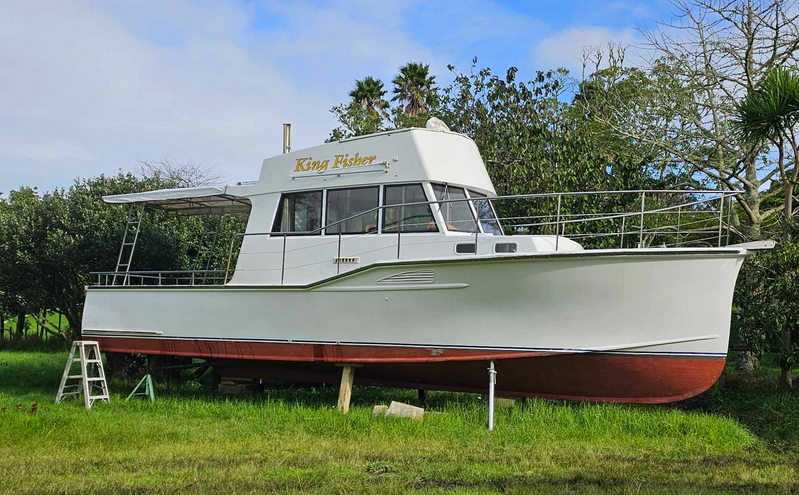 What I can confirm is that King Fsher is 36’ in length with a beam of 11’5” and draws 3’3”. Built from kauri with f/glass to the waterline.