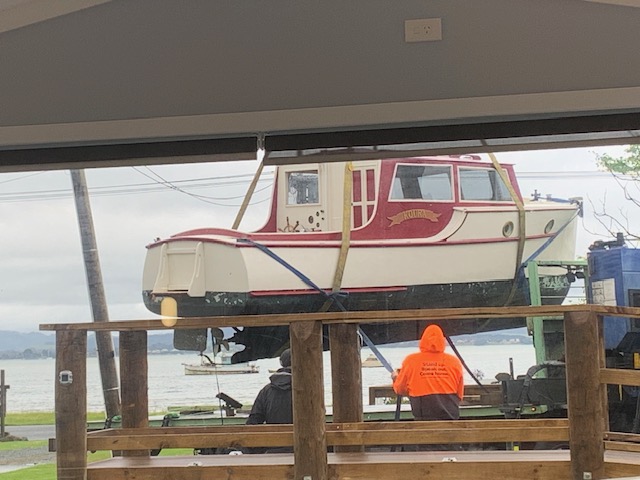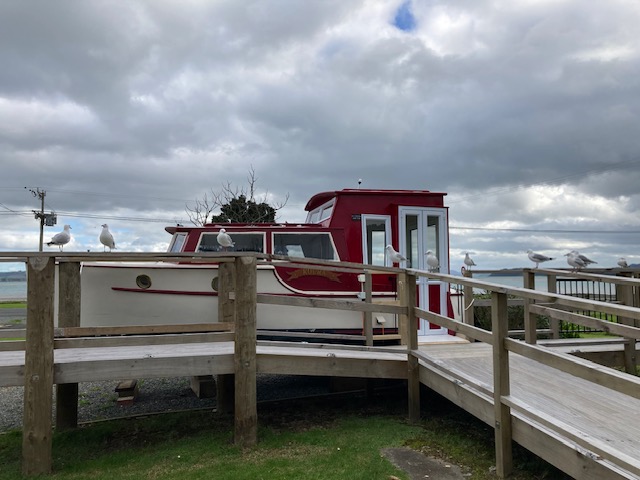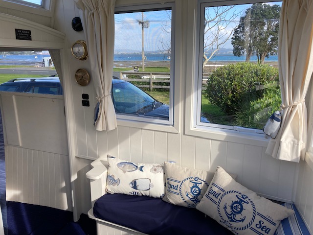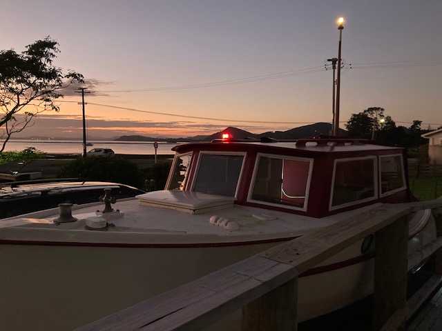 The overall result is that Koura is now a sunset cocktail lounge with wide cove and harbour views. The line of classic vessels and more recent vessels just off the beach give an air of being part of that little fleet. It is also a sleep out, for which we have installed a compliant fire extinguisher and smoke alarm. Insurance was another odyssey, persuading our Insurer that it was no longer a vessel, but rather a “boat shaped” building extension for the purposes above, but our Broker did a great job navigating those shoals.”