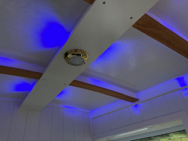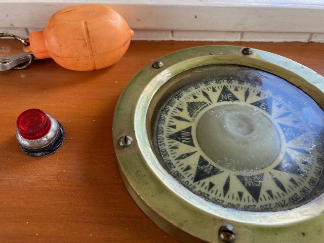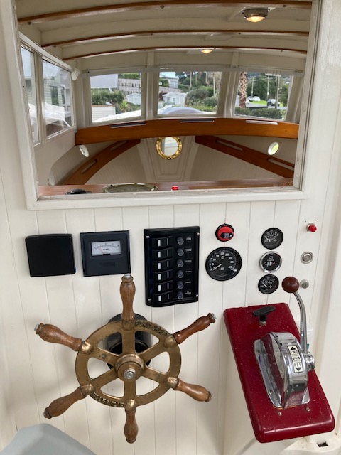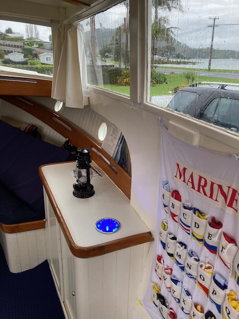 Existing lights are retained but mostly fitted with LED, and all new lighting is of matching style. When in night Nav mode, concealed blue lights illuminate the curved cockpit ceiling to appear as sky, and the original brass compass is illuminated with red light. A short raked flag pole on the transom allows us to fly the NZ maritime ensign or other flags.