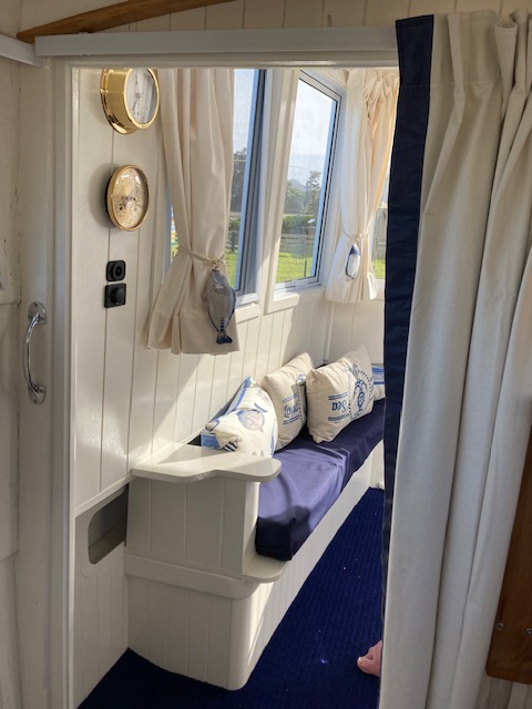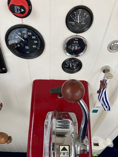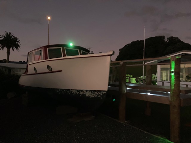 “The engine and gearbox have been removed along with battery and fuel, and all previous wiring updated with additional instrumentation and more accessible switch panel. Power is 230v through an all weather RV cable and socket from the jetty. A timer with back-up turns nav lights on at 6pm and off at 12 midnight whether we are there or not. The jetty lights are solar red and green approach lights, as well as white walkway lights. I rewired the original instruments so that when the new “ignition” key switch is turned on, the rev counter, oil and water instruments indicate an engine running at about 1400rpm. In a further burst of eccentricity normally reserved for the clinically bewildered found Spotify sound tracks of a marine diesel starting up and of a diesel engined boat swishing though waves. A master switch allows me to isolate certain functions, including the new compressed air fog/ nav directional warning horn so it can’t be operated by kids or inebriated adults.