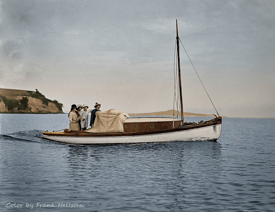 The photo comes to us from a Frank Hellsten post on the ‘Friends of Vintage,Classic & Traditional Boats’ fb page. Frank restored and colorized the photo, which was taken by a William Leonard Fletcher and resides in the Auckland maritime museum archives. No dates.