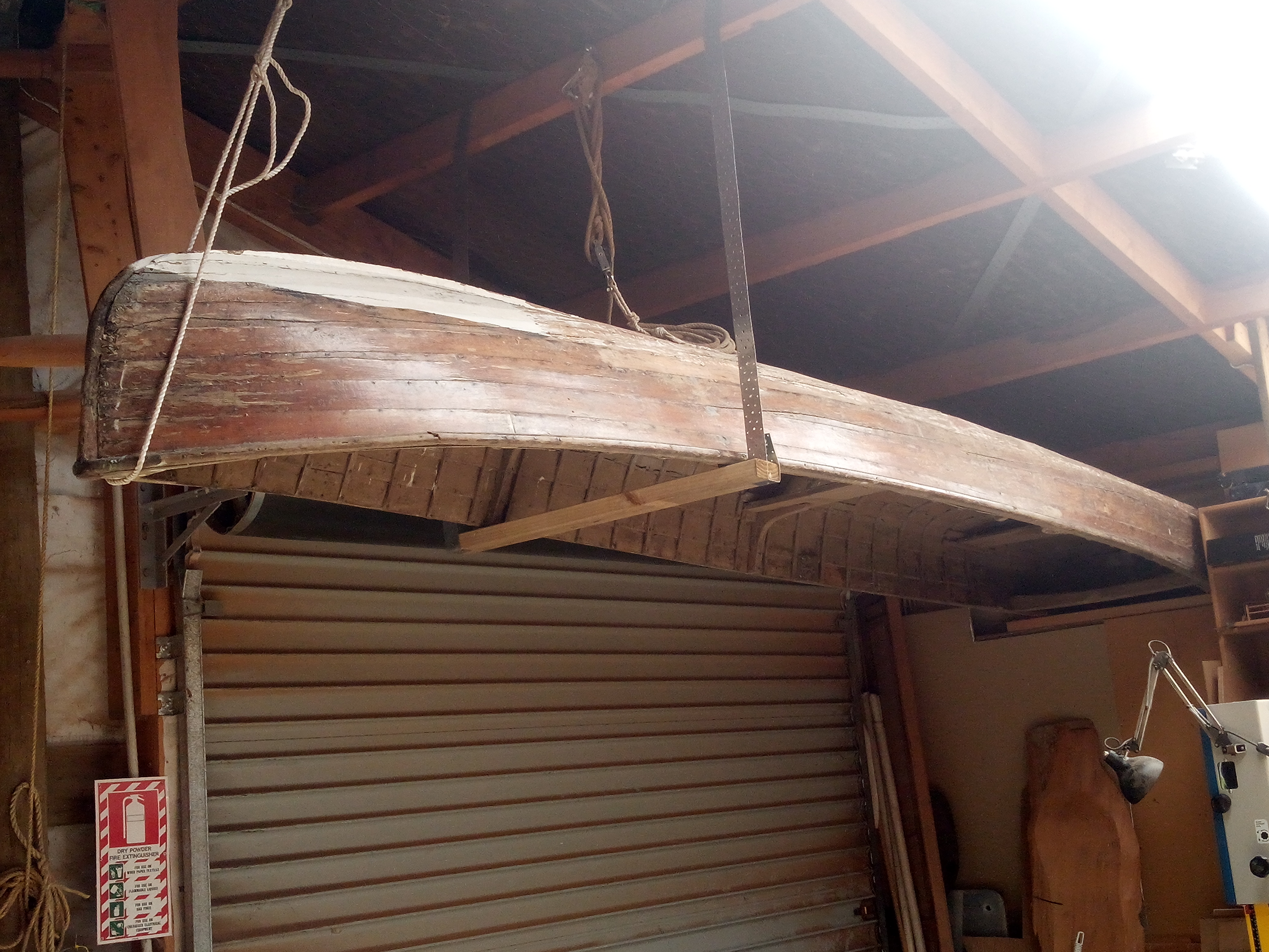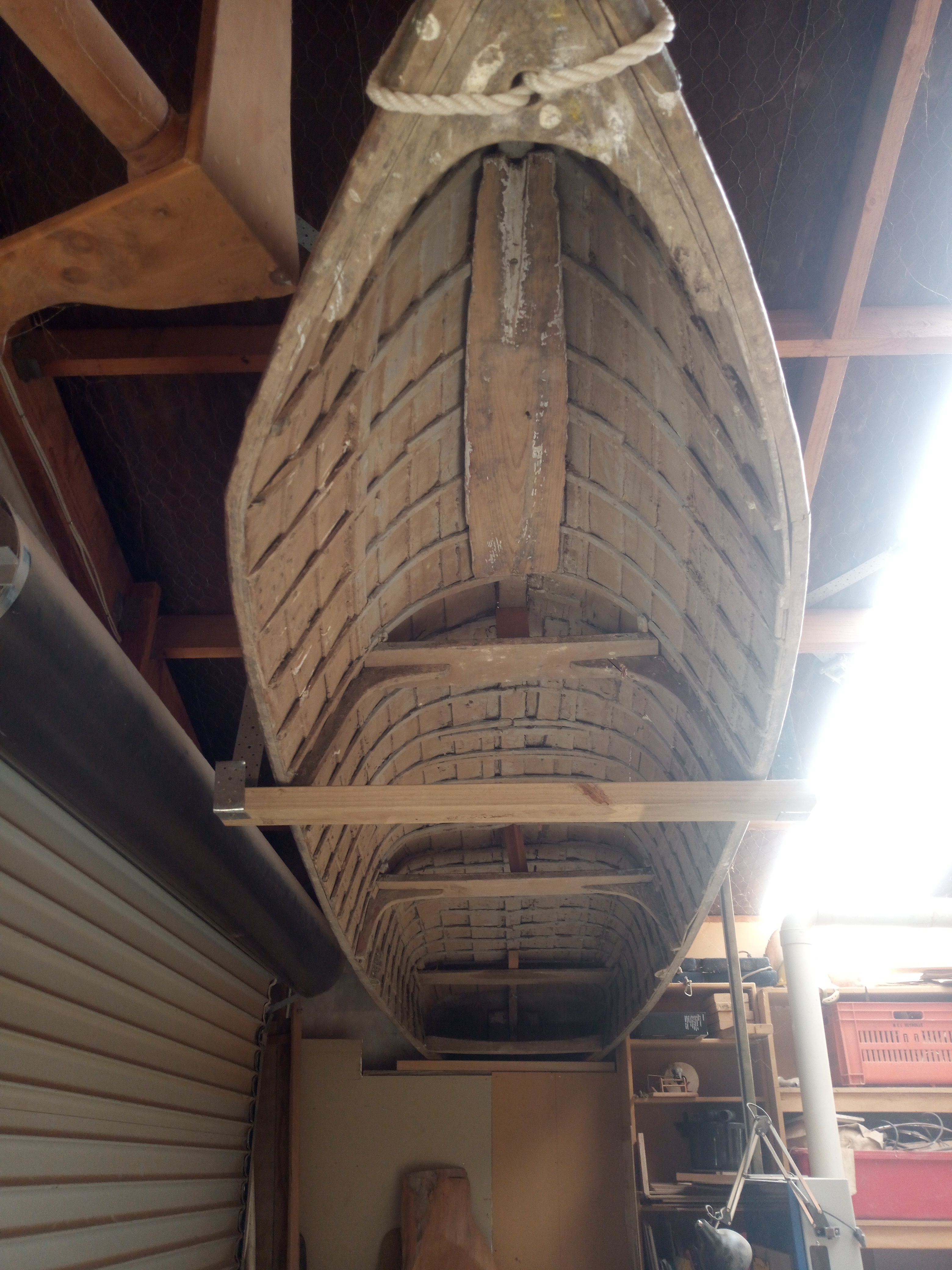 During the week I was contacted by master boatbuilder – Peter Murton regarding a craft currently in his workshop rafters. Peter has been told that the 14’ clinker won a NZ Outboard Cup race in the 1930’s.The very skinny craft was possibly built in 1932 by Deems boat yard and has all kauri planking, ribs, natural knees and stem all look like mangrove and pohutukawa. Ribs are 3/4″ x 1/4”, planking all 1/4”