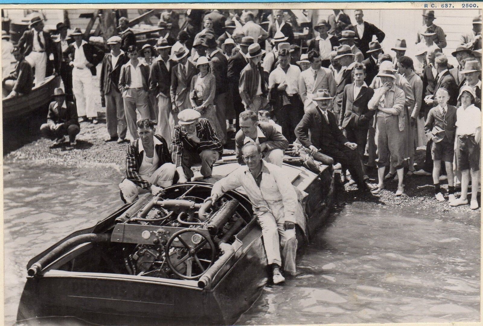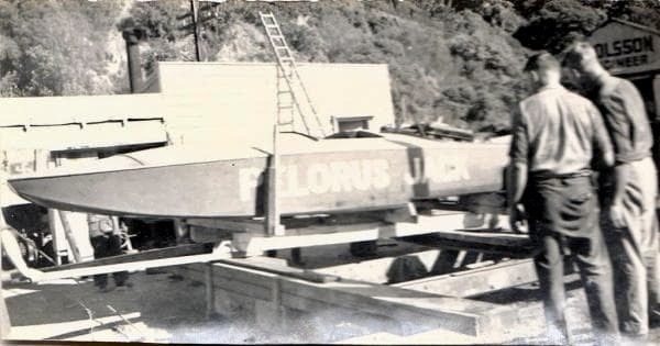“This is a long shot but I’m hoping you may have acces to a photo that may shed some light on the finished product of a project my grandad finished and sold. He bought the damaged Pelorus Jack race boat after it was in a shed fire. He extended the top deck and made it into a very unique cabin cruiser. This is where my hopes of a finished moored picture comes in as its very distinctive. Pelorus Jack was a very successful stepped hydroplane and it retained the stepped hull once converted. The above pictures of the boat show her in her racing days and what it looked like after grandad converted it. It had a V8 in it to my knowledge. It was sold to a man in Methven who then moored it in Picton until it got rot and was burnt.”