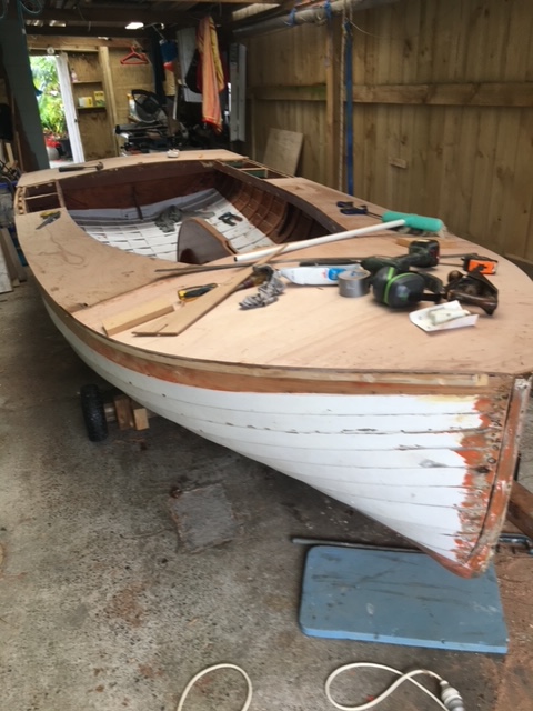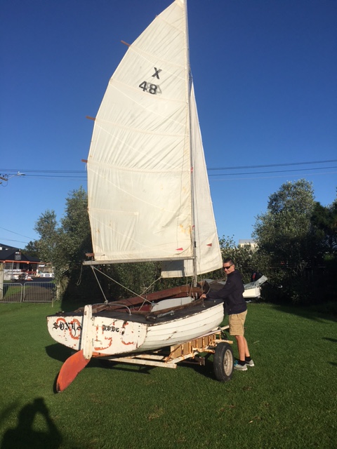 “Restoration of X48, SONYA According to Harrold Kidd, SONYA was built by Trot Willetts, in 1946, for the Elliot brothers. Greg Elliott says the B /W photo from the Auckland Star, shows his father, Mervyn, at the helm of SONYA in a race off ST Mary’s Bay. I took possession of SONYA two years ago. She had been sitting on a trailer under canvas for the last thirty odd years. Under all the dirt and leaves the hull looked reasonably sound, but the deck was rotten, and she has a sloop rig off a trailer sailer. Looking for something to keep me amused, I decided it was worth a shot at restoring her. First I removed the ply deck, and waterblasted the inside to remove all grime. I then started to scrape off all the old paint inside, and that’s when the rot started to appear. It was either a chainsaw, or persevre. I eventually replace about 20% of the planking, and 60% of the ribs. Also the stern half of the king plank. The centrecase and knees were very agricultural, so I decided to rebuild that too.. I used Yellow Cedar for the planks, and American Oak for the ribs. With the help of Youtube and others I leant the art of using roves, and steam bending timber. I made my own bolts with Silica Bronze rod. [Fosters were a big help] Interestingly, the whole boat was built with no glue, all screws, bolts, roves A sign of the times I suppose. Some of the deck knees and framing are plywood, and still in good condition. Against a lot of advice I glued and filled every plank to plank join inside and out, after removing all the old red lead putty. My theory being that modern glues, Wests, would hold the wood and stop any water egress and swelling. I didnt want to have to go through the “Let it leak and swell” every time I launch the boat.