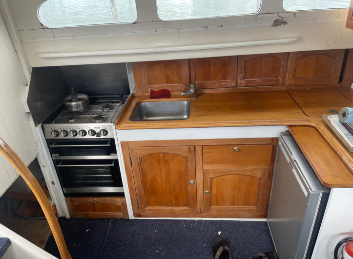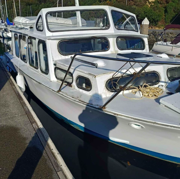 Todays 30’ wooden launch has made a recent appearance on tme – at first glance you would have to assume that a previous owner has been an automotive glazier and had access to low cost windows. There is a lot of glass action going on. Forward motion is via a BMC Commander diesel engine.