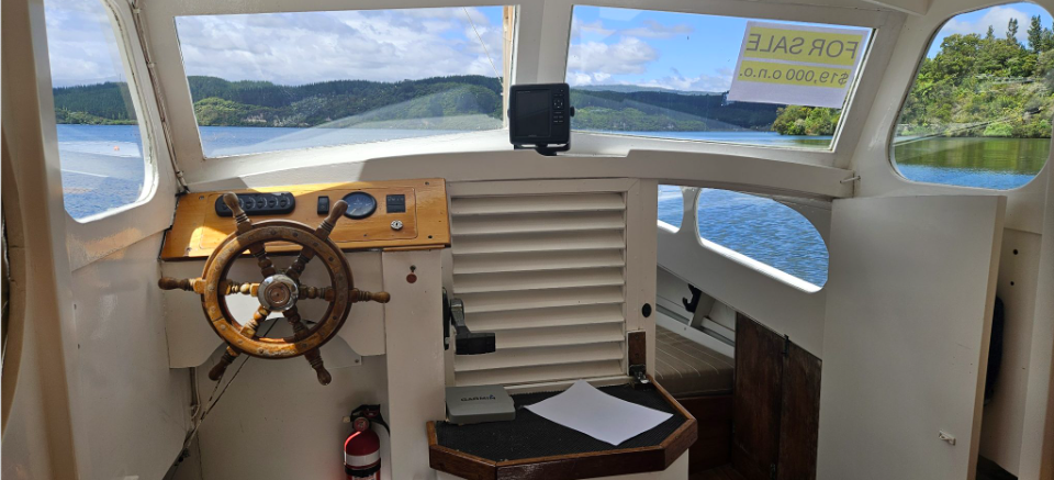 Powered by a 30hp Lister – Petter 3 cyl. diesel engine, she cruises at 7.5 knots, a very stately speed for her home – Lake Rotoiti (Nth Is.)
