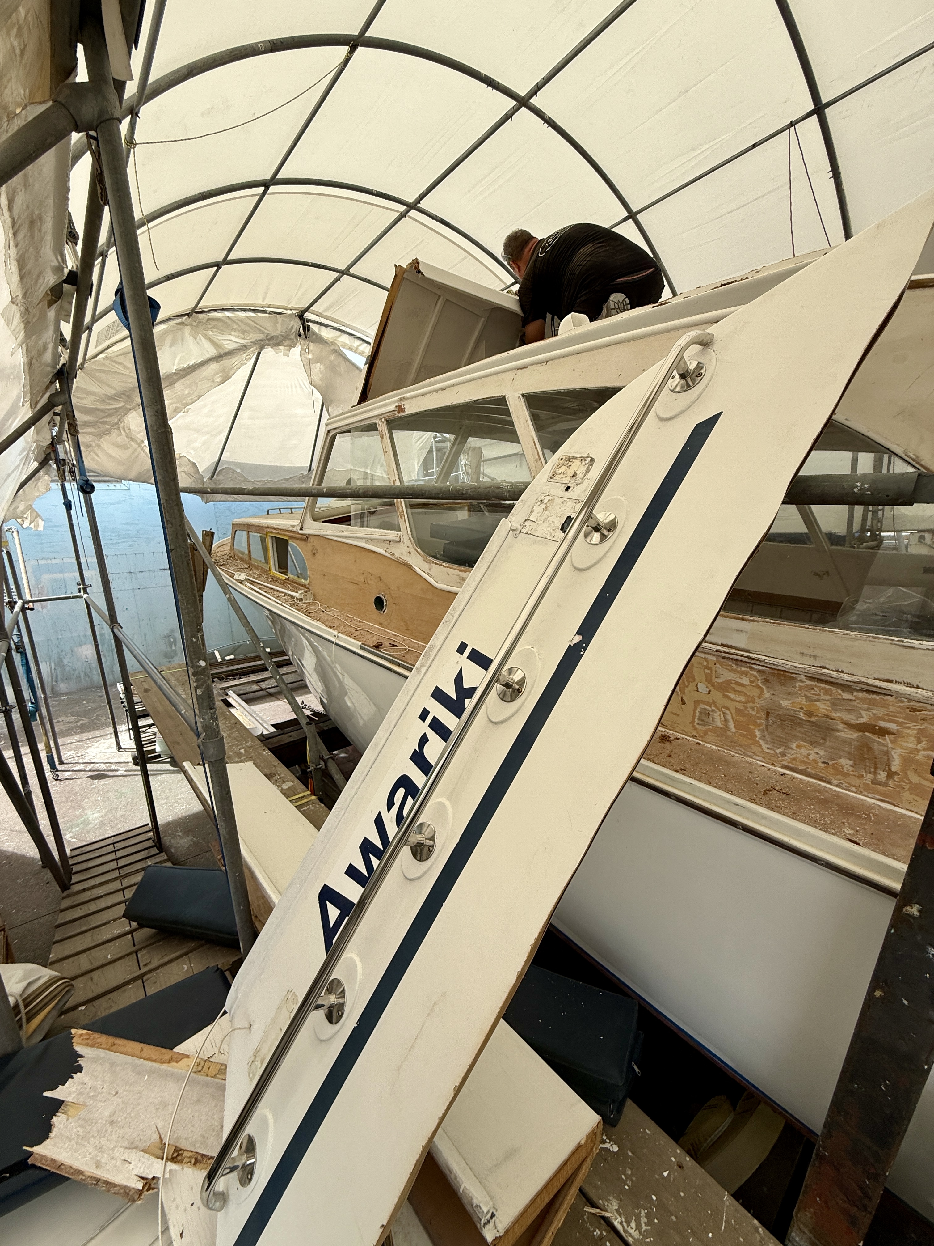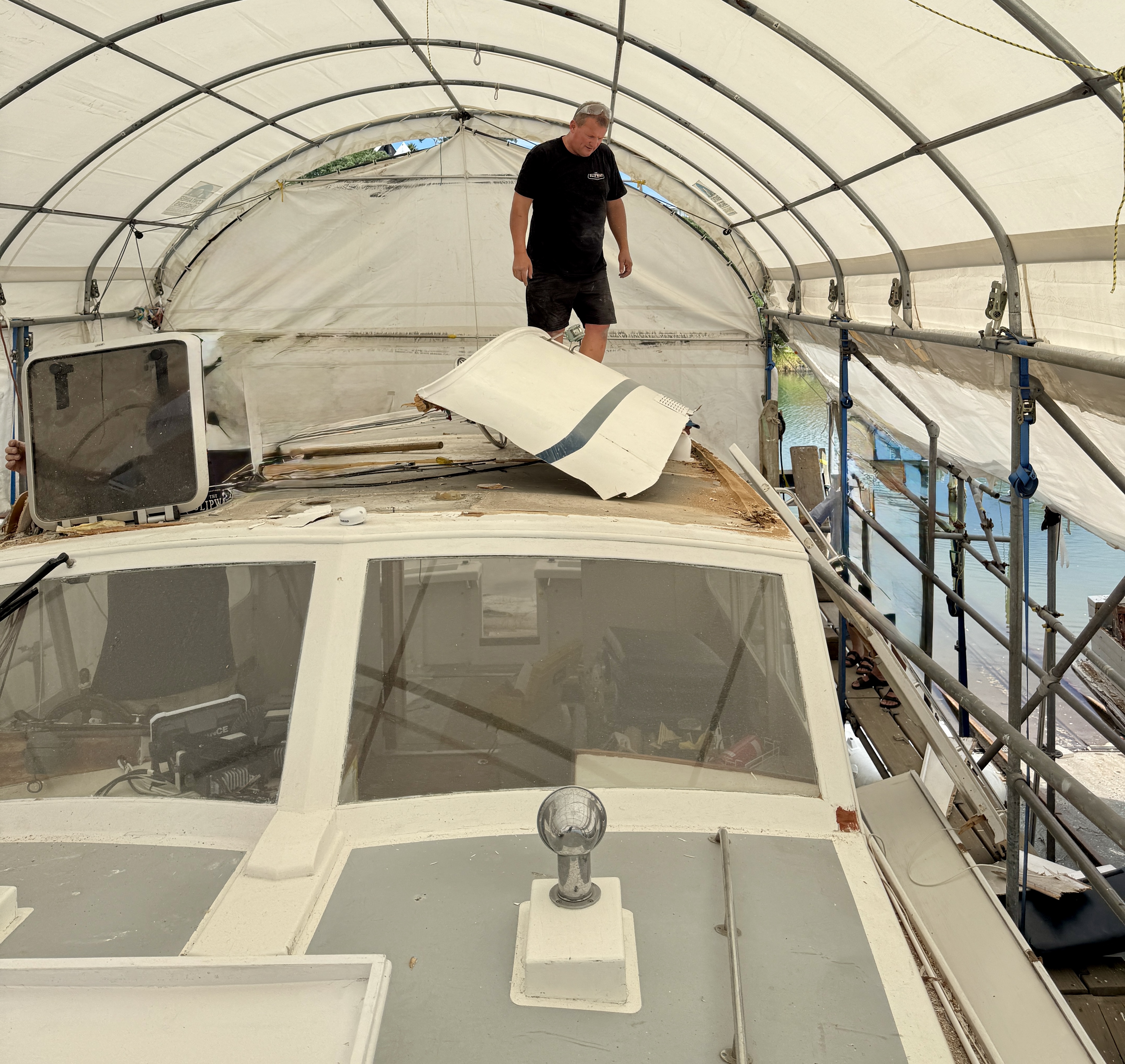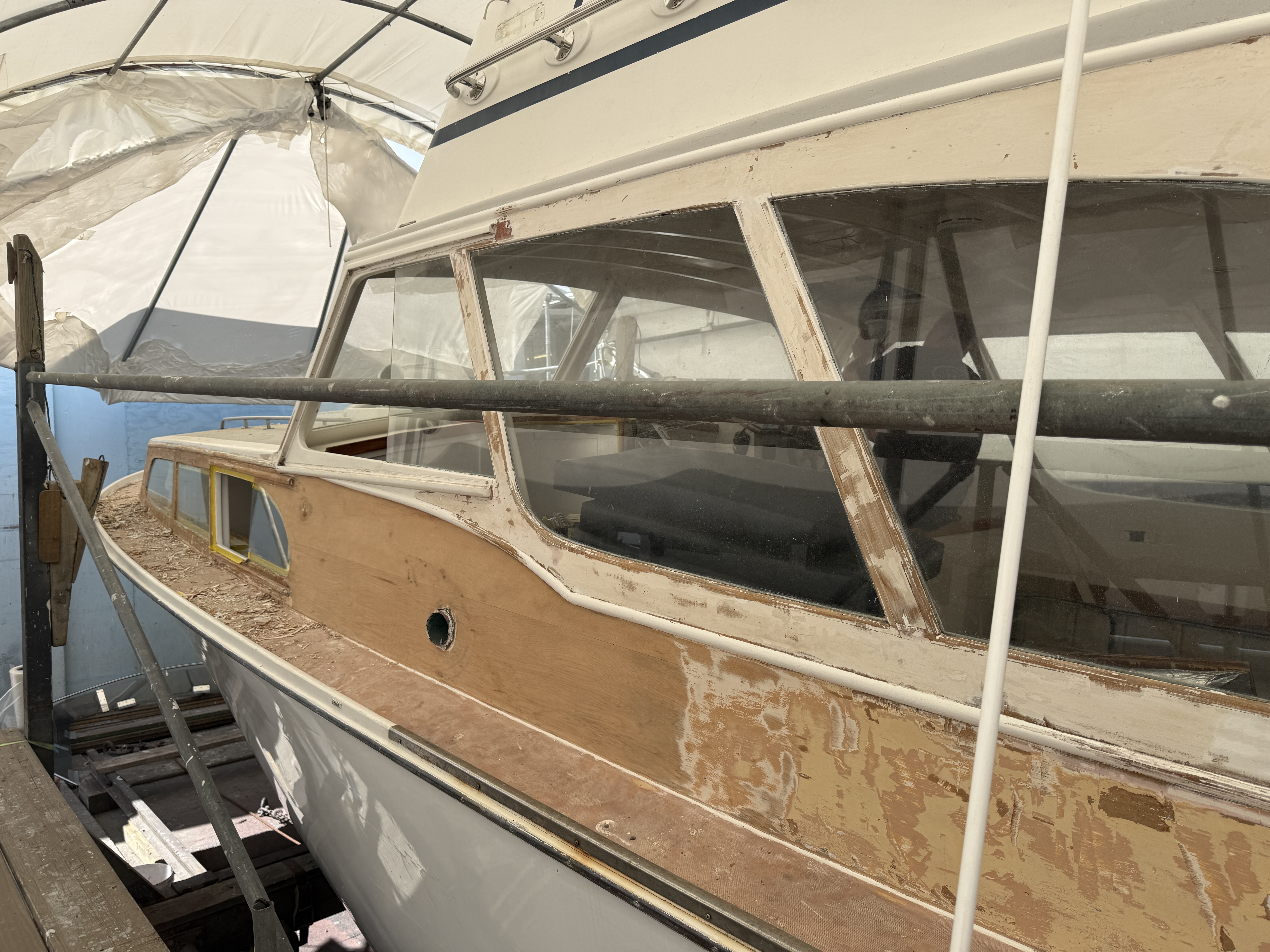 So flybridge gone, bow rail removed, coamings to be returned to vanish, new upholstery and some differed maintenance righted and she will be a ’new’ boat.