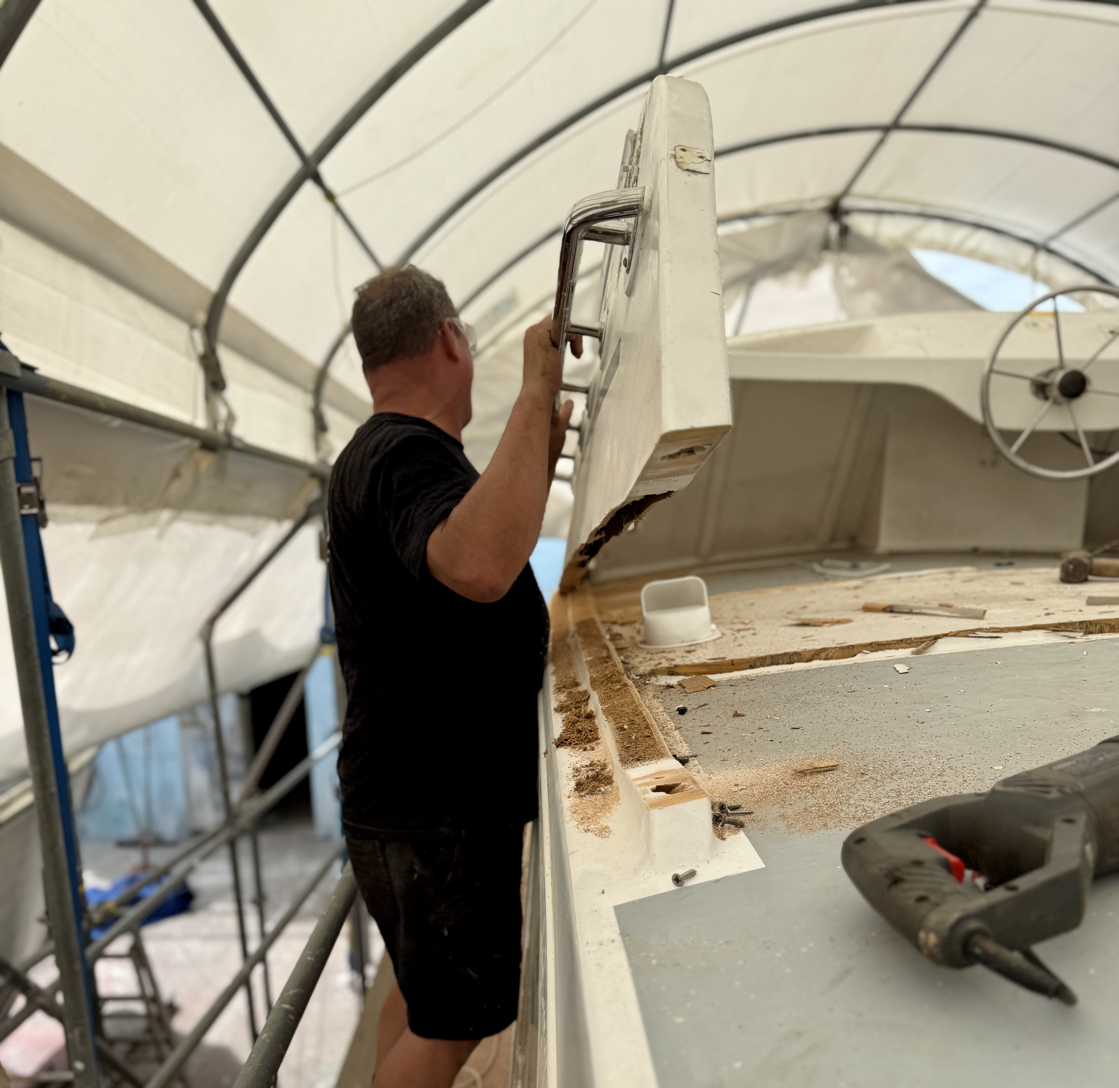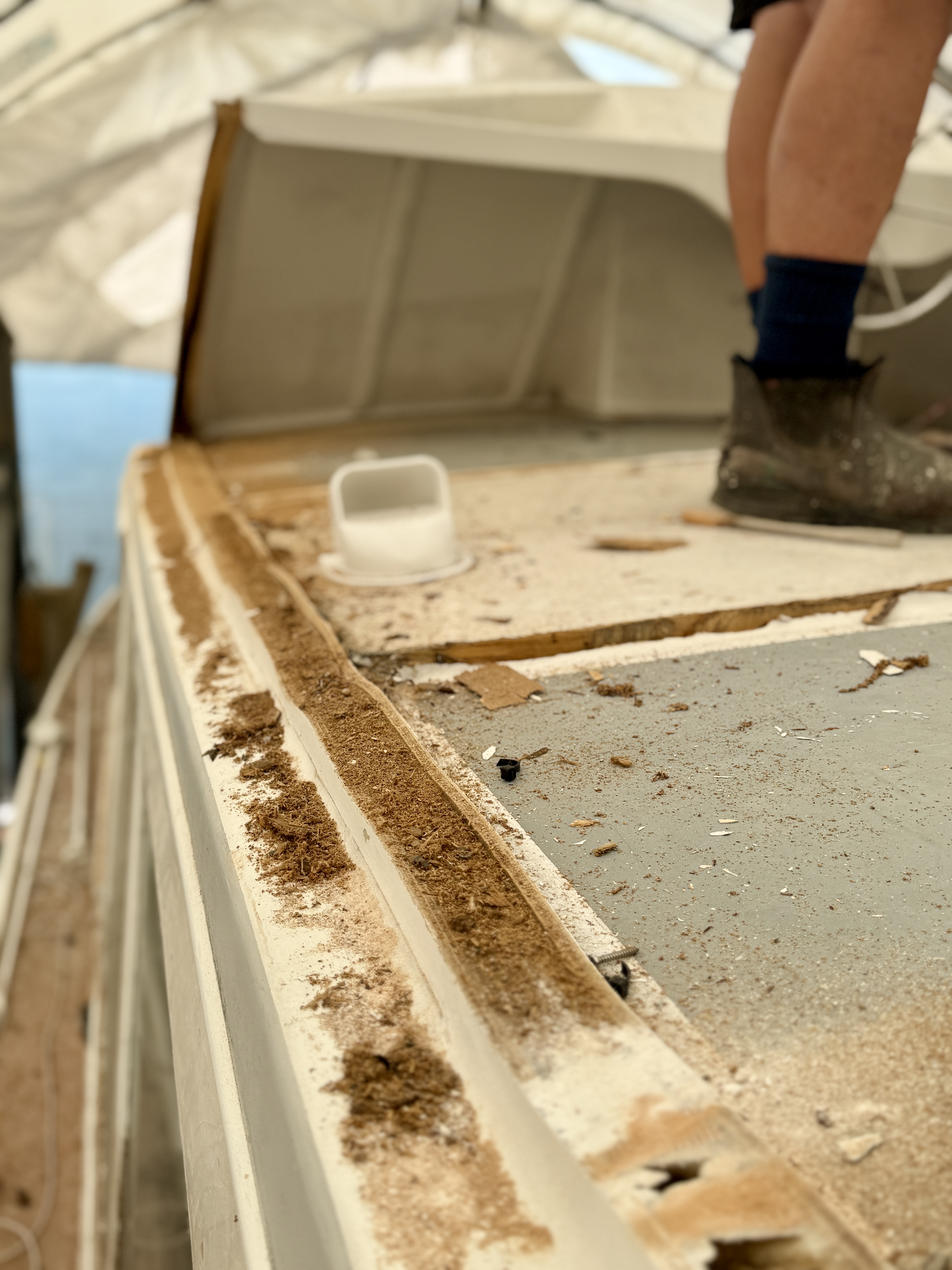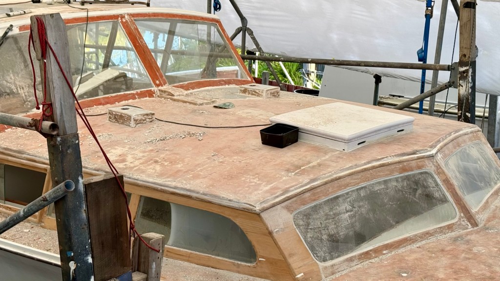 So flybridge gone, bow rail removed, coamings to be returned to vanish, new upholstery and some differed maintenance righted and she will be a ’new’ boat.