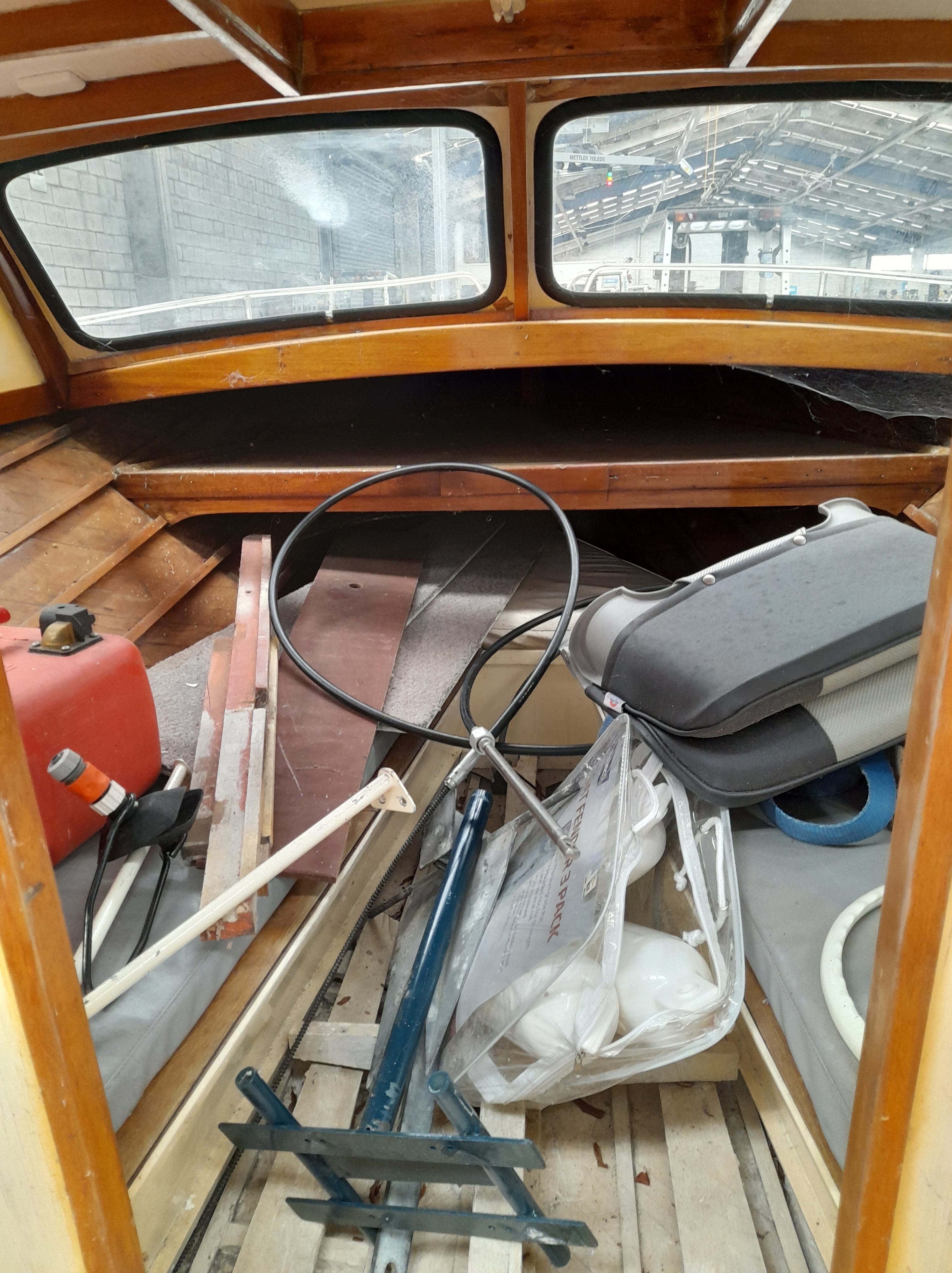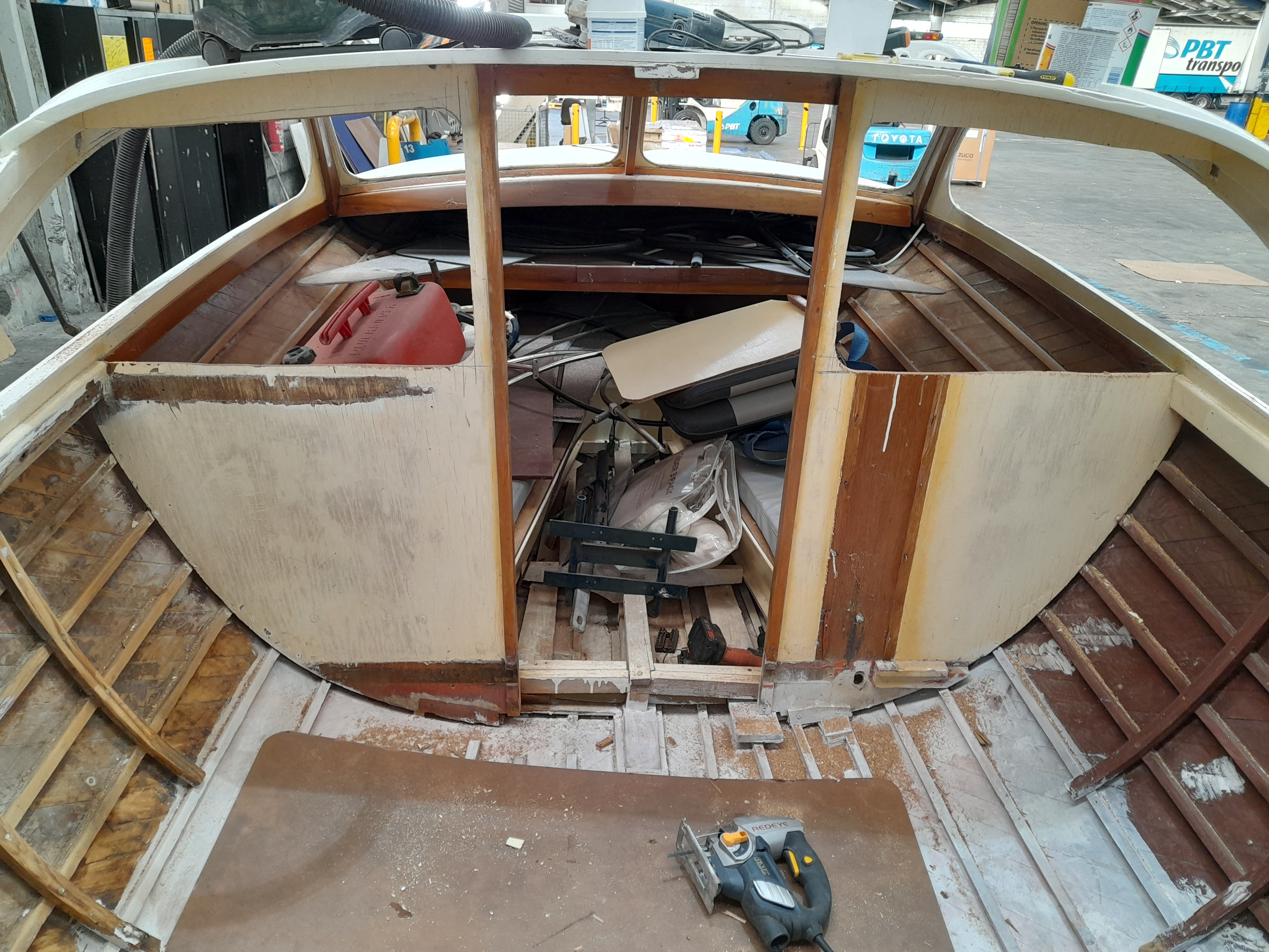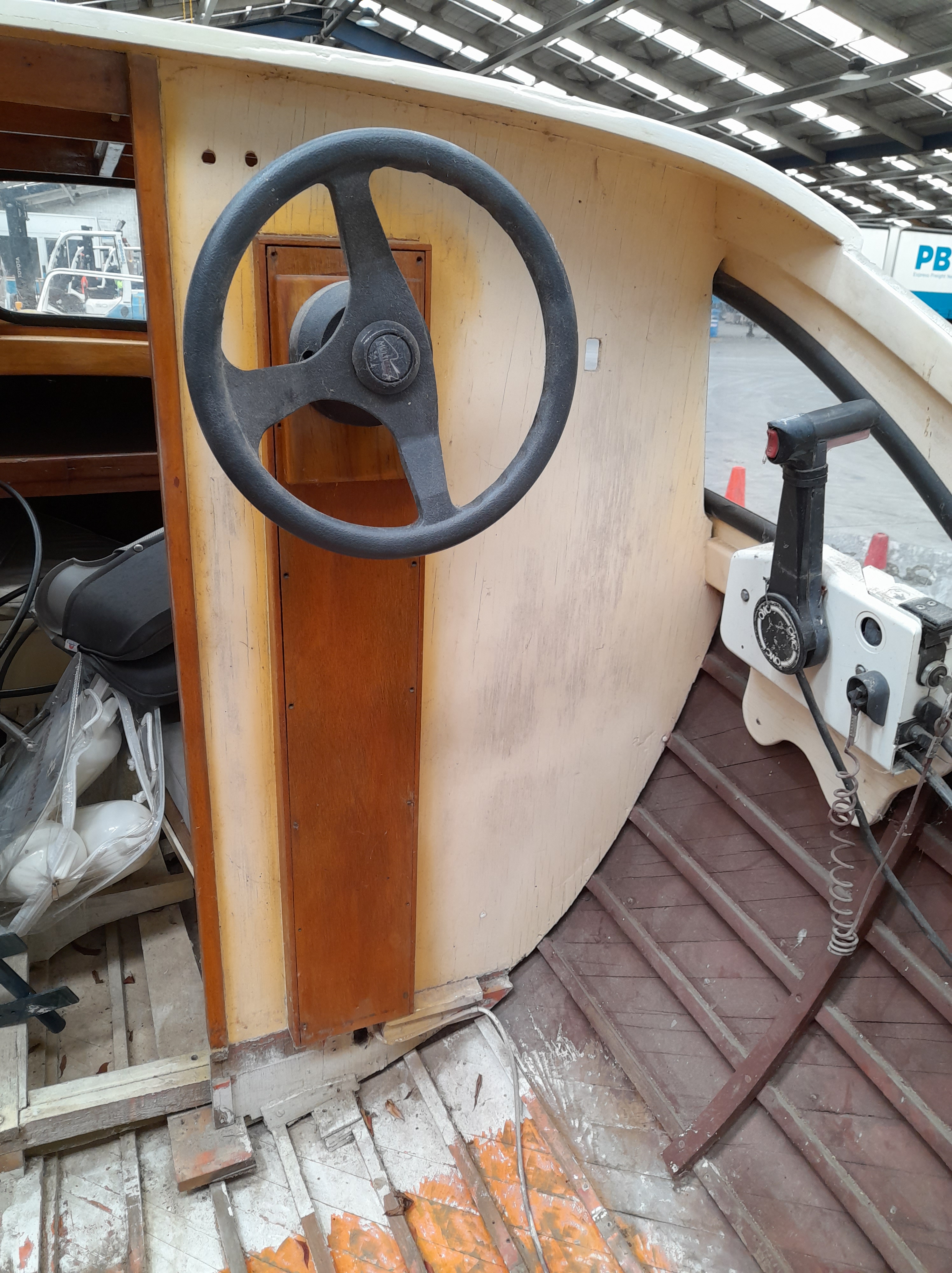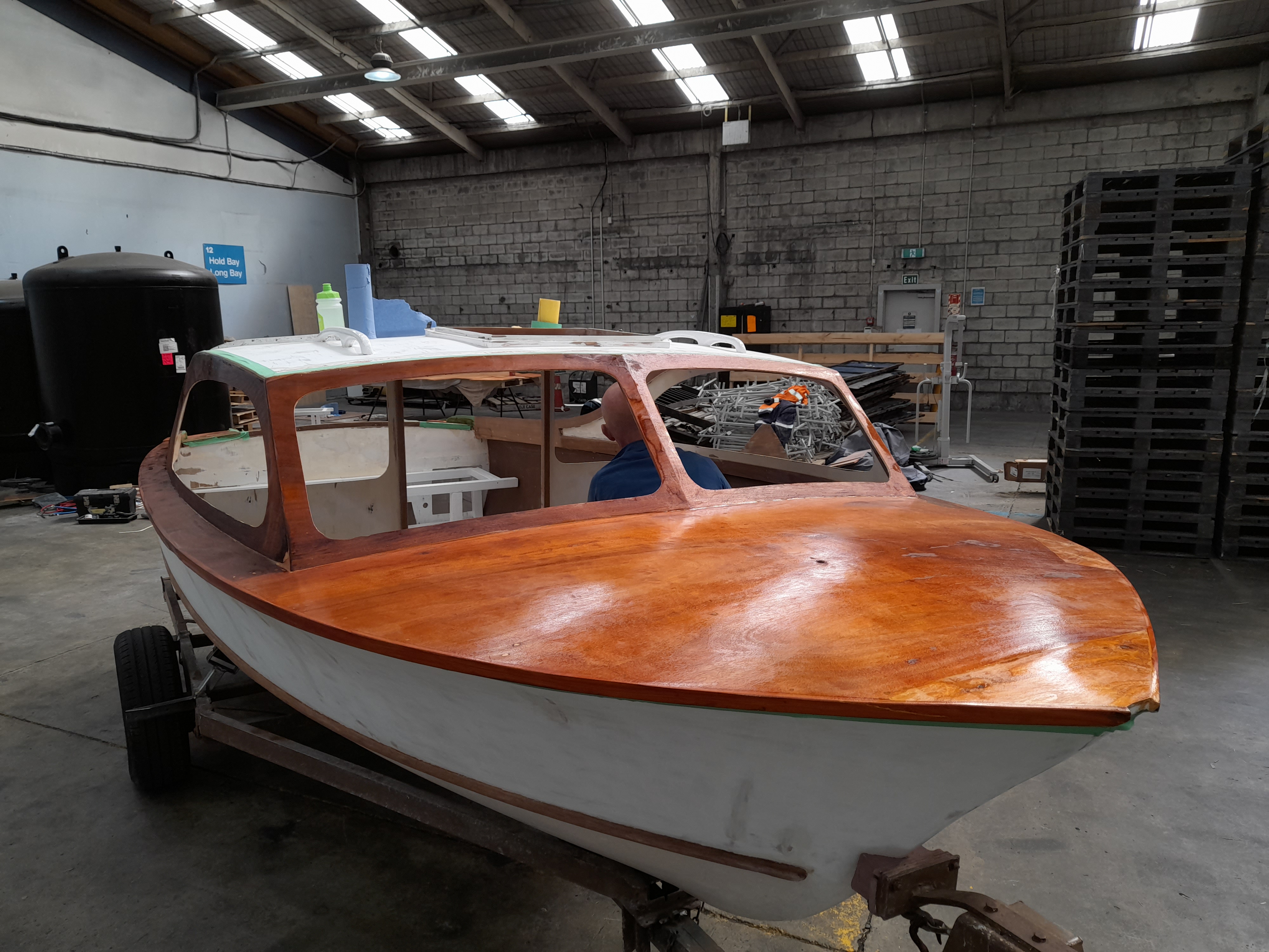It’s not a boat builder quality job but a labour of love with a hard timeline and a fantastic learning curve assisted by the professional English and American wooden boat builders on youtube. It’s all International Yacht Paint products, 5 coats of colour on the hull and roof + 1 coat of varnish and every other varnished surface has 8 coats of Gold Spar original. At some stage in her past life she was converted to outboard power.