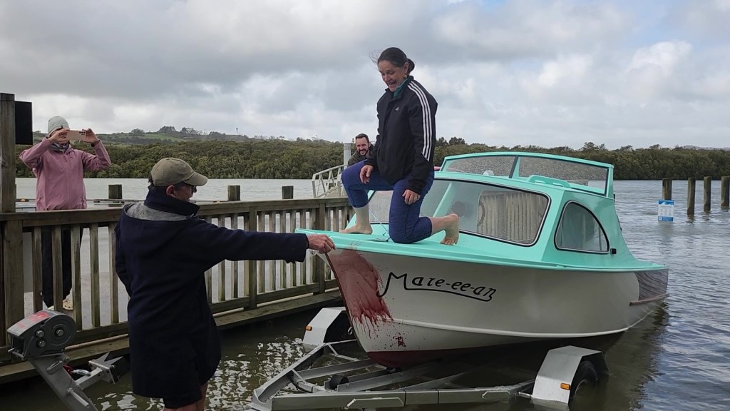“The boat was in pretty good condition other than needing a new transom and the top windscreen being constructed as at some time it had been taken off and replaced with a curved perspex one. The plans WW found for us came in handy for this. The boat was refurbished in 2023/24 and re-launched back into the Kaipara 60 years to the day after it first being launched.The two black and white photos are of her when she was in the Epiglass 40 regatta in late 60s. The photo with the 1970 Atlantic 100 sticker is it in this race. (For the 100 miler race Bryan McLeod (Tim’s father) needed to have a number in the 100s, so he just stuck some black masking tape either side if the number 8 for the 40 miler to turn it to number 181.) The older photo of it in front of the house with Bryan and his daughter is with them holding the trophies from these races. (Economy Class). The remainder of the photos are on the day of the re-launch into the Kaipara River.”