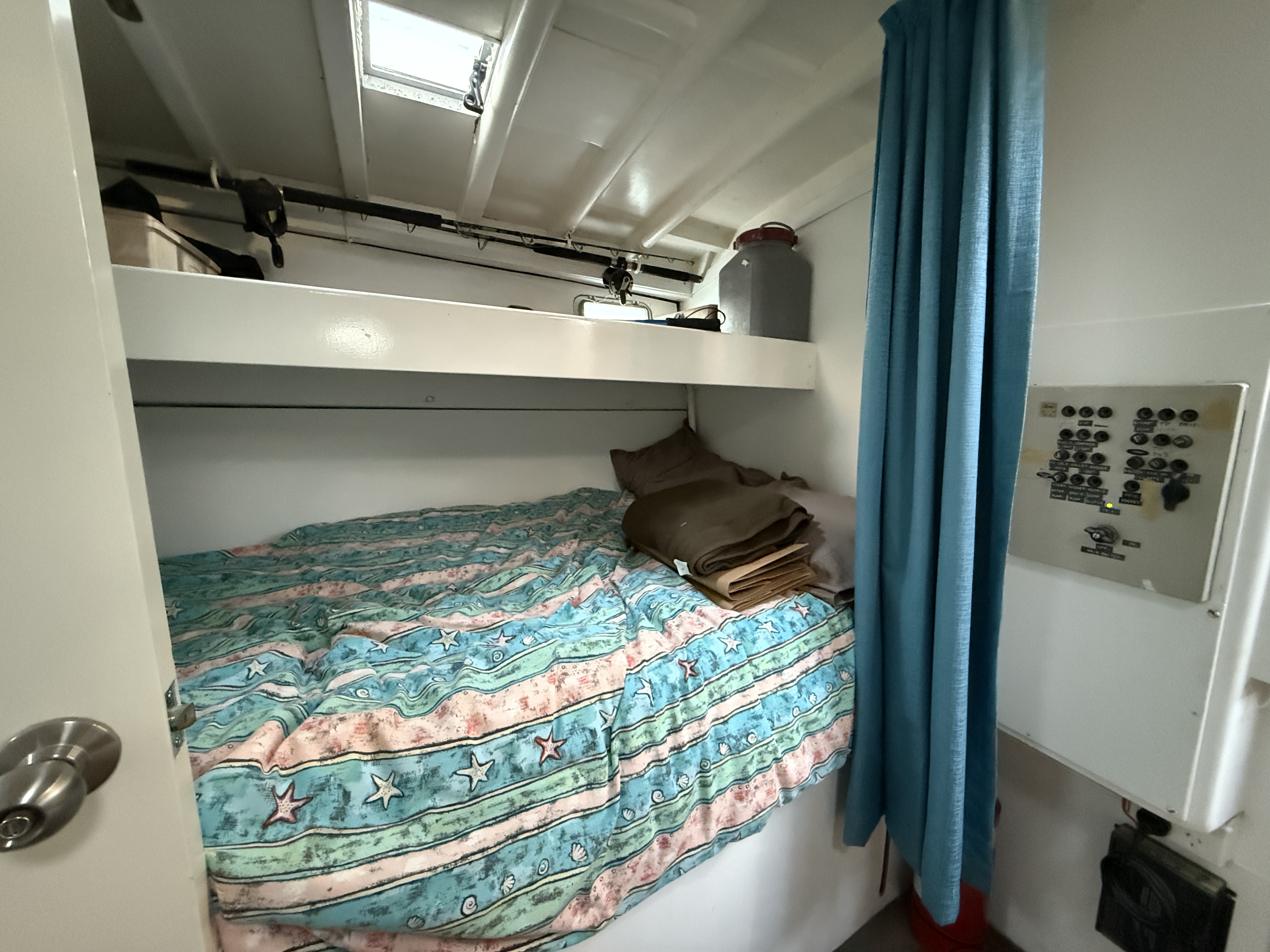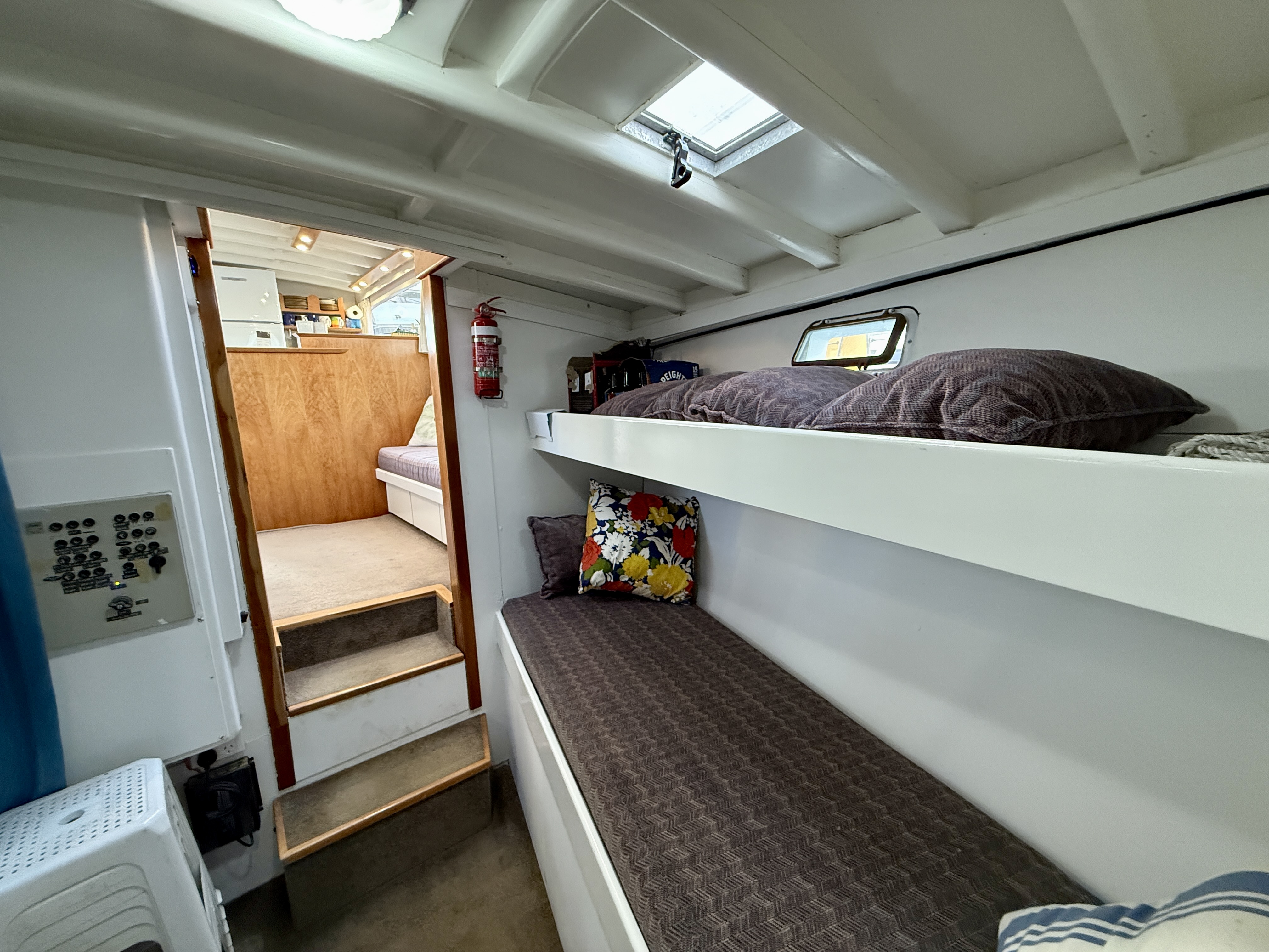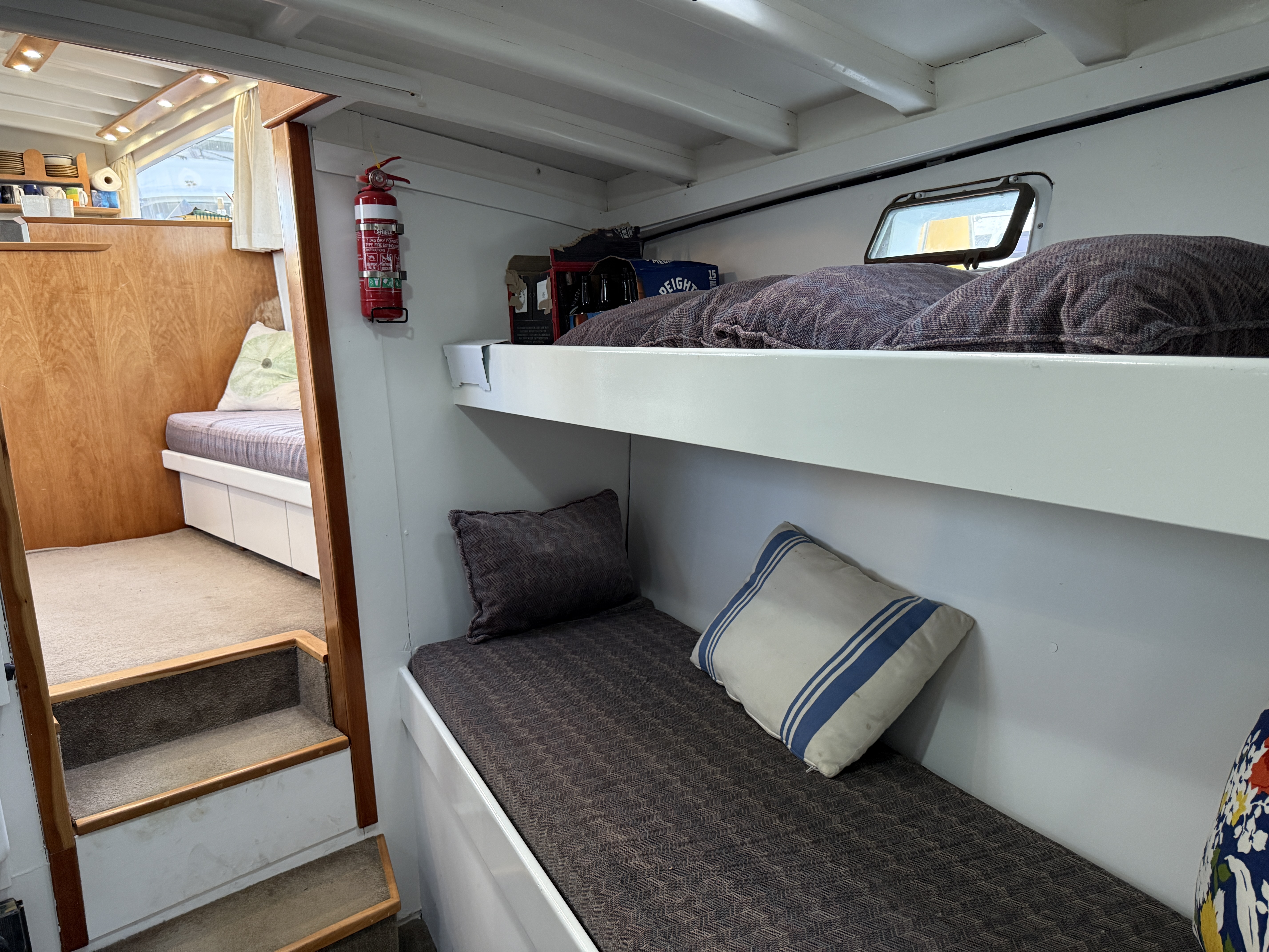 Some specs – 42’ when launched (now approx. 45’) she has a 12’6” beam and is constructed via carvel planking, and is powered by a Ford 135hp diesel engine.Sleeps 8 (2x double berth cabins) + exterior shower / head.