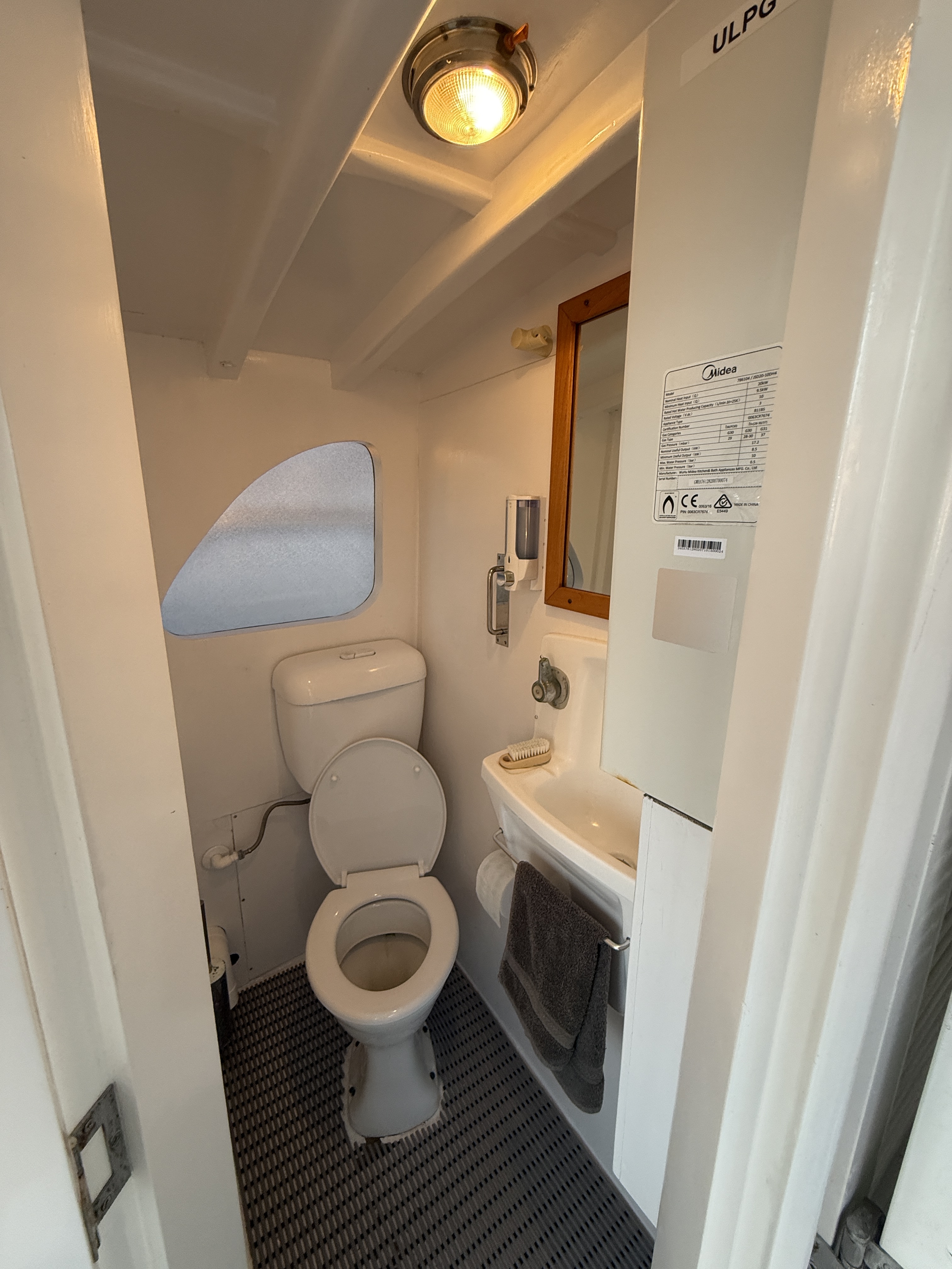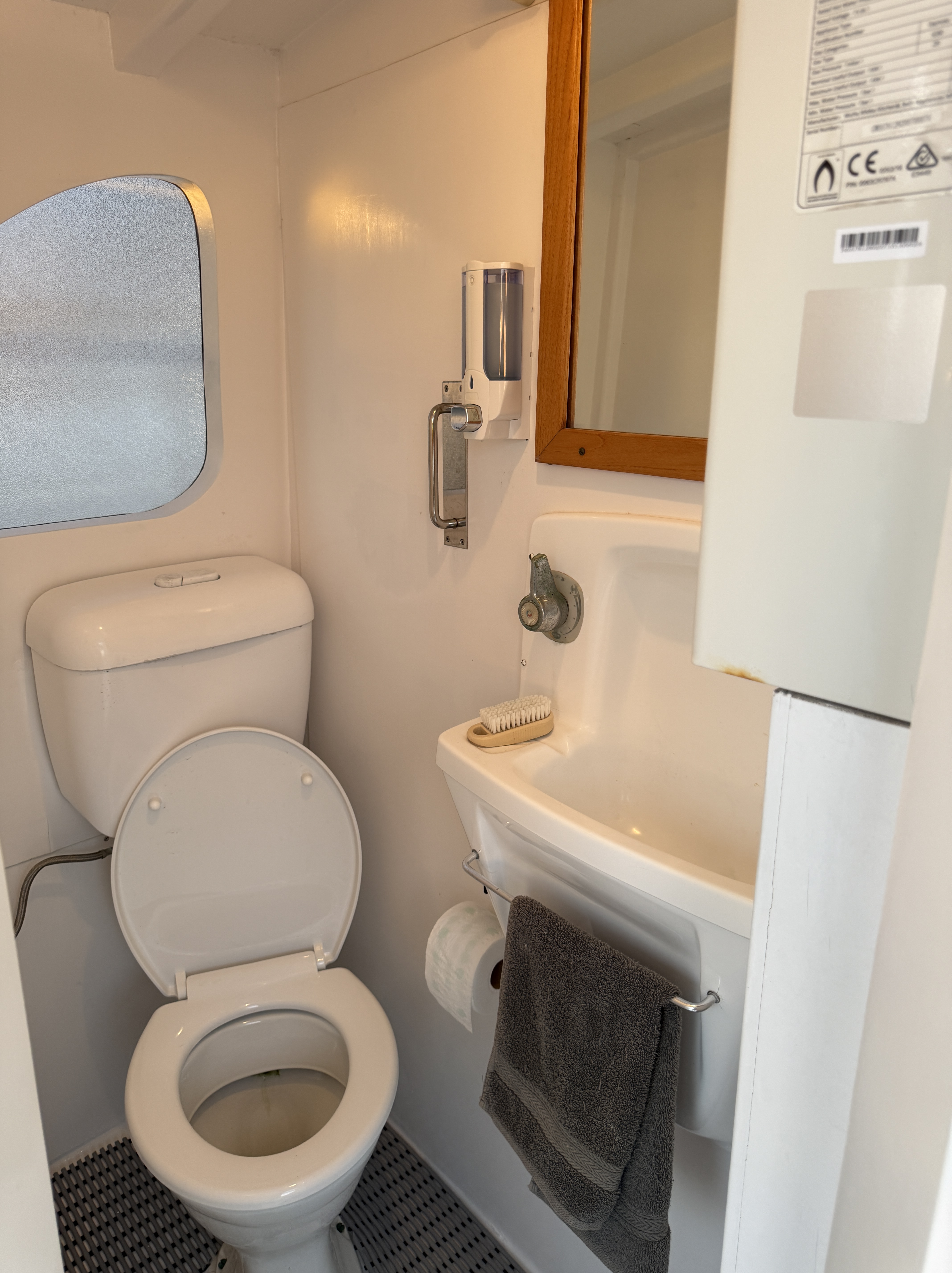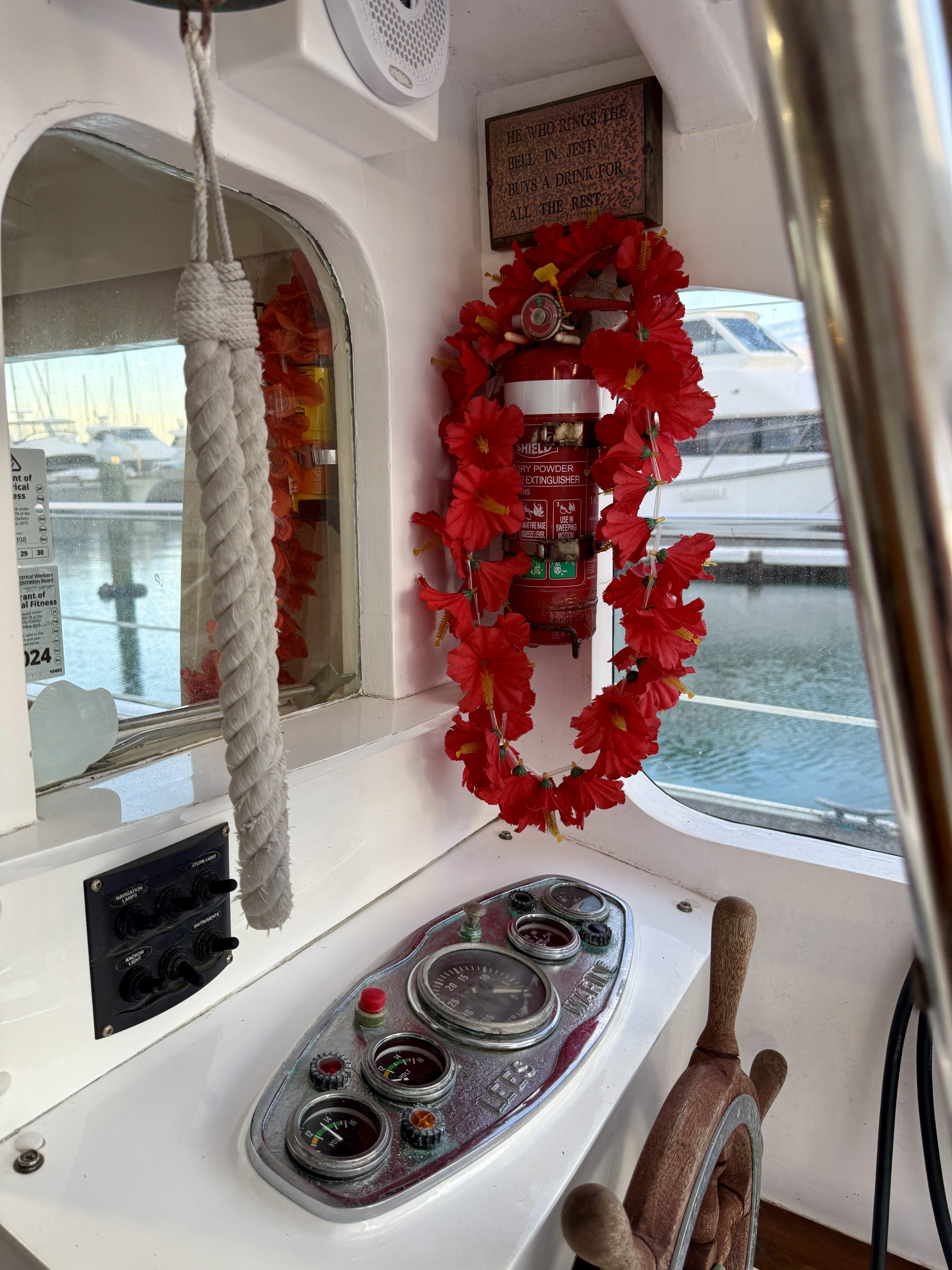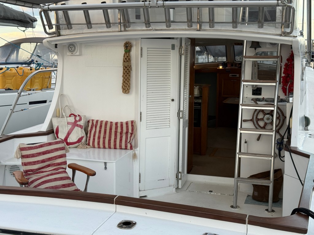 Some specs – 42’ when launched (now approx. 45’) she has a 12’6” beam and is constructed via carvel planking, and is powered by a Ford 135hp diesel engine.Sleeps 8 (2x double berth cabins) + exterior shower / head.