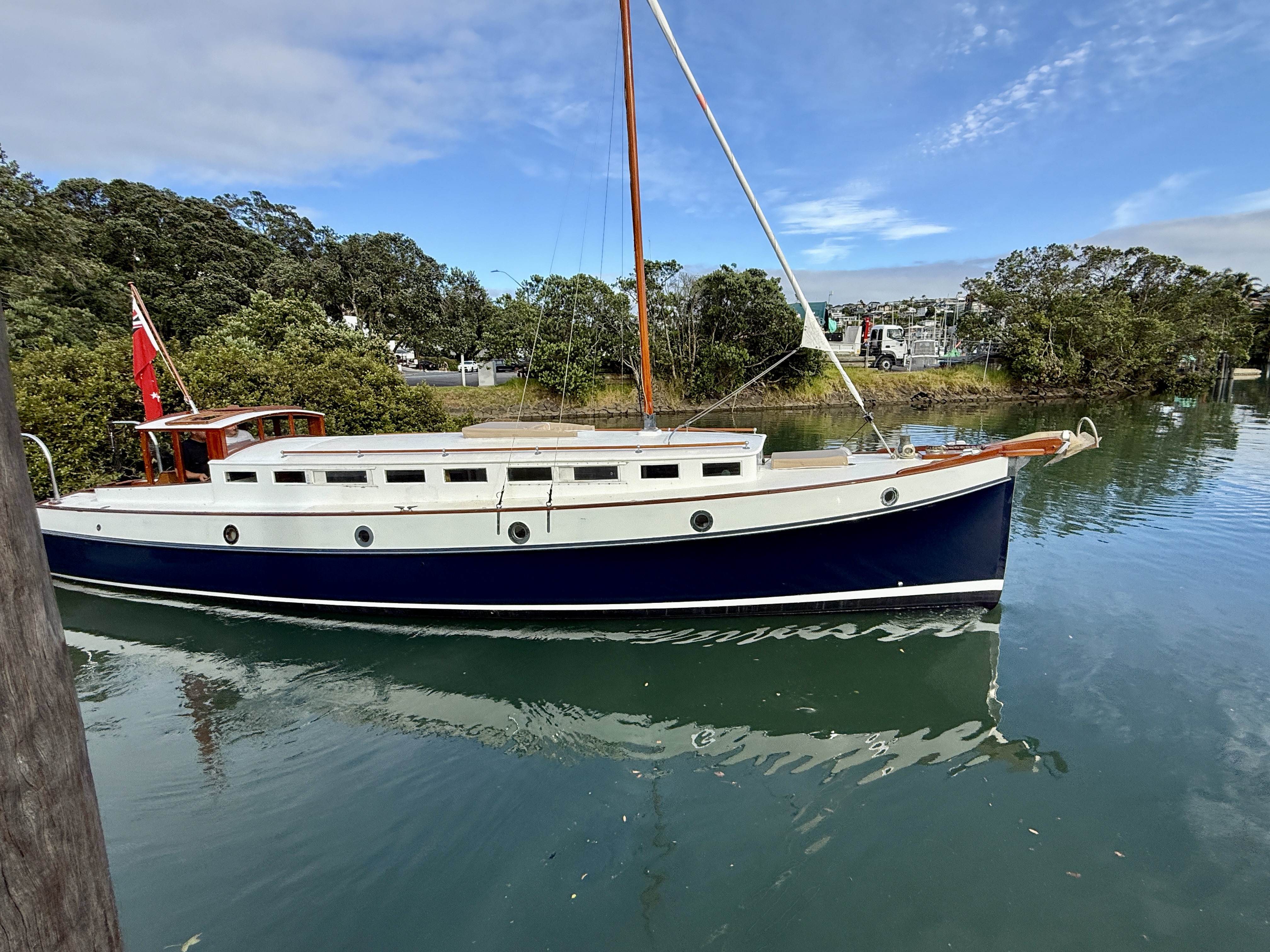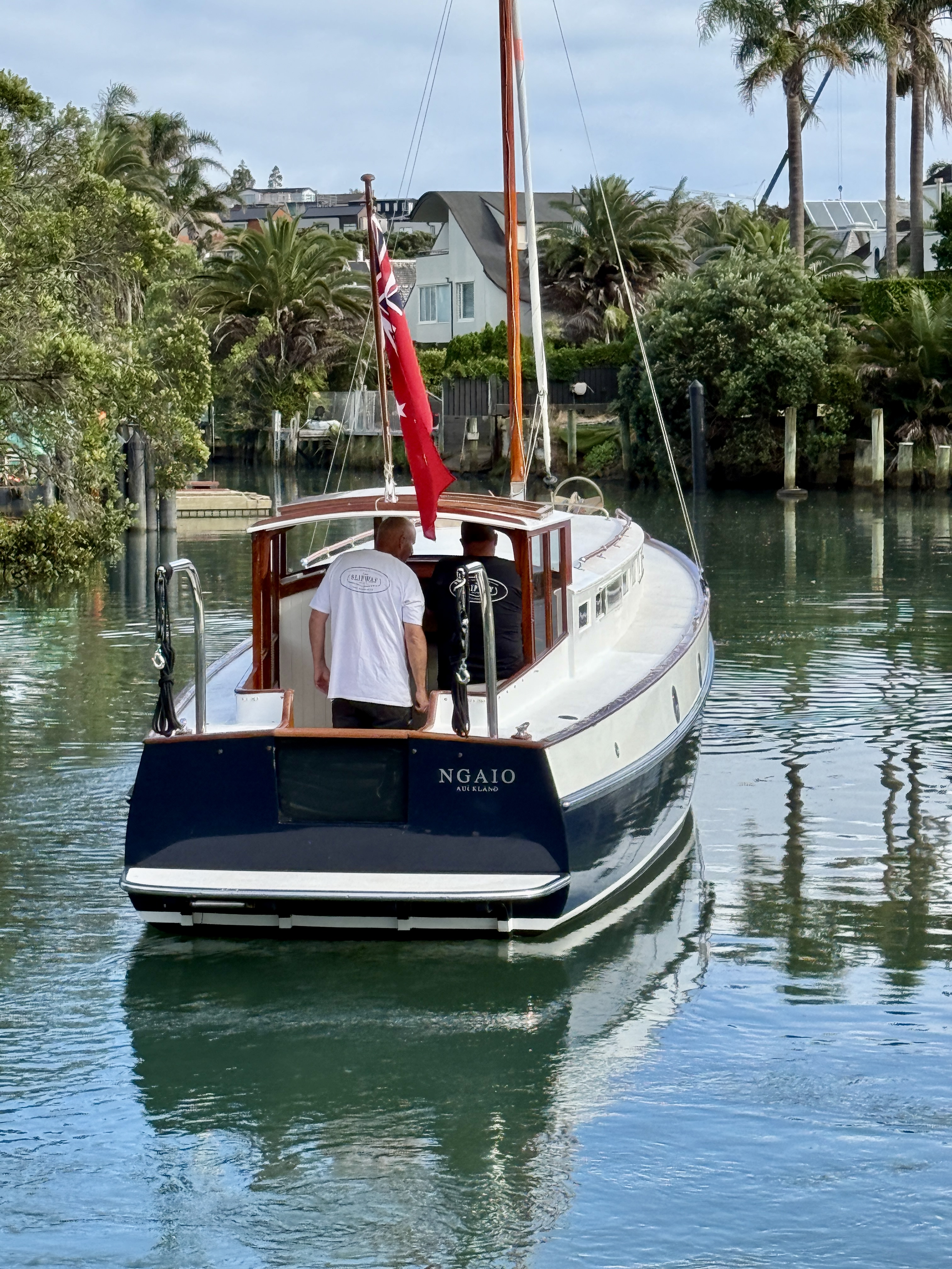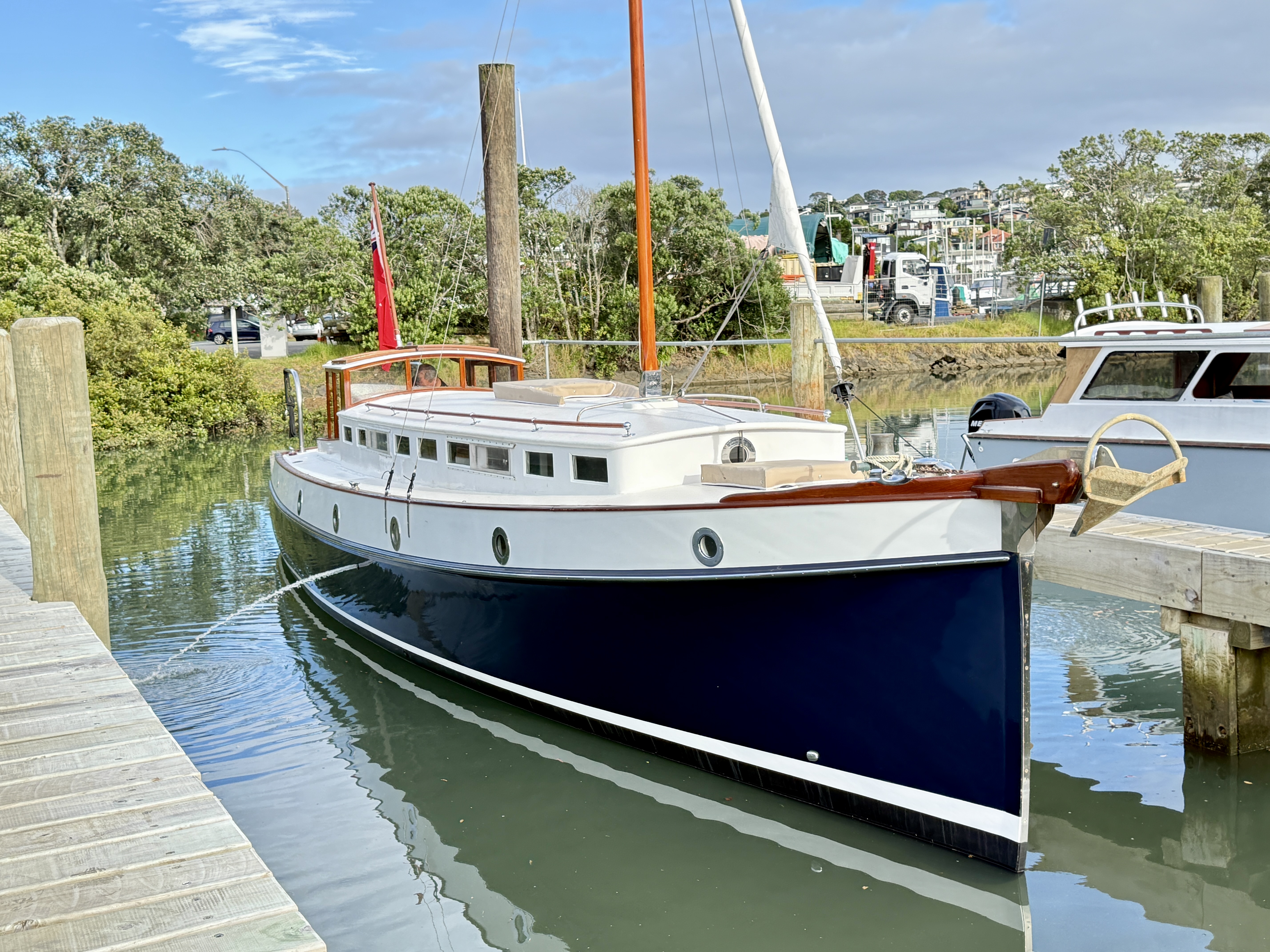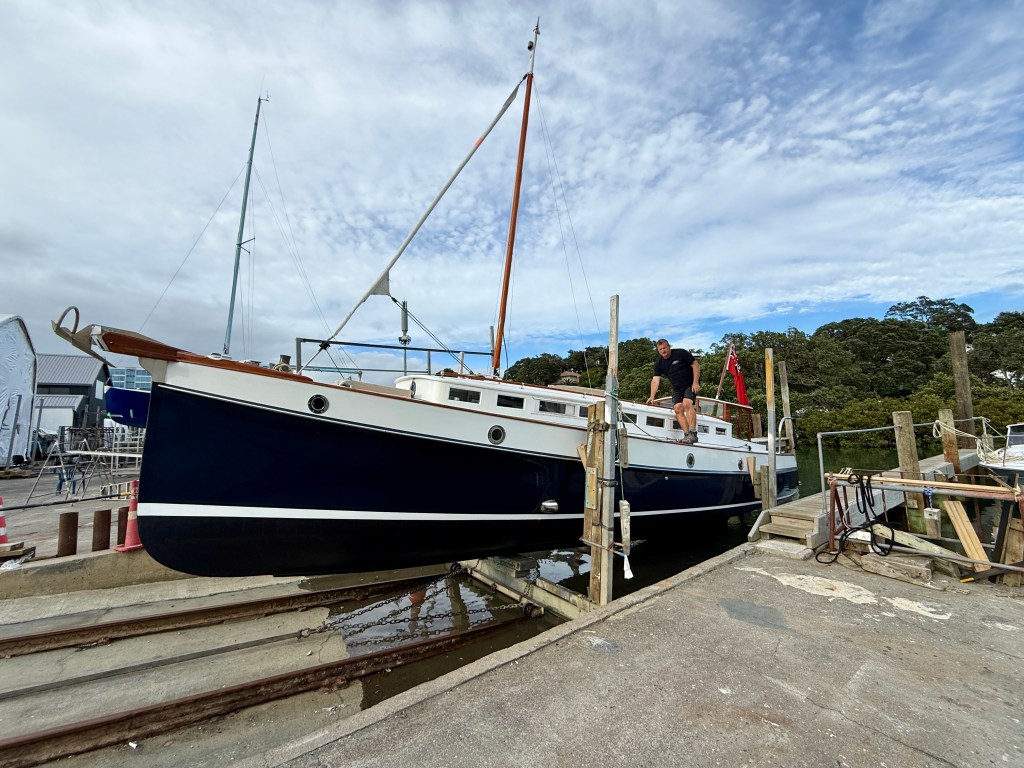 Yesterday she slipped back into the water at Milford Creek, Auckland after a 4+ month refit at the hands of master boat builder Paul Tingey .